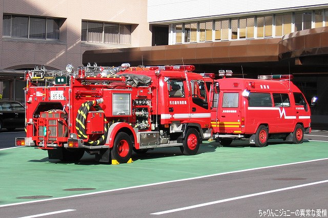 病院に消防車の勢揃い? 子供達への展示という感じではなさそうですね。