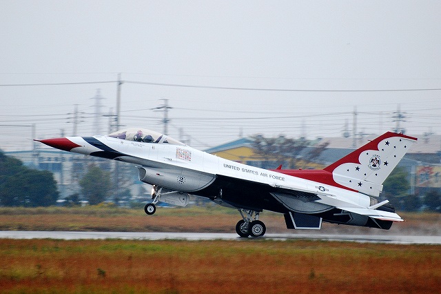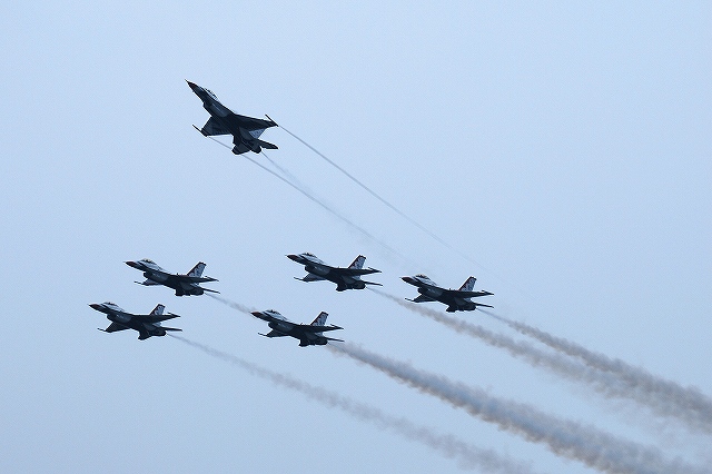 …と言う事で、今回はサンダーバーズの曲技飛行です。 (左)離陸を前に最終チェックやピン抜きのため滑走路端に揃った各機。 一瞬スモークテストも行われた。 (中・右)メイン編隊の4機が離陸 エアインテイク横のポジションナンバーのうち、5号機の物は上下逆に書かれている。 (左)断続的に降り続く雨のため、ブルーインパルスで言う所の4区分~フライバイ…な感じの演技を実施。 それでも戦闘機故にその演技はスピーティーかつダイナミックだった。 (右)余裕をこいてるのか(^。^;)微妙にカメラ目線の5号機 プラモデルと違ってひっくり返す訳には行かないだろうから、下面の塗装は大変だろうなー(^。^;) (左)…てな事を思っているうちに、微妙に緩い編隊にて微妙に高い高度を飛び始める。どうやら視程が悪くなったため演技を中断していたようで、そのうち雲の上に出てしまったのか姿すら見えなくなってしまう。 これはダメかも判らんねー (中)…と思ったら、いきなりバック to バック(とは今は言わないカモ?)から演技再開。 (右)引き起こす6号機 (左・中)演技後半はフライバイ(航過飛行)的な科目が多かったが、(予行はともかくとして)雨で展示飛行自体がキャンセルされた前回の浜松訪問時と比べたら、飛んでくれただけでも充分。 (右)6機のデルタ編隊から1機ずつ上昇して離脱する科目。 先ほどのはブルーインパルスのローリングコンバットピッチ的な科目だったらしく、この後に着陸。 流石に南側の誘導路は使用しなかった。 つづく。 PR