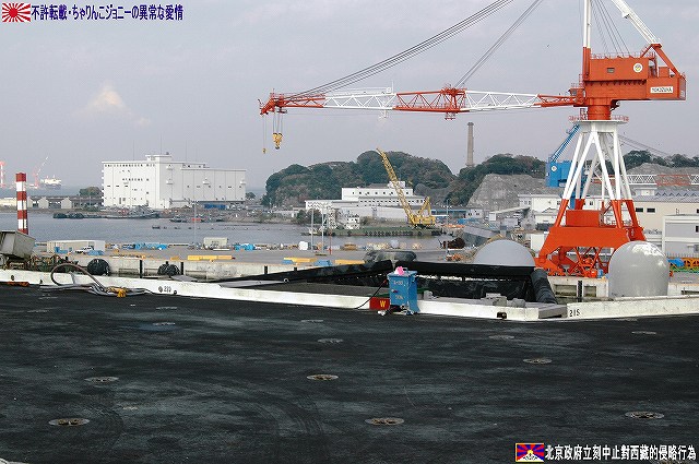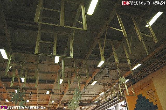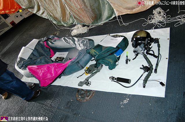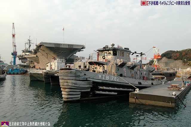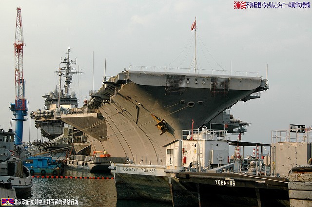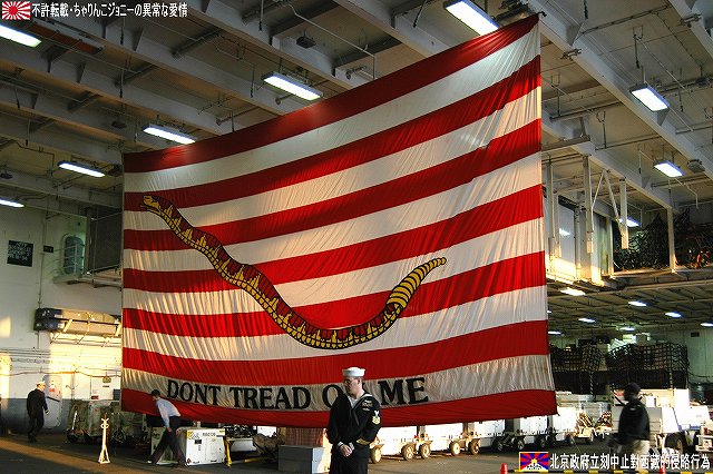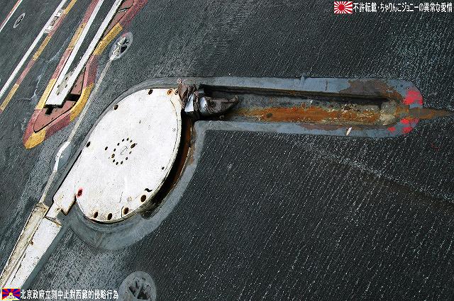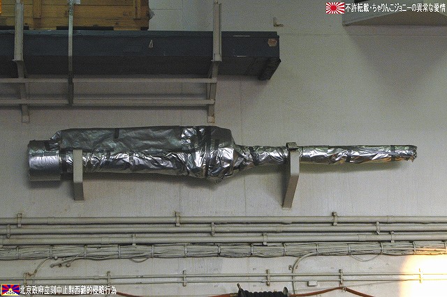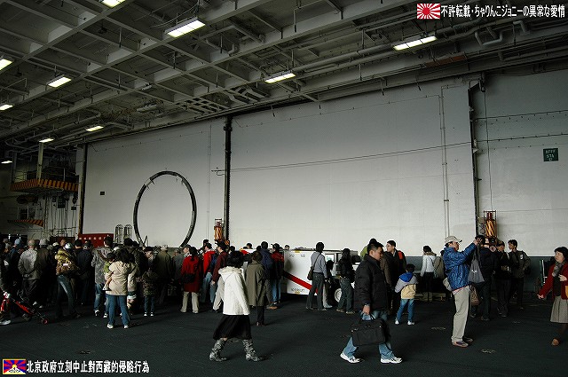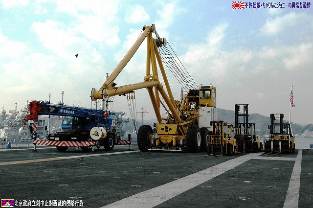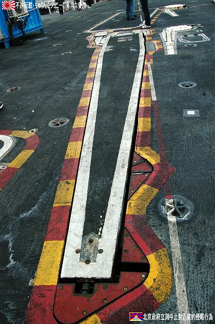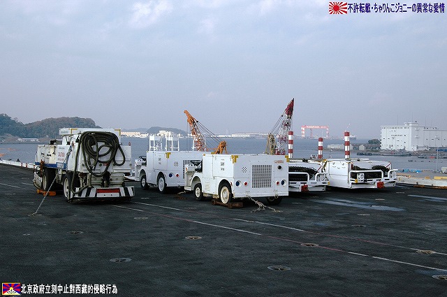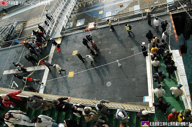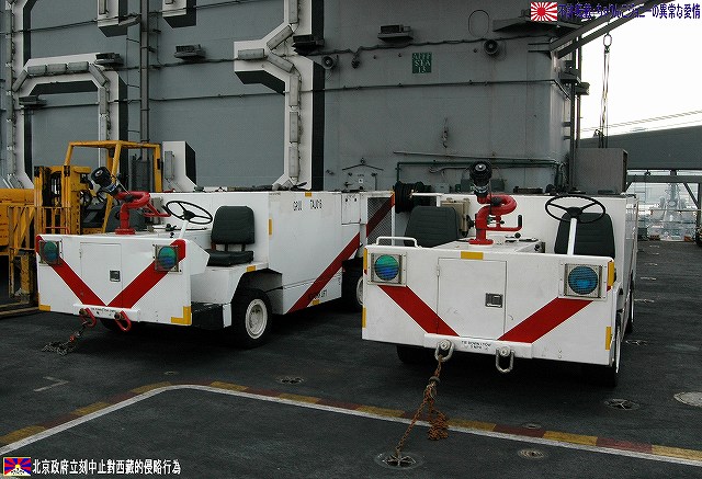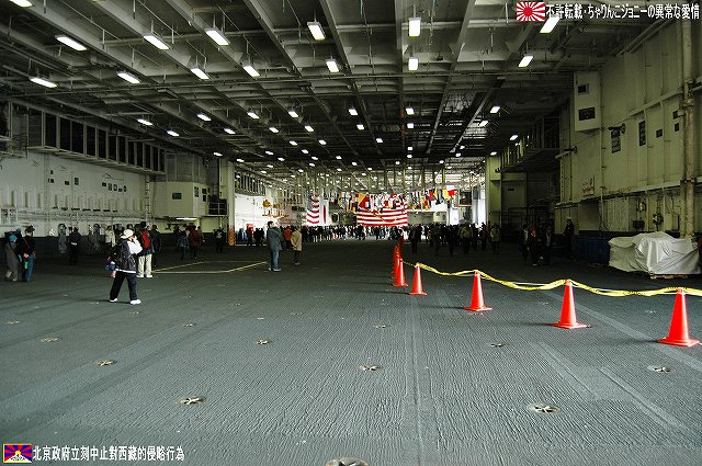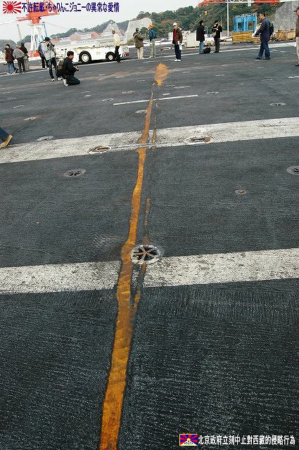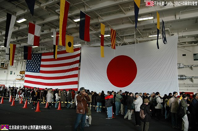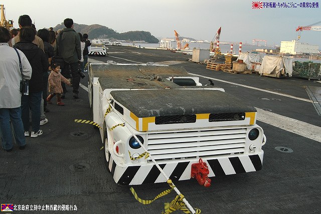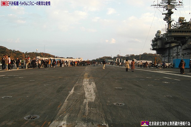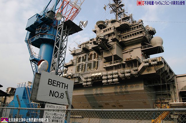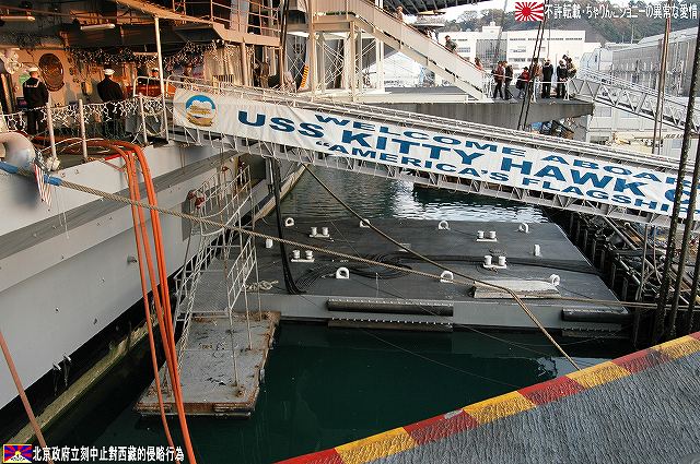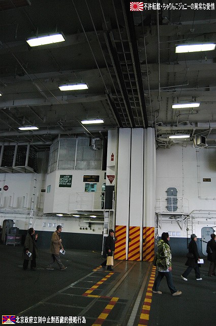 着艦エリアは「アングルドデッキ」と呼ばれ、やや斜め方向を向いて設置されている。 これはにより着艦と発艦を同時に実施する事が出来。また、万が一航空機が着艦に失敗しても艦前方に置かれた航空機などに衝突する事はなく、そのまま再上昇する事が出来る。 ただし、艦の進行方向に対し斜めに設けられた着艦エリアは、当然ながら艦の進行に伴って移動し続けるので、着艦の難易度はあがってしまう。 着艦エリアのセンターラインには無数のタイヤ痕が残り、着艦フックやタイヤ、それにアレスティングケーブル等により激しく擦られた続けた結果、飛行甲板の「舗装」が剥れてしまっている箇所も見受けられ、空母への着艦が「コントロールされた墜落」と言われる所以を垣間見たような気がした。 (左)アレスティングワイヤの基部。ワイヤは油圧式の制動装置に繋がっているのだが、肝心のワイヤは整備の為か取り外されていた。 各拘束ワイヤは12m間隔で4本張られ、失速ギリギリの速度(約257km/h程)で進入した艦載機は、それらのうち1本(通常は3本目)を艦載機の尾部に設けられたアレスティングフックにて捉えると、約90mの制動距離にて航空機は停止する。 また艦載機は、ワイヤを捕らえ損ねた場合に備え、脚が甲板に着くと同時にエンジンを全開にし再上昇に備える。 (右)何らかの理由でフックによる着艦が不可能な場合は、クラッシュバリアを立てて収容する。 写真はバリアの支柱。 (左)フックに引っ掛けられたアレスティングワイヤが弾む位置なのだろうか、甲板の一部にゴム製のガードが設置された居た。 そしてその表面には無数の傷が…。 (中)アレスティングワイヤが張られている辺りはの甲板の舗装は剥れ、下の鋼板が錆びてしまっている。 (右)着艦する艦載機を最終的に誘導する着艦信号士官(LSO)の立ち位置付近。 甲板に置かれた(補修作業用の?)青いボックスの向こう側に一部が見える黒いカゴ状のものは、万一艦載機が突っ込んできた場合の退避場所。 降ろす側も下ろさせる側もハードな仕事なのである。 艦上で使用する各種車両。 基本的に低く小さく作られている。 (左)消防車。ボンネット部分に放水ノズルがついている。 (右)牽引車(多分)。人などを乗せるためか、車体上部に甲板と同様ざらざらのコーティングが施されていた。 (左)画面左の車両は甲板清掃用のものみたい。 小さなゴミでもジェットエンジンに吸い込めば大事故を引き起こす事も考えられる。 (右)フォークリフトやクレーン車など。巨大なクレーン車は航空機の事故の際にも使用される。 (画面一番左は補修作業用に甲板に上げられた民間のクレーン車) 格納庫レベルに下されたエレベータと埠頭の間はタラップを使用。 艦前方のエレベータ部分から乗艦~飛行甲板~艦後方のエレベーター部分より格納庫甲板へ~格納庫甲板を一周~艦後方のエレベーター部分よりより下艦…と言う見学コースが組まれていた。 ところで、この階段って艦に積まれてるの?それとも横須賀基地に常備? まさか使い捨てでもないだろうから、今後の空母公開も期待しちゃっていいのかな???(あくまで希望的観測) 意外と天井高し。床は飛行甲板と同様滑り止めの舗装が為されている。 (左)格納庫内に展示されていたホーネットのエンジン。 (右)パイロットの個人装具。(主にサバイバルキットのよう) (左)格納庫よりエレベータへの開口部の扉。(閉じた状況) (中)格納庫中ほど付近にあった防火扉(?) (右)天井よりは増槽などを収めておくラック(?)が下がっていた…か、この日はクリスマスの飾りつけ等をするために使用されていた。 (左)各種誘導爆弾も展示されていた。 一番手前はレーザー誘導爆弾、その次がGPS/INS誘導の滑空爆弾「JSOW」(ジェイソウ)、弾体上部に滑空用の翼が畳まれてある。 やや小さいレーザ誘導爆弾(弾体が青いので模擬弾のよう…って他は実弾?!)を挟んで一番奥がGPS/INS誘導爆弾の「JDAM」(ジェイダム)。 (右)格納庫の壁に掛けられていた予備のカタパルトピストン…と思われるもの。 (左)格納庫内に掲げられた巨大な日米国旗。 その下では、キティーホーク及び搭載各飛行隊のグッズを販売中。 (右)格納庫前方に掲げられていた米海軍の国籍旗。ガカラガラヘビと「我を踏む無かれ」の文字が描かれている。 もともとこの旗は米国独立戦争中に「大陸海軍」の武装船が掲げていたものらしい。 かつての米海軍の国籍旗は、星条旗の左上の部分、青地に星が描かれた部分の旗で、このガラガラヘビの旗は現役最古艦のみが掲げていたが。数年前よりこちらが国籍旗として採用されているよう。 ちなみに、1961年4月就役の空母キティーホークは米海軍現役最年長艦である。 手前を横切っているのは舷門へと通じる(乗員用の)タラップ。写真では判り難いが舷門にはベネリM3ショットガンと思われる小火器を持った兵士が立っていた。 その下、飛行甲板の出っ張りの分だけ、埠頭と船体の間に艀を挟んで接岸している様子がわかる。(そうしないと埠