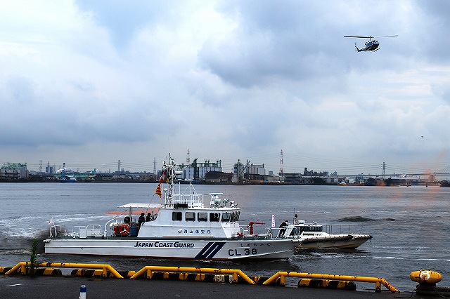 (左)テロリストが投擲した不発の爆発物を回収する、爆発物回収班の車両。 (右)人質をとって立て篭もっていたテロリストが連行されてきた。 (左)貨物船S号は出港停止処置がとられ、埠頭は愛知県警の機動隊などにより封鎖された。 (右)沖合いを警戒する愛知県警の警備艇「あいち」 船上には海保特警隊員の姿が見える。 (左)S号の開放を求め現れたX国支援者によるデモ隊(と言っても一名でしたが)が、規制線を越え警官隊に突入! (右)制服警官の刺股に足を取られる等して検挙された。 訓練の最後に海保ベル212「かみたか」が登場 海保ヘリは、X国支援者の乗る抗議船(海保監視取締艇「さぁぺんす」)を捕捉・追跡すると言う役割だった。 (右)ヘリより投下されたマーカーより赤い煙が出ている。 (左)海保巡視艇「しゃちかぜ」により針路規制される抗議船 (右)愛知県警「あいち」と海保「しゃちかぜ」により挟み撃ちにされる (左)停船した抗議船 (右)制圧の為抗議船に乗り移らんとする海保特警隊員。 この後抗議船が制圧され一連の訓練は終了しました。 PR
