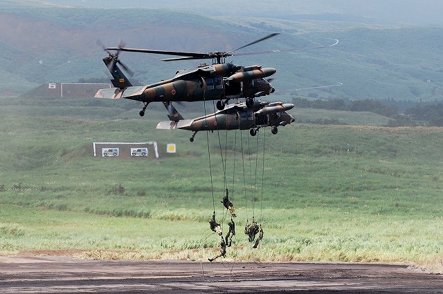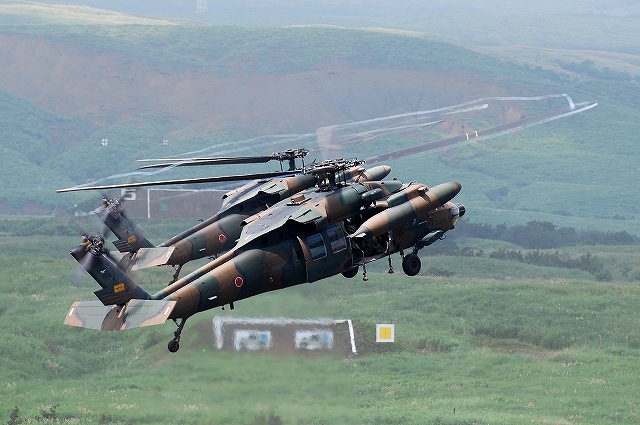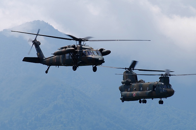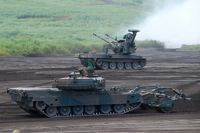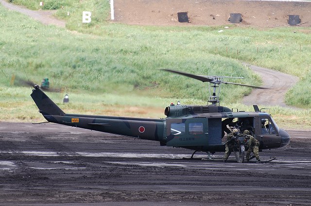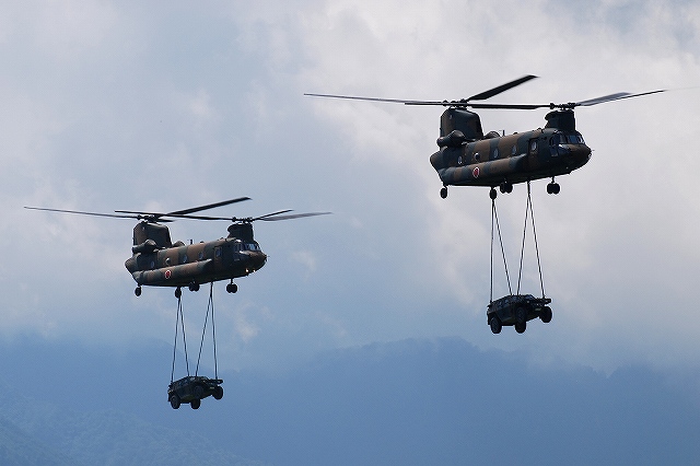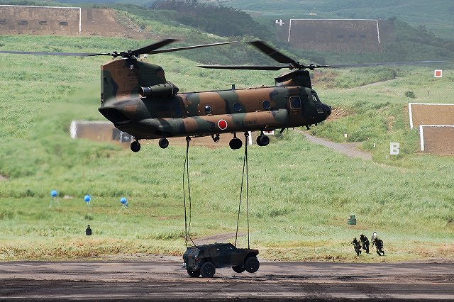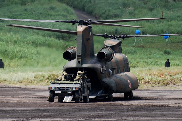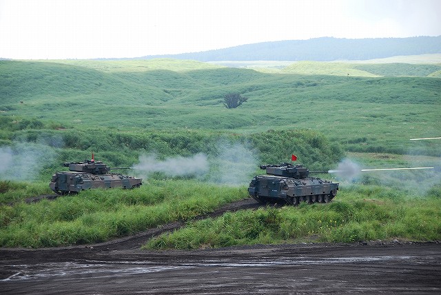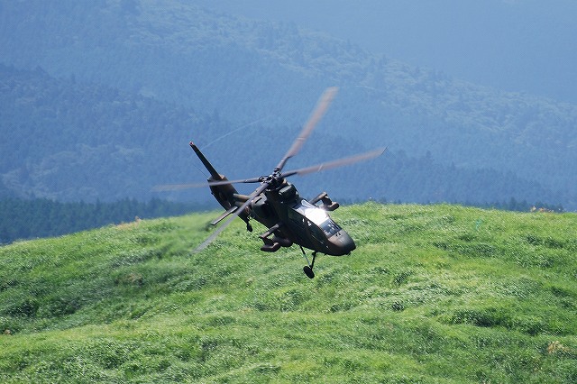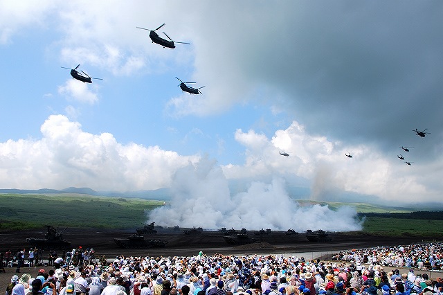 × [PR]上記の広告は3ヶ月以上新規記事投稿のないブログに表示されています。新しい記事を書く事で広告が消えます。 後段演習は「攻撃の場を通じた諸職種共同の戦闘様相の展示」を目的としており、各駐屯地祭の模擬戦のようにシナリオのもと、各種装備が登場します。 写真は後段演習冒頭に登場した遠隔操縦観測システム(FFOS)の無人偵察ヘリ。 観客席より少し離れた位置にてホバリングしていました。 後段演習の前半は航空偵察及びヘリボン行動。 (左)OH-1観測ヘリ (中)観客席前に着陸したUH-1H多用途ヘリより偵察バイクを下ろす。 (右)離脱するUH-1J(手前)とUH-1H(奥)。 近年UH-1シリーズの日本独自の改良型であるJ型の配備が進み、H型は数を減らしつつある物と思われる。 (左)UH-60JAブラックホーク多用途ヘリとCH-47Jチヌーク輸送ヘリが進入して来る (中・右)UH-60JAからはリペリング降下を、(写真は無いけど)CH-47JAからは前段演習同様ファストロープによる降下を実施。 (左)CH-47Jが軽装甲機動車をスリング輸送してきた (中)地上で待機してた隊員さんが駆け寄る (右)着陸したCH-47JAの機内から高機動車が発進。 高さがギリギリの後部ランプを通過する為車内で身をかがめていた隊員さんが、機外に出ると同時に一斉に89式小銃を構える。 後段演習の後半は地上部隊による敵陣への攻撃。 (左)射撃を実施する89式装甲戦闘車 (右)同じく74式戦車。この他特科部隊や普通科部隊による攻撃も実施されている。 (左)地雷処理用のロケット弾を発射する92式地雷原処理車 (右)ロケット弾が爆導索(爆薬を取り付けたワイヤ)を曳いて飛び、地上(地雷原)に落下した後爆薬に点火し地雷を処理する。 (左)90式戦車。 射撃体勢にあることを示す赤い小旗を立てているが、総火演の事前訓練中に起きた砲身破裂事故の影響により射撃は実施しなかった。 (右)35mm機関砲を射撃する89式装甲戦闘車 (左)会場正面に並んだ90式戦車及び89式装甲戦闘車より発煙弾を発射し煙幕を張る (中)戦火拡大のためヘリ部隊及び機甲部隊が前進したところで状況終了。 (右)地上部隊の隊列の後方には、87式自走高射機関砲と地雷処理ローラーを装備した90式戦車が居た。 つづく PR