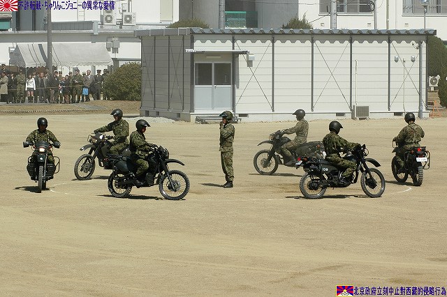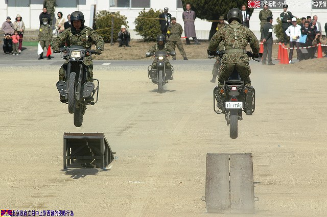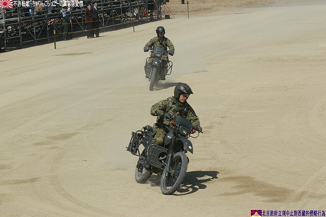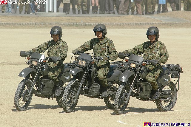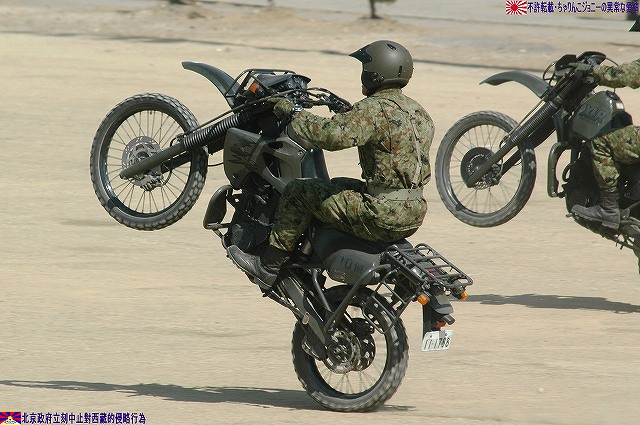 × [PR]上記の広告は3ヶ月以上新規記事投稿のないブログに表示されています。新しい記事を書く事で広告が消えます。 (左) 音楽隊の演奏に続き実施された訓練展示前段は、第10偵察隊によるバイクドリル。 観閲台正面に停車した2両の大型トラックの荷台より、各3台ずつの偵察バイクが登場。 (右)指揮官を中心に円を描く。 (左)3台ずつの横隊を組む。 現在偵察バイクは2つのメーカーのものが使用されており、この写真で両サイドに居るヘッドライトが小さい方がホンダXLR250R。中央に居るヘッドライトが大きい方がカワサキカワサキKLX250ESで、カワサキの方が新型。 どちらも市販250ccオフロードバイクに所要の改造を行ったもの。 (右)6台で横隊を組む。 (左)ジャンプ台を使ってジャ~ンプ。 (右)最後にウイリーで退場。 現れたのは「敵」役の皆さん。何かリアルに悪そうな格好…?(^。^;) 第10飛行隊(明野)のOH-6D観測ヘリによる航空偵察。 (左)「敵」が占拠した建物へロープ降下にて突入。 先に降りた一人が逆さまになって拳銃を構え掩護している中、さらに3名が降下し突入。 (右)偵察バイク登場。 続いてMINIMI搭載のパジェロによる「斥候車」が登場。 (左)目立ち難くする為か、ヘッドライト等ライト類やナンバープレート等表記類をマスキングしている他、2脚を用いた射撃に備えてかフロントシールドを倒したうえに板状のものを乗せてある。 (右)テールライトや彩度ミラーもマスキングされている。 (左)占拠した建物から追い立てられた「敵」が装甲車へと逃げ込む。 (右)重機関銃を撃ちながら「敵装甲車」前進。 (左)87式偵察警戒車登場。 同軸機関銃(7.62mm)を撃っていたが、25mm機関砲の向こうがわに銃口があるので発射焔は捕らえる事が出来ず。 (右)「敵装甲車」「被弾」。 (左)最後に74式戦車登場。 (右)「敵装甲車」を制圧して状況終了。 …つづく。 ・F-1オーストラリアGP F-1の今季開幕戦であるオーストラリアGPは、トラクションコントロール禁止という大きな規則改正が行われたとあって、(ただてさえ開幕戦は荒れ模様の展開が多いのに)セーフティーカーが3度登場すると言う荒れた展開。 フルタイム参戦の開幕戦であった中嶋一貴選手(ウイリアムズ・トヨタ)は、しぶとく走りぬいて6位入賞を果した。 優勝はルイス・ハミルトン選手(マクラーレン・メルセデス) 2位はニック・ハイドフェルド(ザウバー・BMW) 3位はニコ・ロズベルグ選手(ウイリアムズ・トヨタ) その他「日本勢」のホンダ/トヨタ/スーパーアグリはリタイヤ若しくは失格に終わってしまった。 (ホンダのバリチェロは、セーフティーカー中の給油、及びピット出口の赤信号無視により失格) 本投稿及び添付した写真は私ちゃりんこジョニーの著作物であり、他のサイト・掲示板及びブログ等への無断転載を禁じる。 特に、かつては「中華人民共和国萬歳」現在は「異常な愛情」と言う名のパクりブログを運営している、支那人窃盗常習犯sunbinsiftに対しては強く抗議する。 PR ![]()
