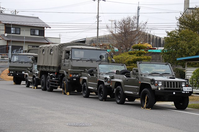 ・式典前 (左・中)会場に入ると、ロープ降下の予行をしているところをが見れた 本番の時は演出で焚かれたスモークに遮られよく見えなかったので、練習時の写真を掲載(^。^;) (右)会場横にて待機していた78式戦車回収車。 観閲行進のため駐屯地内で待機中の車両を撮影。 春日井では輸送隊や施設科等、後方支援の車両を見ることが出来る。 (左)パジェロと73式大型トラック(新)。 (中)74式特大トラックなど。一番後方の74式特大トラックは中型セミトレーラに搭載されている。 (右)こちらの中型セミトレーラは施設科器材を搭載していた。 ・観閲式典 (左)隊員の皆さんが会場に整列。 (右)巡閲 ・観閲行進 (左)後方支援連隊の救急車や野外手術システム等 (中)81式架柱橋車 (右)施設科のグレーダ車。 施設科の器材には工事現場など町中でも見ることが出来る車両が有る。 (左)73式大型トラック(旧)など。 (中)この73式大型トラック(旧)は83式地雷敷設装置を牽引していた。 83式地雷敷設装置はこのようにトラックや装甲車に牽引され走行しながら地雷原を敷設することが出来る。 (右)ダンプカーは荷台を上げ下げしながら観閲行進した。 (左)この73式大型トラック(新)は渡河ボートを載せたトレーラを牽引している。 (中)第10偵察隊の82式指揮通信車。 (右)偵察バイクの観閲行進。 ヘッドライトがやや小さいものがホンダXLR250R、やや大きい方がカワサキKLX250ES。 (左)MINIMIを搭載したパジェロ。 後方に見える音楽隊の皆さんが演奏している曲は「祝典ギャロップ」。 (中)87式偵察警戒車 (右)MINIMIを搭載したジープ。 即応予備自衛官の人が乗っていた。 …つづく。 本投稿及び添付した写真は私ちゃりんこジョニーの著作物であり、他のサイト・掲示板及びブログ等への無断転載を禁じる。 特に、かつては「中華人民共和国萬歳」現在は「異常な愛情」と言う名のパクりブログを運営している、支那人窃盗常習犯sunbinsiftに対しては強く抗議する。 PR
