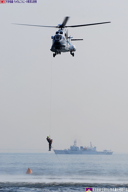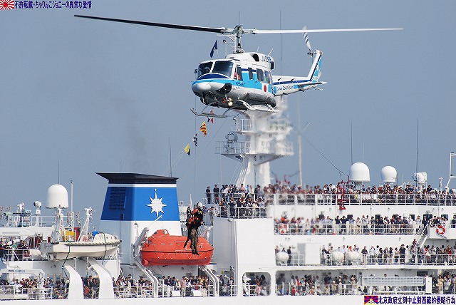 × [PR]上記の広告は3ヶ月以上新規記事投稿のないブログに表示されています。新しい記事を書く事で広告が消えます。 ・航空機の観閲 またここにあるのは一部の参加機体です。 写真は先頭を飛行していた2機のベル212。前が巡視船「おおすみ」搭載のMH540「きんこう」、後が巡視船「ちくぜん」搭載のMH594「おおほり」。 (左)MH755「くまたか」(シコルスキーS76C 函館) (右)MH962「まなづる」(アグスタ139 鹿児島) アグスタ139は、配備が始まったばかりの新鋭機。 (左)MA952「うみつばめ」(サーブ340 鹿児島) (右)LAJ501「うみわし」(ガルフV 羽田) ・ヘリコプター編隊飛行訓練と放水展示訓練 写真は海保ヘリ4機による編隊飛行。 先頭はシコルスキーS76C「くまたか」で2機のベル212と1機のベル412がつづく。 (左)MH540「きんこう」(ベル212 「おおすみ」搭載機)。 ベル212は軍用ヘリのベストセラー機UH-1(民間名ベル205)の双発型で、ベル212は民間用の形式名。本機は海保の回転翼機では最多の勢力。 (右)MH906「おしどり」(ベル412 美保)。 ベル212の改良型で、4枚ローター化などにより能力の向上が図られている。 海面上では放水展示訓練として海保及び各消防機関の消防艇によりカラー放水が行われている。 放水の着色には環境に無害な食紅を使用しているとの事。 消防機関のヘリによる編隊飛行。 「つばめ」(東京消防庁 ドーファン)/「はまちどり2号」(横浜市安全局 ドーファン)/「おおとり1号」(千葉市消防局 ドーファン)/「そよかぜ2号」(川崎市消防局 BK-117)の4機が参加した。 (右)横浜市安全局のドーファン「はまちどり2号」 カラー放水を終え(放水銃等の洗浄のため?)通常の放水をしている所。 ・人命救助/海上防災訓練 …と「火災想定船」の後部甲板で結構大音量な爆発が起こり状況開始(…って海保でも言うのかな?) (左)海面上の漂流者を吊り上げるMH565「せきれい」(ベル212 「そうや」搭載機)。背後に見えるのは見学者が鈴なり状態の巡視船「いず」。 (中)海面上の漂流者を吊り上げるMH686「うみたか」(スーパーピューマ 「しきしま」搭載機) 背後ではベル212「せきれい」が母船である「そうや」に着船しているよう。 (右)離脱してゆく「うみたか」 その下方には観閲を受けた後観閲船隊の後方に付いていた3500トン型巡視船PL21「こじま」が見える。 海上保安大学校(呉)の練習船として使用されている「こじま」なので、露天船橋に見られる制服姿の一団はその学生の皆さんかな? 観閲船隊は人命救助/海上防災訓練の状況を取り巻くようにして180度回頭するので、このような写真が撮れる。 (左)観閲船隊の後方につけたロシア国境警備局の「チュコトゥカ」。 観閲は終ったのに律儀に登舷礼中…と思ったら、乗員の一部(というか過半数?)はカメラを構えて 良い画は撮れましたか? (右)観閲船隊3番船として、わが「おおすみ」に続行するPLH06「ちくぜん」(ヘリ1機搭載型巡視船 福岡)。 見学者を満載 (左)観閲船として、わが「おおすみ」の直前を航行していたPLH22「やしま」(ヘリ2機搭載型巡視船 横浜)。 露天船橋に紅白の観閲台が設けられているのが見える。 見学者が「出し物」が行われる右舷側に集中する為、船隊が右側に傾斜している。上空にいるのは (右)…てな事をやっているうちに「火災想定船」の「火勢」が増し、消防艇による「消火活動」が行われた。 写真は火災想定船に接近する海保消防艇PC51「よど」(鹿島) (左)「漂流者」を吊り上げた「うみたか」がPL06「くりこま」(1000トン型巡視船/救難強化巡視船 宮城)へ着船、「漂流者」が船内の医務室へと運び込まれる。 (右)「くりこま」を発船する「うみたか」 「しきしま」に搭載される「うみたか」及び「わかたか」の2機のスーパーピューマは防弾性能を有する「軍用型」だそう。 …つづく。 本投稿及び添付した写真は私ちゃりんこジョニーの著作物であり、他のサイト・掲示板及びブログ等への無断転載を禁じる。 特に、かつては「中華人民共和国萬歳」現在は「異常な愛情」と言う名のパクりブログを運営している、支那人窃盗常習犯sunbinsiftに対しては強く抗議する。 PR