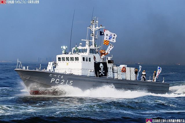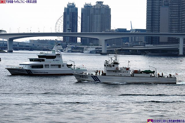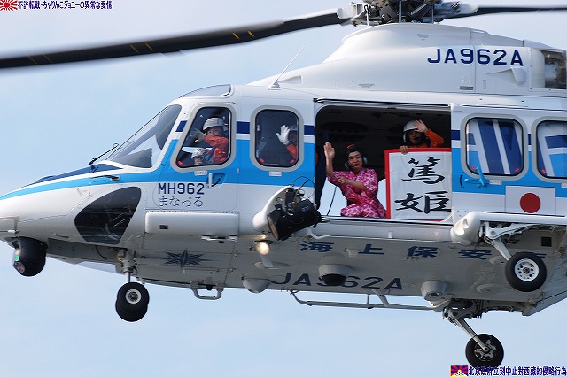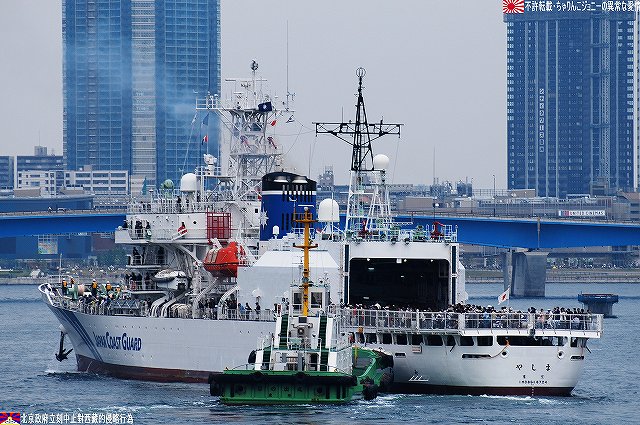 × [PR]上記の広告は3ヶ月以上新規記事投稿のないブログに表示されています。新しい記事を書く事で広告が消えます。 ・フェアウェル(見送り) 総合訓練終了後、観閲船隊が実施海域を出るにあたって一部の参加船艇及び航空機により、地域色豊かな見送りが実施された。 (左)名古屋海上保安部所属の巡視艇CL38「しゃちかぜ」は、金シャチの横断幕と海保60周年を祝うプラカードを掲出。 手旗信号の意味は不勉強の為不明(スンマセン…) (右)神奈川県警の警備艇「しょうなん」。 後部甲板にはマスコットキャラクターが居た。 テロ鎮圧訓練で「テロ被疑船」役で大暴れ(^。^;)した対馬海上保安部の巡視艇PC215「たつぐも」は、お約束の海賊旗もそのままにフェアウェルに登場。 (右)船橋では ドンパチの最中も船内にこのヤマピカリャーが居たかと思うと、ちょっと面白いですね。(^。^) (左)宮崎海上保安部の巡視船PS04「きりしま」船上には、「宮崎のセールスマン」氏が登場。 (右)鹿児島航空基地所属の海保最新ヘリアグスタ139「まなづる」には…大河ドラマでお馴染篤姫…が…? (右)巡視船「ちくぜん」(福岡)搭載のベル212「おおほり」。 パイロットが窓から (左)こちらも海保最新ヘリ、関空航空基地所属のEC225「みみずく」からは、海保のマスコットキャラうみまるくんがお見送り。 EC255はスーパーピューマの改良型で、ローターが5枚化されるなどしている。海保の他陸自も要人輸送用に採用している。 (左)超信地旋回(違)をしつつ放水の舞いを披露した、巡視艇(消防艇)FL01「ひりゅう」(横浜) (右)「ひりゅう」他の放水を背景に、いつの間にか観閲船隊の前方に移動していたロシア国境警備局の「チュコトゥカ」が、帽振れをしつつ擦れ違ってゆく。 上甲板では練習生の皆さんが帽振れをしている。 「こじま」は観閲式終了後、練習生の皆さんとともに遠洋航海へと出発するそう。 ・晴海入港 突然ですが、これより巡視船「やしま」の入港作業を撮影する作戦…略してヤシマ作戦を発動する。←これが言いたかっただけ(^。^) …という事で、写真はわが「おおすみ」に先行しレインボーブリッジ手前まで進んだ「やしま」と東京タワー。 (左)船の科学館にて保存されている砕氷船「宗谷」。 初代南極観測船として知られる砕氷船「宗谷」は海上保安庁所属で、解役後は船の科学館にて保存公開されている。 (右)同じく船の科学館にて保存されている、青函連絡船「羊蹄丸」。 以前は白を基調とした末期(JR時代)の塗装だったが、数年前に国鉄時代の塗装に塗りなおされ、煙突のマークも懐かしの「JNR」(Japan National Railways=日本国有鉄道)マークが復活した。 晴海に到着。 (左)タグボートの力を借りて回頭する「やしま」。 (右)わが「おおすみ」の後に続き、接岸の順番待ちな「ちくぜん」。 (左)PC01「まつなみ」(東京)と、PS101「あそぎり」(牛深)。 「まつなみ」は、出港から入港まで観閲船である「やしま」の直掩を勤めていた。 (右)接岸作業を終えつつある「やしま」 …という事で海保観閲式レポートは以上です。 短いながらも内容の濃い「航海」でした。 最後になりましたが、当日現地にてお世話になった皆さん有難うございました。 本投稿及び添付した写真は私ちゃりんこジョニーの著作物であり、他のサイト・掲示板及びブログ等への無断転載を禁じる。 特に、かつては「中華人民共和国萬歳」現在は「異常な愛情」と言う名のパクりブログを運営している、支那人窃盗常習犯sunbinsiftに対しては強く抗議する。 PR