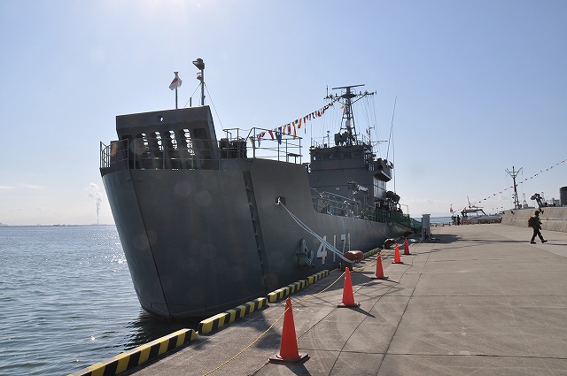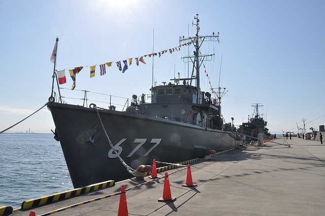 海自阪神基地では、輸送艦「ゆら」(左写真)及び掃海艇「くめじま」(中写真)が公開されていました。