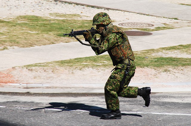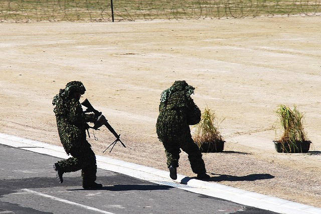 (左)第10飛行隊(明野)のOH-6Dによる航空偵察から状況開始 (中)第10偵察隊(春日井)の偵察バイク登場 (右)画面奥での87式偵察警戒車の車上より同僚が見守る中ジャンプ。 (左)第10偵察隊(春日井)の87式偵察警戒車 (右)バイクを起こして撤収。 画面奥にいる82式指揮通信車は「敵装甲車」役。 隊舎の屋上よりレンジャー登場。 (右)壁を駆け下りる (左)こちらは第10特科連隊(豊川)の隊員さん。 (中)FH-70 155mm榴弾砲とともに登場 (右)重迫牽引車(≒高機動車)に牽引されて、120mm迫撃砲登場。 (左)第10高射特科大隊(豊川)の93式近SAM登場 (中)FH-70の空砲射撃 (右)120mm迫撃砲は、射撃の動作のみを展示。 狙撃チーム登場 右側の人が狙撃手で、(画面では見えないけど)対人狙撃銃を装備。 左側の人は観測員で、観測用の望遠鏡と援護用の89式小銃を手にしている。 (左)第10戦車大隊(今津)の74式戦車登場 (中)停車後間髪を居れずに空砲を発砲したため、「大きなが音がします」との警告のプラカードがあったにもかかわらず、ほぼ不意打ち状態。(^。^;) (右)その後油圧サスペンションを用いた姿勢制御のデモを実施。 (左)第35普通科連隊(守山)の軽装甲機動車登場 (中)続いて第10戦車大隊(今津)の96式装輪装甲車も登場。 (右)下車戦闘が披露された よく見ると鉄条網の上に一名隊員が横たわって、突入の通路を啓開していたよう。 つづく。 PR