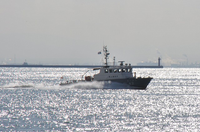 (左)沖合いを通過していった海保巡視艇CL42「きくかぜ」