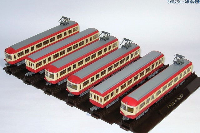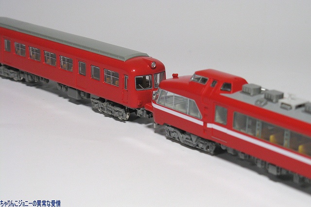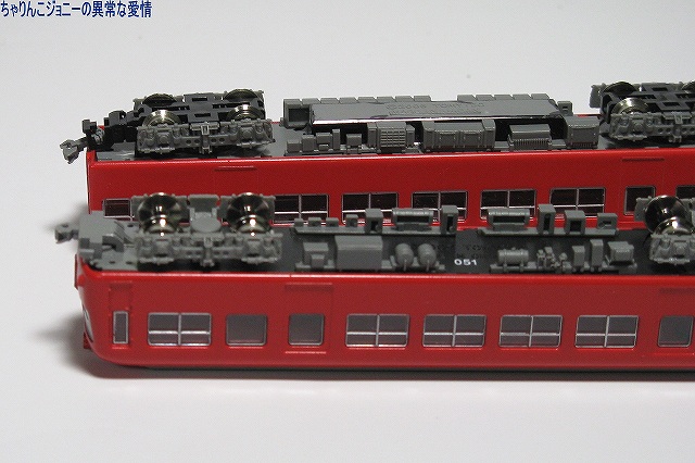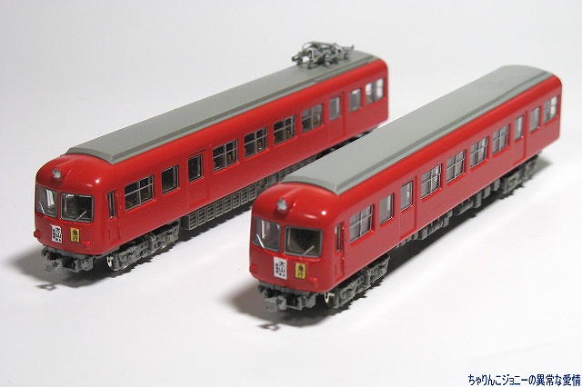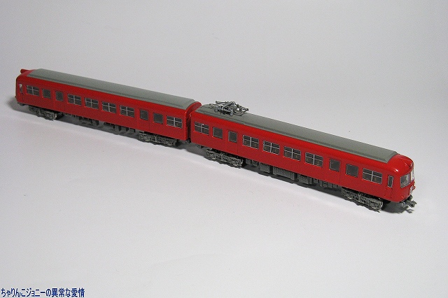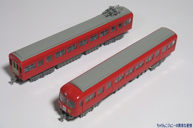 × [PR]上記の広告は3ヶ月以上新規記事投稿のないブログに表示されています。新しい記事を書く事で広告が消えます。 ※実車解説 名鉄5000系は国鉄東海道本線電化に伴う電車運転に対抗し1955(昭30)年に登場した名鉄初のカルダン駆動電車。 正面のデザインは「湘南電車」こと国鉄80系電車に採用されて以来当時流行していた正面二枚窓(所謂「湘南窓」)を採用し、航空機の技術を取り入れたセミモノコック構造を採用した車体は全体に丸みを帯びていた。 ※模型制作 ・名鉄5000系と長電2000系の相違点 いわば「兄弟車」な両者なので、一見良く似ているものの… 1:長電2000系の車体断面形状は後の名鉄5200系や5500系同様直線的。 2:名鉄5000系には中間車に、長電2000系は先頭車にパンタグラフが乗っている。 3:名鉄5000系は4両編成、長電2000系は3両編成。 4:台車が違う 5:塗装が違う …等が挙げられます。 5000系の最終増備編成は、正面の湘南窓こそ継承されているものの、ボディ側面の断面形状は卵形から直線的なものにする。機能的には4両1ユニットだったものを2両1ユニット化…等の変更が加えられ、後に増備された5200系や5500系のプロトタイプ車的内容をもって落成した。 …と言う 写真は今回用意したベース車両。箱買いでフツーに集る3両プラス、バラ買いで集めた3両(当然不要な他の車両も何両も引いた(^_^;))の合計6両を用意しました。 ・車体の分解 先ずは車体の分解より作業開始。 多くのNゲージ鉄道模型同様車体裾を少し広げて床板を抜き取り、次いで窓ガラス及び屋根板のパーツを取り外します。 どのパーツもはめ込んであるだけなので、比較的簡単に取り外せますが、窓ガラスのパーツは割としっかりはまっているので、パーツを破損しないように気をつける必用が有ります。 ・屋根板の改造 4両編成中2個所あるパンタグラフのうち、1個所は長電2000系のまま先頭車に、もう1箇所は中間車へと設置する事にしたのですが、先頭車と中間車では運転室の有無などにより屋根板の長さが違うのでそのまま移植する訳には行かず屋根板を改造する事に。 パンタを設置する中間車の屋根板は、先頭車のパンタ部分の屋根板と中間車の屋根板を切り継ぎして製作。 パンタを廃止する方の先頭車の屋根板は、パンタ取り付け用の穴を埋めると共に、パンタ横のランボードなど不必要なディテールを紙やすりにて削り落とします。 穴埋めや切り継ぎ部分の継ぎ目消しにはゼリー状の瞬間接着剤を使用し、切り継いだ部分の補強に裏側より短冊状の薄い金属板(正体は他のプラモデルで使ったエッチングパーツのランナー(^。^;))にて補強してあります。 屋根板の塗装には、たまたま手元にあったタミヤカラー・エアーモデルスプレーのAS-11ミディアムシーグレイを使用。スピットファイヤの下面に使う色らしいのですが丁度ええ感じの色でした。 編成にした時に見た目を揃えるため、改造していない屋根板も同時に塗装しておきます。 パンタグラフはグリーンマックス製のPT43を使用。取り付け穴とパンタ側の取り付け部の径が微妙に合わず据わりが悪いので、バネの調整をしてみたりしたものの、それでもダメだったので最終的にはプラ用の接着剤にて軽く接着しました。 写真は屋根を改造した各車。 ・車体関係の作業 車体は塗装前に念のため、ラッカー薄め液浸したティッシュにて長野電鉄の塗装を落としておきます。 次に、6000系以前の名鉄電車を象徴するアイテムである前面の行き先表示板及び種別板を取り付けます。今回も遊々クラブ製のエッチングパーツを使用し、コレを瞬間接着剤にて車体に取り付け、メタルプライマーを塗ります。 その後に塗装作業。グリーンマックス製の鉄道カラースプレー(缶スプレー)のスカーレットを吹き付け、「名鉄電車全般」と謳っているだけあってコレさえ塗っておけば車体断面がどうとか、パンタの位置がどうとか関係なく名鉄電車に見えますね(^。^)。 行き先表示板などは他キットより ・足回り 使用したのは鉄コレ18m車用で、車体ヘの取り付けは無改造で出来ますが、その前に「室内」や床下に出っ張っているモーター等の部分を黒のマジックにて塗っておくと、組み立てた時に目立たなくて良いです。 台車枠は車両に付属のものを使用。「台車が違う」問題は「試作的要素を含んだ車両」と言う事で動力化をしない車両も含めてスルー(^_^;) それ以外の車両へは鉄コレ用走行用パーツの金属性車輪及びウェイトを取り付けました。 動力車は走行用パーツに付いているカプラーポケットに、カプラーポケット取り付け用のものを、その他の車両はボディマウント式のものを取り付け。 こうする事により外観だけではなく車両間の連結間隔も縮まり外観がリアルになるのですが、肝心の先頭部分のみなんだか収まりが悪くパーツの一部を削ったりしたものの解決しませんでした。 床下機器は2両1ユニットにする為揃えておく…のだけども、タネ車の都合で上手く揃わなかったので他の鉄コレからテキ