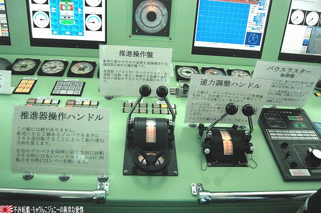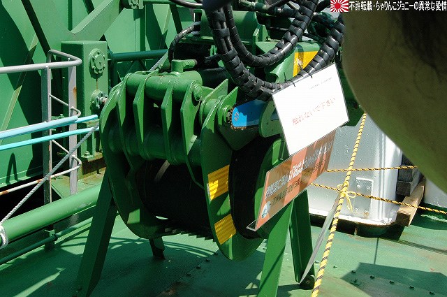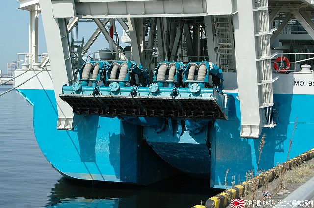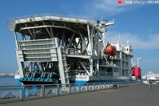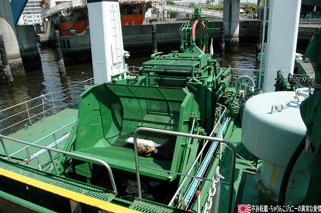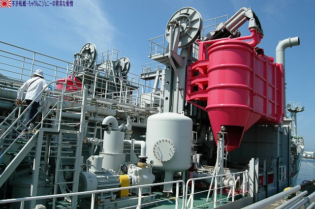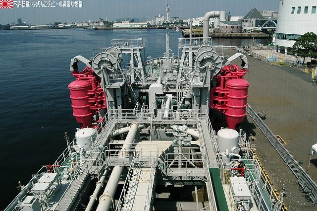 × [PR]上記の広告は3ヶ月以上新規記事投稿のないブログに表示されています。新しい記事を書く事で広告が消えます。 ・浚渫兼油回収船「清龍丸」 本船の役割の一つが災害発生時の情報収拾作業で、そのためにも有用な装備。 ココまで上がれれば、その後に接岸している「さわゆき」を良さげに撮影できそうだったが、残念…と言うか当然ながらこの部分は立ち入り禁止だった。 浚渫作業の際はこの部分を海底に降ろし、時速2~3ノットで航走しつつ作業を実施する。 L字型のパイプ状のものは、浚渫し泥艙に貯蔵した土砂を中継台船へと排送する、舷外排送管。 赤い物は油回収器。 本船は全長104m 総トン数4,792t 。 操船及び浚渫/油回収に伴う操作はここと機関監視室より行えるそう。 ブリッジとCICが一体化したようなものかな? 本船のスクリュー部分は360度回転できるようになっており、舵は持たない。 よって舵輪に相当する物は、左右両方のスクリューを同時に回転させる時に使用する小さな丸いハンドルと、左右個別に回転させる時に使う2本のレバー。 船体中央部が、浚渫した土砂を貯蔵する泥艙になっているのが判る。 (左)船橋後部にある機関監視室。 (右)食堂。 まだ新しい船と言うこともあり、広くて清潔と言う印象を受けた。 厨房。 防火と言う観点からか、電気を使用した調理器を使用しているよう。 海自の隊員さんが見学している姿もチラホラ見受けられた。 ・清掃兼油回収船「白龍」 伊勢湾及び三河湾を守備範囲に、海面に浮かぶゴミの収集を実施している船。 油流出事故発生の際には、油回収も行えると言う。 (右)比較的短い船体に、トップヘビーそうな上部構造物が乗っている姿は、何となく海自の「ひうち」型多用途支援艦を連想させ、「ひうち」型と違いこちらは双胴船にもかかわらず、「ひうち」型と同様停泊中も結構揺れていた。 (左)揚貨装置。 水面上のゴミを拾い上げる。チェーンソーも付いている。 (中)ゴミ回収装置。このカゴ状のものを双胴の間に降ろし、2~5ノットで航行しつつゴミを回収する。 その後方には浮遊ベルト式油回収装置。 (右)塵芥コンテナ。 普段は護衛艦や巡視船を取上げがちな当ブログですが、安全航行の確保の為にこういった船舶も活動していると勉強になりました。 最後になりましたが当日現地でお世話に成った皆様有難うございました。 ・オマケ 名古屋港ポートアイランド付近で作業中(?)の清龍丸 海釣り公園より5/23撮影 本投稿及び添付した写真は私ちゃりんこジョニーの著作物であり、他のサイト・掲示板及びブログ等への無断転載を禁じる。 特に、悪質パクりブログ「中華人民共和国萬歳」改め「JMSDF rie」を運営していた、支那人窃盗常習犯sunbinsiftに対しては強く抗議する。 PR
