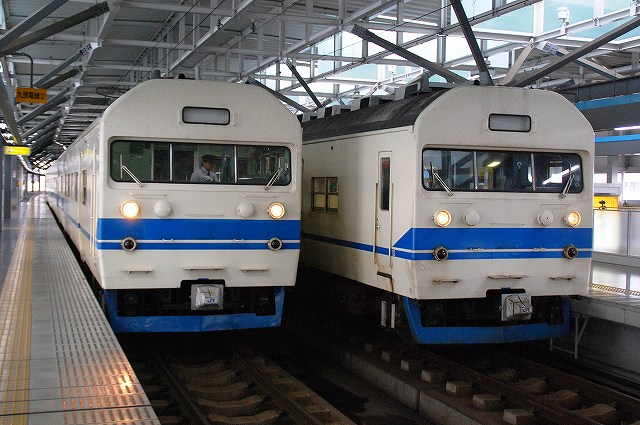 ・えちぜん鉄道 福井より、三国港への三国芦原線と勝山までの勝山永平寺線の2路線を運行するえちぜん鉄道。その2路線が分岐する福井口駅側の車庫へ行ってみる。 2度の正面衝突事故による運行停止処分を受け撤退した京福電鉄(福井支社)から路線を引き継ぎ営業している第3セクター鉄道えちぜん鉄道は、運行再開に辺り安全面での改良は勿論の事、運賃値下げやアテンダントの添乗等数々の施策を行い、少子高齢化が進む昨今に有っても年々乗客数を伸ばしている。 (左)えちぜん鉄道の車庫は、北陸新幹線建設工事に関連し、以前の勝山永平寺線沿いの場所から三国芦原線沿いの場所に移転していた。 (中)MC2101形。この2両は共に両運転台車だが、2両編成化されていた(手前2両)。 以前はこの車両のように元阪神の車体を流用・改造した車両が主力だったが、現在は予備車的な存在になっているよう。 奥には現在の主力である元愛知環状鉄道の車両が居る。 (右)更にその手前には除雪用の電気機関車ML521形が停まっていた。2両重連で使用されるようで、編成の前後に大きなスノープラウがついている。 以前訪問した時は旧車庫の奥のほうにいて上手く撮影できなかったが、今回は歩道から良く見える位置にいてラッキー。 (左)旧車庫に一両佇んでいたML6形。外観は電動貨車だが電気機関車だそう。現在は車籍が無く構内入れ替え用の「機械」扱い。1920(大9)年製造。 2軸の足回りや独特の前面形状もだが、「Yゲル」と呼ばれる古くは路面電車等に多用されていた集電装置を装備しているところも萌えポイント(^。^;)。 (中)現在のえちぜん鉄道の主力はMC6001/6101形。 元愛知環状鉄道の100/200/300形で、片運転台で2両編成で使用されていた100/200は2個イチして両運転台(1両編成)に。両運転台型だった300形はそのまま1両編成のまま、塗装の変更やワンマン運転機器の搭載等の改造を経て使用されている。 初期に転属してきた(2003年より譲渡開始)車両がMC6001、後期に転属してきた車両がMC6101形を名乗っているが、両者の違いは冷房装置タイプ等僅で、この車両はMC6101形 (右)電動貨車の横を通過するMC6101形。 複線区間はここより1つ勝山寄りの越前開発(えちぜんかいほつ)駅まで。 (左)福井駅に停車するMC6101形。その背後には一部のみ作られている北陸新幹線用の高架橋が見える。 (右)画面右隅に見切れているのがえちぜん鉄道の福井駅。その隣が、先日乗り場が福井駅東口へと移転してきた高速バス用の切符売り場。 画面中央が一部のみ姿をあらわした北陸新幹線用の高架で、画面左隅に見切れて居るのが一足先に完成しているJR北陸本線(在来線)の高架駅。 福井-福井口間で北陸本線に並行しているえちぜん鉄道にも高架化の計画があるが、北陸新幹線建設工事や、三国芦原線LRT化計画との関連もあり、具体策はまだ発表されていない。 ・JR北陸本線 続いてJR福井駅にて少し撮影。 北陸新幹線開業を睨んで高架化されたJRの福井駅は、先に高架化された金沢駅や富山駅同様、降雪対策で駅全体が屋根に覆われるシェルター構造をとっている。 (左)ホームに上がると、北陸本線名物「食パン電車」こと419系が並び「春の食パン祭り」を開催していた(^。^)。 国鉄末期に583系寝台電車を普通電車用に改造して誕生した419系のうち、中間車に運転台を取り付けたグループは、寝台車特有の屋根の高い断面構造がそのまま「顔」の輪郭を形成し、「食パン電車」との非公式な愛称が付いている。 (中・右)越美北線用のキハ120。 JR西日本の各地の非電化ローカル線に投入されている軽量ディーゼルカーキハ120は、投入線区ごとに塗装が異なっている。 国鉄色を残す485系特急電車を使用した特急雷鳥。 (左)JR化後に増備された683系を使用した米原行き特急しらさぎが、貫通型の車両を先頭にやって来た。 名古屋・米原-北陸間を結ぶしらさぎ用の683系は、窓の下の青帯の下に更にオレンジの帯が入っている。 (右)大阪行き特急サンダーバード@681系または683系(681系のマイナーチェンジ型が683系)。こちらは非貫通式な流線型の車両を先頭にしてやってきた。 サンダバード用の681/683系は青い帯のみ。 (左)新鋭521系(左側)と国鉄末期に製造された413系電車(右側)が並ぶ。 (中)521系の配備により、419系等「国鉄型車両」が一気に淘汰されるかと思いきや、今の所敦賀以北の区間では共存共栄しているような感じ。 (右)金沢方面に出発してゆく413系電車。 2扉車ながら、急行型電車のようなデッキ構造を廃した「近郊型」電車。 (左)敦賀方面より419系到着。 今回はタイミングが合わず583系本来の先頭車を用いた編成は撮影できなかった。(走っているのは目撃(^。^;)) (中)485系のパノラマ型車両を先頭にした特急雷鳥。 (右)681/683系と擦れ違う。 485系は2011年までに淘汰されることが発表されている。 PR