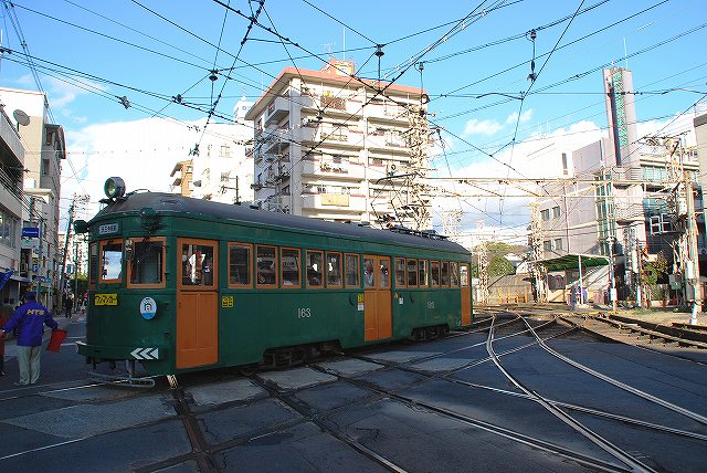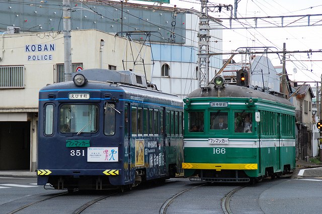 浜寺駅前から阪堺電軌にのり、専用軌道と併用軌道の境界である綾ノ町駅で撮影。 (左)351形とすれ違っている緑色の電車が今回のお目当ての161形電車。 非冷房の旧型車なので、普段の運用はラッシュ時など限られているのだが、お正月の時期は住吉大社への初詣輸送のため電車が総動員され、161形の姿も数多く見ることが出来る。 (右)堺市内の併用軌道区間は、グリーンベルト似て仕切られていて半ば専用軌道のよう。 利用者減で廃止も取り沙汰された堺市内の区間だが、堺市等が計画中で阪堺線と相互乗り入れする東西鉄軌道と合わせてLRT化(強引に言えば近代化)される予定で、今後が注目される所。 大和川駅まで移動し、大和川を渡る電車を撮影。 (左)お正月らしく、凧あげの様子を入れてみる。 川のわたり口の所に大和川駅がある。 (左)この大和川橋梁は、開業以来大切に使われている明治44年製の物。 (中)1931(昭6)年生まれのモ172が渡る。 (右)1998(平10)年生まれのモ607が渡る 阪堺電軌の阪堺線と上町線が交差する住吉付近に移動。(画面左右方向が住吉公園-天王寺の上町線で、前後方向が浜寺駅前-恵美須町の阪堺線。) 現在10両が在籍している161形のうち、モ161~168とモ170は1928(昭3)年製造と車齢が80年を越えており、名鉄510形(1926/大15年製造)や豊鉄3700形(1927/昭2年製造)が引退した今日では、日本で現役最古の電車である。(残るモ172は前述のように1931/昭6年製造) しかも、1両のみ動態保存的に…ではなく、有る程度纏まった数が現役に残っているのは特筆に価する…カモ? 歩行者天国とされ臨時の停留所が作られている住吉大社前に161形が3両が集結。 モ170は沿線の鉄道喫茶がスポンサーになり南海旧塗装に塗られている。 (左)住吉大社の前を通過するモ166 (中)上町線の折り返し駅である住吉公園駅に停車中のモ162。 (左)次発のため「中に誰も居ませんよ」状態だったスキに(^。^;)モ162の車内を撮影。古い電車独特の木と油の匂いがした。 つづく。 PR