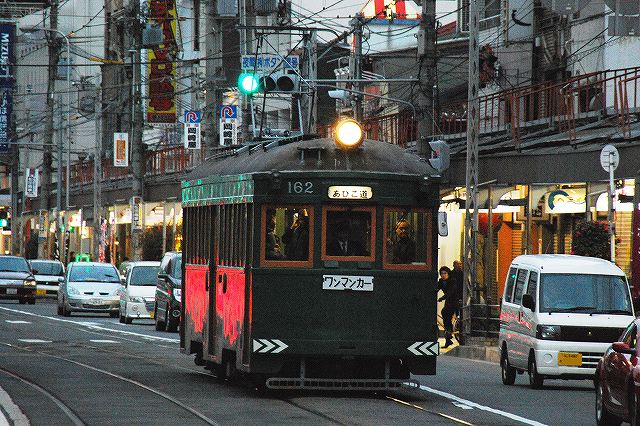 言い忘れていましたが、阪堺電軌の撮影/移動には全線1日フリー乗車券 てくてくきっぷを利用しています。 帝塚山四丁目駅へ移動し引き続き撮影。 この停留所は併用軌道区間のドンツキ(専用軌道に替わった所)にあるので。道幅が狭く歩道の無いこの区間に於いて、ホーム付近より安全に併用軌道の撮影が出来る。 旧南海大阪軌道線塗装のモ163とモ162が並ぶ。(阪堺電軌軌道は1980/昭55年に南海から分社化され誕生した会社) モ163には阪堺電軌のマスコットマークをあしらった副票が取り付けられている。 (左)南海旧塗装のモ170とすれ違っているのは351形(モ353)。 351形は旧式車の機器を利用し車体を501形(後述)並みのものに乗せ替えた車両で、1962~1963年に合計5両が登場しており、後年冷房化改造も行われている。 (右)501形(モ501) 1957年に、路面電車の最盛期と言える当時の最先端技術を用いた車両として5両が登場している。 前面は大阪市電3001形に似ているが、側面窓は当時の南海電車に似た一段降下窓を採用している。 501形のうち全面広告では無い車両には雲をかたどった塗装が施され(通称雲電車)、501形就役50周年記念のステッカーが貼られてある。 701形は1987~1995年の間に11両が製造された電車。当然ながら当初より冷房を搭載している。 601形は旧式車の一部器機を流用し701形並の主要器機及び車体等を新造した電車。1996~1998年に7両が登場している。 (左)車齢50年のモ501も、車齢80年のモ162と比べるとまだまだ「若手」? (中)161形のうち、全面広告やリバイバル塗装ではない車両は、やや明るめのグリーンに白帯の塗装。 (右)帝塚山四丁目から住吉方面の線路は、南海高野線と立体交差するためS字を書いた勾配になっている。 (左)東天下茶屋駅で降りて阿倍野清明神社へ寄ってみる。 (中)東天下茶屋駅付近にて。 (右)東天下茶屋駅の一角にあった馬車鉄道跡の石碑。 傍らの解説文等によると、1897(明30)に創立した大阪馬車鉄道(※)が、1900(明33)年に天王寺西門前-東天下茶屋間を開業したのが、今日の阪堺電軌軌道の始まりだそう。 その後馬車鉄道は住吉まで延長されるも、電化のため1908(明41)年に一旦廃止され。1910年に電車での営業が始まっている。 ※馬車鉄道とは、レール上に乗った車両を馬が引く形態の鉄道。蒸気機関の実用化/普及以前の鉄道の動力は馬だった。 鉄のレールの上を鉄の車輪により走行するため走行抵抗が小さく、通常の馬車より輸送力が大きい。 阿倍野駅へ移動。 (左)旧南海大阪軌道線塗装のモ162がやってきた (中)標準塗装のモ167と並ぶ。(歩行者信号が青の時に横断歩道より撮影) (右)今度は南海旧塗装のモ170が来た。 天王寺まで歩いて移動しつつ、折り返してきたモ167を撮影。 (左)天王寺駅前駅付近の状況。 画面右手方向、あべの筋の西側は再開発のため更地になっていた。 (中・右)前の電車に続き出発してゆくモ164。駅手前では、次の電車が待機中。 PR