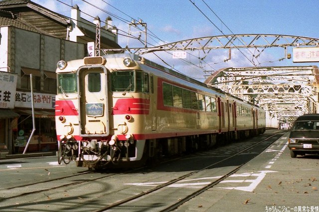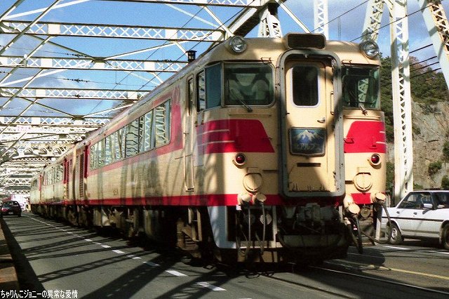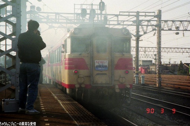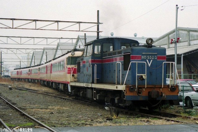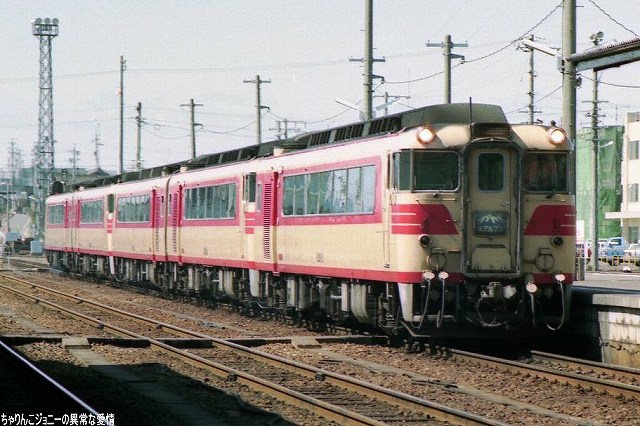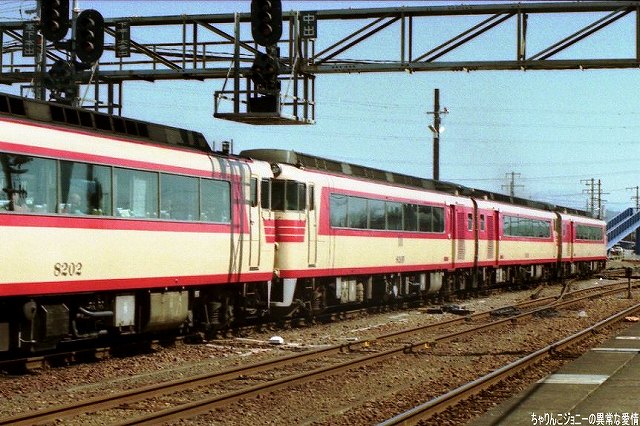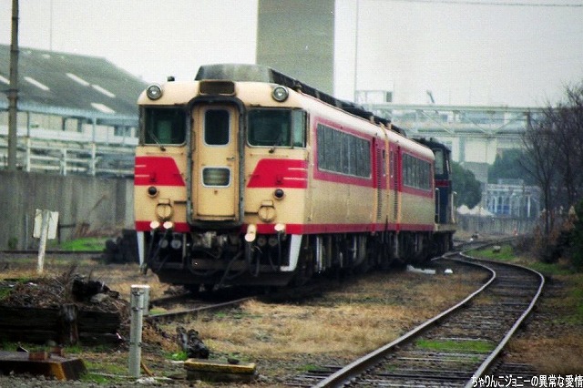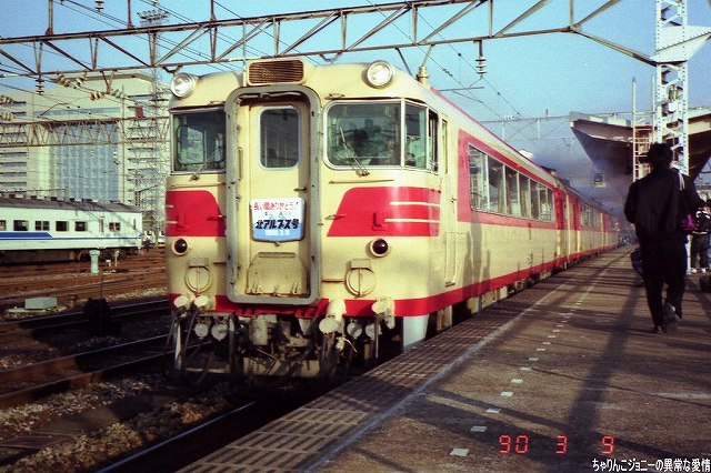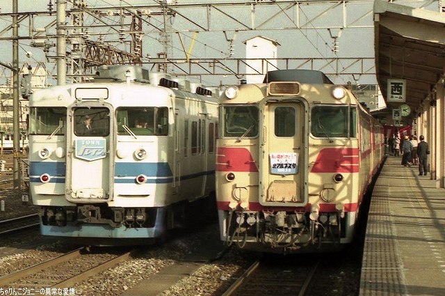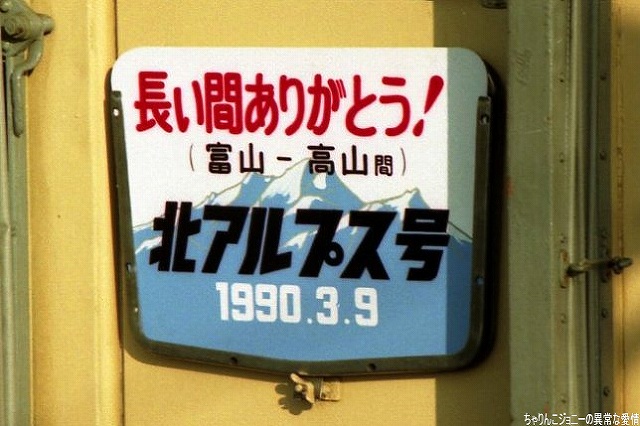 × [PR]上記の広告は3ヶ月以上新規記事投稿のないブログに表示されています。新しい記事を書く事で広告が消えます。 DMH-17H型エンジンやコイルバネ台車を使用するなと性能面では国鉄の急行用気動車キハ58系に準じているものの、転換クロスシートや固定式連続窓を使用するなど客室設備は7000系パノラマカー等に準じているものを装備し、車体幅は名鉄の車両限界によりやや国鉄車両に比べ狭いなど、乗り入れ先の国鉄車両とはやや趣が異なっていた。 塗装は、当初は国鉄急行型気動車が、1796(昭51)年に特急へ格上げされた後はヒゲ付きの国鉄特急色が施され、赤一色の名鉄電車の中でも異彩を放っていた。 今回は昭和の日に因んで、昭和の名鉄の名物車両の一つであったキハ8000形の写真をまとめてみました。 (チョット強引? ・富山駅にて 写真は、乗り入れ最終日の富山駅で撮影したもの。 (右・中)最終日のヘッドマーク。前後で違うものが掲出されていた。 (左)「新名古屋-富山」の行き先表示板など。今となっては「新名古屋」と言う駅名も過去の物なんだよね。 「北アルプス」が停車しているのは切り欠き式に設置された「西ホーム」。 現在のJR富山駅は北陸新幹線乗り入れを前提とした高架化工事が完成しており、写真とは状況が一変している…はず。(実はこの時以来富山駅へ行ったことが無いので…(^_^;)) 富山駅を後にする「北アルプス」。 ・犬山橋にて 撮影日は不詳(整理が悪くてスマン)。ただしこの2枚は同一日の撮影ではない筈。(瞬間移動でもしない限りムリ(^。^;)) 神宮前-新鵜沼間は名鉄線内を走行した「北アルプス」。 その間のハイライトはなんと言っても犬山橋。勿論当時は道路との併用橋だった。 ・美濃太田駅にて 高山本線へと乗り入れた「北アルプス」。 3両編成が基本だった「北アルプス」だが、この日は繁忙期だったらしく5両編成で運転されている。 製造当初は中間車も存在した8000系だが、末期は運転台を持つ車両のみで編成が組まれていた。 ・大江/東名古屋港駅付近にて 撮影日は、多分92年12月(オイオイ) JR東海が特急「ひだ」用に新型気動車キハ85系を投入すると、キハ8000系は設備面/性能面で見劣りするようになり。名鉄は1991(平成3)年9月にキハ85系に準じた8500系を「北アルプス」へ投入、替わってキハ8000系は引退した。 その後8000系は他社へと譲渡の話も有った模様で暫くは稼働状態にて留置されたものの、結局譲渡話等は纏まる事は無く、全車が解体されてしまった。 (左)キハ8000系のうち、最後まで残っていたキハ8200形5両が大江駅まで移動してきた。 キハ8200形は富山地鉄立山までの乗り入れに備えて増備された形式で、走行用エンジン2基のほか発電用エンジン1基も装備した重装備車。 (右)構内入れ替えのため前後に名鉄の電気機関車がつく。 更に2両は、名電築港信号所付近の解体場所まで移動した。 (右)一仕事終えて東港駅へと戻る名古屋臨海鉄道のND552。 普段は列車が通らない踏み切りなので、旗を手にした係員さんが警戒/誘導中。 ・その後の「北アルプス」 「北アルプス」としての運行は僅か10年で終了してしまったキハ8500系だが、その後は会津鉄道へと譲渡され、「AIZUマウントエクスプレス」として運行されている。 PR
