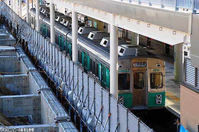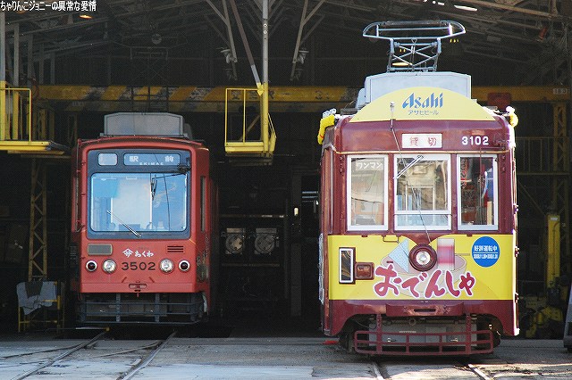 かつてはこの塗装が豊橋鉄道の標準塗装だったが、渥美線は車両の世代交代で、東田本線は車体の全面広告化で消えてから久しかった。 全車元東急7200系の1800系似て運行されている渥美線だが、この編成は新豊橋駅移転開業に伴う運用増に対応する為、上田電鉄が使用していた同型車2両と部品取り用に豊橋鉄道が保有していた同型車1両を以って新たに増備された編成。 ステンレス地に赤帯が渥美線電車の基本塗装だが、本編成は緑色の帯を巻いている。…と言う訳なので、苦しい写真なのはご勘弁。渥美線もそのうちちゃんと撮影に行くですね。 札木電停そばの交差点へ移動し歩道橋より撮影。 (左)元東京都電7000形を改造したモ3500形がやって来た。 (右)モ3500形(左側)と元名鉄揖斐線のモ780形(右側)の擦れ違い。 モ780形は全車7両が豊橋鉄道に移籍し、名鉄時代と同様の形式及び車番にて運用されている。 モ3203がやって来た。 …それは良いのだけども、「ほっトラム」は豊橋鉄道HP似て告知されていた時刻になってもやって来ず。同HPには検査の都合等により他形式が代走する事が有る旨記されていたので、車庫のある終点赤岩口へ行ってみると… やはりT1000形「ほっトラム」は車庫で休んでいた。走りは撮れなかった物の、登場記念のヘッドマークを付けている所が撮れたので、まぁエエか。(^。^) T1000形、アルナ車両の新世代路面電車「リトルダンサー」シリーズの一員で、初の狭軌用。 バリアフリー化の為出入り口にステップの無い全面超低床構造を採用しており。それを実現する為3連接車体の両端2両に台車を配し、中央の一両は台車を持たず両端の2両に支えられるフローティング構造となっている等、ユニークレイアウトをしている。 車番は3両1編成で「T1001」を名乗っており、駅前方よりそれぞれ「A車」「B車」「C車」と呼ばれる。 ちなみに、本車の投入による旧型車の代替廃車は行われないとのこと。 (右)車庫内では名古屋市電最後の生き残りであるモ3102が、今夜の「おでんしゃ」運行に備え待機中。(右側) 私が当地を訪れると何故か「お休み」の事が多いモ3502「ヤマサのちくわ」号。案の定この日もお休みだった(^。^;) (左)赤岩口に到着するモ3203。第一目標だった「ほっトラム」が運休なので、この日の撮影は3203を軸に実施する事に。 (右)モ3203に乗って次の撮影場所へ移動。写真は使い込まれたマスターコントローラー。 東八町で下車。 (左)此処まで乗ってきたモ3203とモ783が擦れ違う。 (中)赤岩口へと向かうモ783。 (右)交差点の歩道橋より。 東田坂上へ移動。 (左)夕焼け空を背景にモ3203が上がってきた。 (中)この辺りの軌道は昔ながらの石畳にて舗装されている。 (右)モ3203が戻ってきた。駅前へむけ坂を下ってゆく。 新川へ移動。 駅前で折り返し赤岩口へ向かうモ3203を撮影。 …つづく PR