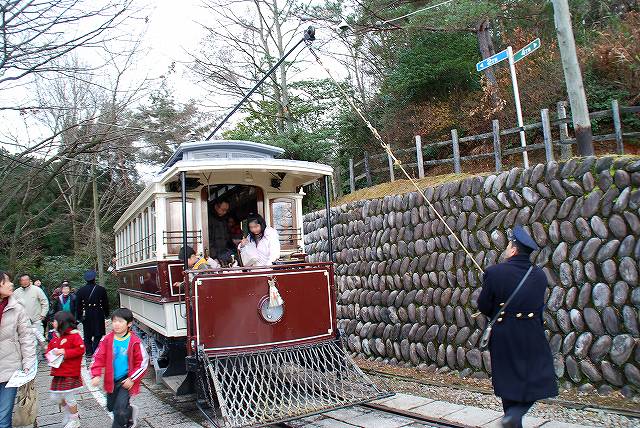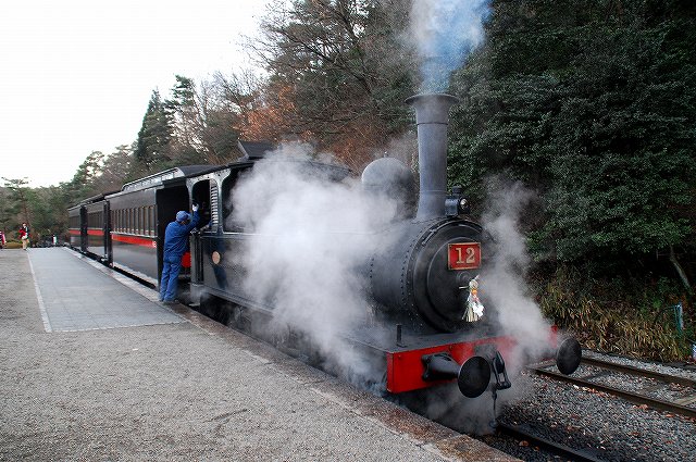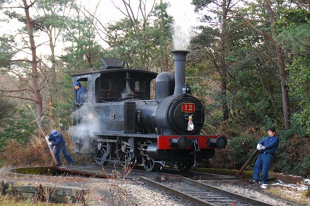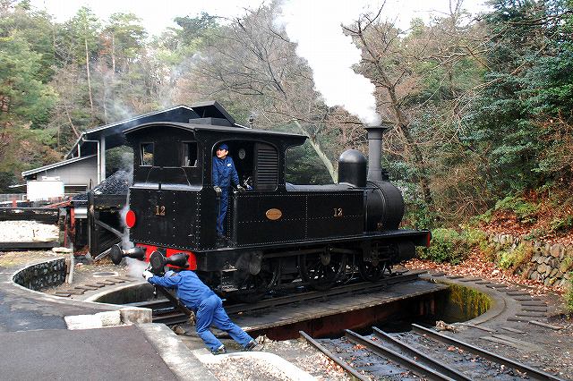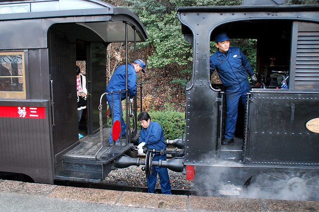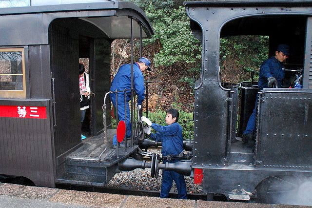 × [PR]上記の広告は3ヶ月以上新規記事投稿のないブログに表示されています。新しい記事を書く事で広告が消えます。 名鉄資本の施設だからか比較的鉄道関係の展示物も多い明治村ですが、中でも特筆されるのは日本における初期の鉄道車両である「陸蒸気」と「京都市電」を動態保存し実際に乗客を乗せて運行している点といえるでしょう。 写真はカーブをスムーズに曲がれるように塗油(レールに油を塗る)作業をしている職員さん。 一口に動態保存といっても、いろいろと手間隙がかかります。 ・京都市電 日本初の市内電車として1895(明28)年に開業した京都市電の車両のうち、後年(明治43年から44年)に増備された比較的大型の車両2両が保存されている。 路線の中間地点である市電京都七条駅付近にて。 この日のお当番は「弐号」。お正月なので注連飾りが付いている。 (左)馬車の名残なのか運転台は吹きさらし。 基本レイアウトは今日の(ワンハンドル式が普及する前の)電車と同じで、左側が自動車のアクセルに相当するモーターの主幹制御機。車体は国産だが電装品など足回りは輸入品のようで、主幹制御機には「THE ENGLISH ELECTRIC LONDON」と「DICK KERR SYSTEM」の文字が見られた。 右側がブレーキで、回生ブレーキどころかエアーでもない手巻き式のもの。 (右)走行中はこんな感じ。2軸台車の独特な乗り心地と、営業路線では貴重品になりつつある吊り掛けモーターの走行音が楽しめる。 (左)路線両端の折り返し駅では、ボール回し(集電装置の方向転換)が見られる。 (右)市電名古屋駅の先の線路で休んでいた「壱号」 ・陸蒸気 9号と12号の2両の蒸気機関車が動態保存されており、月の前半は12号が後半は9号が運用されるとのことで、この日は12号が動いていた。 「なごや」駅の人力式(!)転車台にて方向転換中の12号。こちらも正面に注連飾りをつけた可愛らしい姿。 「機回し線」を通して先頭部分へと機関車を付け替える。 終点に着いた客車列車がもと来た方向へ戻るためには、機関車をそれまでは最後尾だった編成の先頭へ付け替える必要がありこの作業を「機回し」と呼ぶのだが、客車列車が激減した今日の日本の鉄道ではそれ自体が貴重な風景といえるのかも? (左)客車と機関車を連結する。 連結器も開業当時のネジ式(チェイン式/螺旋連結器)のもの。 (中)車単部左右に付いている緩衝器(バッファ)同士が接触した状態で車両を停止させ、一方の車両(この場合は機関車側)に付いているリングを相手側車両(この場合は客車)のフックにかけ、リング中央部にあるネジ(締結機構)を締める。 (右)客車側に付いているチェーンを機関車側のフックにかける。 …と、書いているだけでも面倒な作業なので(^。^;)、大正年間に今日でも使用されている自動連結器へ一斉に交換する「自連替え」が実施されている。 (12号機関車の連結器も当然自連に交換されていたが、明治村入りするにあたって淡路交通より寄贈を受けたネジ式連結器により「復元」されている) (左)組成完了 (中)12号機関車の銘盤(たぶん複製) 英国のシャープ・スチュアート社製の1Bタンク機で、日本初の鉄道である新橋-横浜間にて使用する機関車の増備車として、同区間の開業2年後である1874(明7)年に輸入されたもの(当時の番号は「23」)。 その後尾西鉄道へ払い下げられ、同社が名鉄に合併された後も昭和32年まで使用されていたそう。 (右)客車も明治41年及び44年に製造されたもの(ともに国産) 「とうきゃう」駅での機回し作業は、駅横の売店の先にあるスペースより見学できる。 (左)転車台の先にある小さな機関庫内には、もう一両の機関車である「9号」が休んでいた。 この機関車は1912(明45)年に富士身延鉄道3号機として輸入されたC型タンク機で米国ボールドウィン社製。後に日本鋼管鶴見製鉄所へ譲渡され9号機として使用された。 (右)転車台を俯瞰する。 傍らには給炭及び給水用の施設がある。 PR