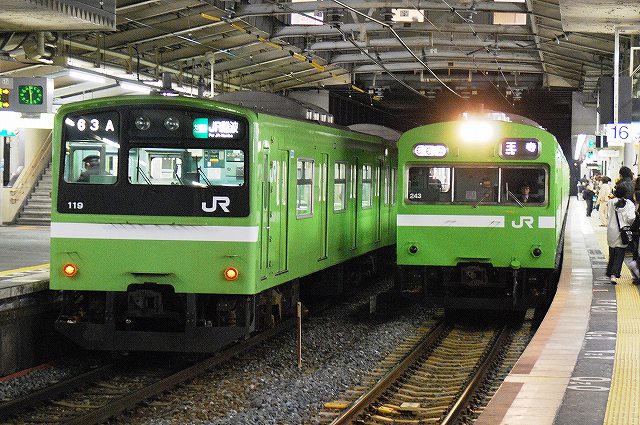 × [PR]上記の広告は3ヶ月以上新規記事投稿のないブログに表示されています。新しい記事を書く事で広告が消えます。 ・天王寺 帰りの特急の時間までまだ大分有ったので、天王寺駅で少しJRを撮影。 (左)阪和線の233系。 櫛型ホームと高いドーム式の上屋が、元は私鉄路線だった阪和線の出自を物語っているよう。 (右)阪和線の103系@体質改善(≒延命工事)車 関西線のホームへ下りる (左)大阪環状線の103系@体質改善車 (中)関西線の201系と103系 (右)大阪環状線の201系/221系(関西線から乗り入れ)/103系 (左)関空行きの特急「はるか」 (右)103系にてJR難波駅へ移動 ・上本町 まだ時間が有ったので、何時もの上本町駅地下(奈良線)ホームで撮影。 (左・中)今回の遠征でとりたかったけど撮れてなかったものの一つ、「せんとくん」のラッピング車が撮れた (右)奈良線の在来車には阪神との相互直通対応車とそうでないものが混在しており、写真では画面左側の車両が相直対応車。 相直対応車にはそれを示すステッカーが貼られて居るが、それ以外に電機連結器が2つ付いているのが識別点かな? (左)奈良線系のシリーズ21は全て相直対応のよう。 (右)スナックカー×8連の名古屋行き乙(主要駅停車タイプ)特急 こちらも今回撮りたかったけど撮れてなかった車両、名阪特急運転開始50周年記念のラッピングをしたアーバンライナーPLUSが来た。 …てな事をやっるうちに奈良線にて人身事故が発生し、ダイヤが乱れ始める。 (左)恐らく阪神線内より奈良行き快速急行として難波まで来た阪神1000系×10連が、難波駅にて運転打ち切りとなったのか乗客を乗せず回送で通過してゆく。 (中)その後も、運転打ち切りとなった列車が次々と通過してゆく。 列車を止めたままにしておくと次々やって来る列車が詰まってしまい、阪神線内にもダイヤの乱れが波及するのを避ける為の処置なのかな? (右)その後案内の画面はブラックアウトしたり、運行情報のみを表示したりと言う状態。 ワタシが乗る予定だったアーバンライナーに関しては特に案内がないので、とりあえずこのままホームで待つことに。使用されると思われる編成は先ほど難波まで行っているし(例の50周年記念のラッピング車)、鶴橋からは大阪線に入るので運休はないと思いたいけど、運休するのであれば早めに教えてもらわないと、新幹線へと転進するにも微妙に遅い時間になりかねないし(2003上本町発の特急に乗る予定だった)、最悪もう一泊か?? (左)先行列車が詰まってしまったのか、京奈良ラッピングの3021系が停車したまま動かなくなってしまった。 大阪線は動いているので、大阪線に乗り換えて(または更に鶴橋にてJRに乗り換えて)多少大回りになってでも目的地へ向かう人が大挙して下車したが、奈良線でしか行けない場所が目的地の人は車内に残るしか手がない…つか、アーバンライナーは何時来るの? (右)難波行きのアーバンライナーと並ぶ。 本来なら上下のアーバンライナーがほぼ同時に発着する筈なのだが…? 鶴橋からは平常運転の大阪線に入り回復運転を開始…と思いきや、通常のダイヤとは違う場所に入ったからか、列車密度の高い大阪近郊区間では、先行列車に当って(追いついて)徐行を余儀なくされる場面が多々あり、恐らく更に遅れが大きくなっていたよう。(例えれば、F1でピット作業に手間取り、漸くコースに戻ったら周回遅れの隊列の後尾につけてしまった…って感じか?) 大阪近郊区間を抜けてからは頑張って回復運転をしていたものの、名古屋到着も約20分遅れだった。 写真は、通常とは違い名古屋駅5号線に到着したアーバンライナー。 PR