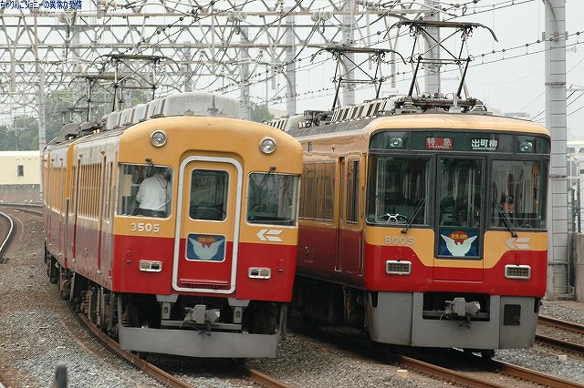 × [PR]上記の広告は3ヶ月以上新規記事投稿のないブログに表示されています。新しい記事を書く事で広告が消えます。 やや古いものもありますがご勘弁…(^。^;) ・京阪電鉄 中之島線開通を機に車両の塗装などを一新 先日京阪電鉄より、今年10/19に予定されている中之島線(天満橋-中之島)開通に伴う新型車両の投入や現有車両の塗装変更などについて発表が為されていました。 新型車両3000系は中之島線直通列車用に新造される3扉転換クロスシート(2+1配置)車。 従来の京阪にはない青/白のツートンカラーを纏う。 従来よりの車両も、上記3000系に合わせた新塗装へと変更される。 特急型車両は、現在の塗装を上下反転させたような赤/黄の塗装ななる模様。 また、(新)3000系の新造に伴い、1編成のみ残る(旧)3000系電車は8000系へと編入されるそう。 これらの塗装変更は平成24年度に完了予定とのこと。 ・名鉄 6/29実施予定のダイヤ改正の概要を発表 注目点の一つは西尾線-津島線系統の特急を廃止し、快速急行へと変更すること。 この系統の特急は1600系等全車特別車編成の特急車にて運行されていたが、名鉄の特急政策の見直しに伴い全車特別車編成が廃止されるための種別変更と思われる。 「西尾特急」廃止に伴い、この系統専属だった1600系は運用を一時離脱し、一部特別車編成への改造工事に入るものと思われる。 (左)津島駅に停車する1600系の佐屋行き特急。 (右)佐屋駅にて折り返し待機中の8800系バノラマDX。かつては「パノラマDX」も「西尾特急」に使用されていた。 2枚とも03/08/18撮影。 写真は併用橋時代の犬山橋を渡る7000系。 事後報告で申し訳ないですが… ・今年のポケモンラッピング電車第3弾 ギラティナ・シェイミ号@2200系 4/26より運行開始 他の2本のポケモンラッピング車(ポケモン ダイヤモンド・パール号/ポケモンミュースカイ2008号)同様、期間は8/31まで。 PR