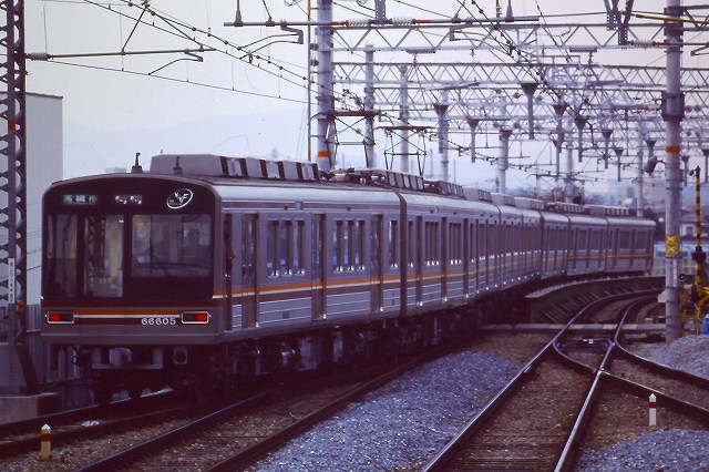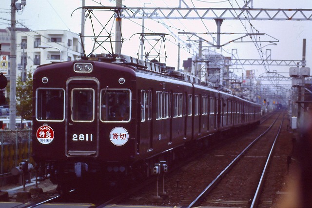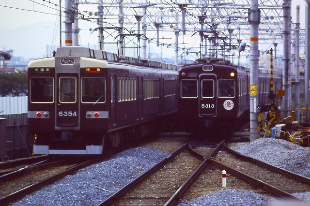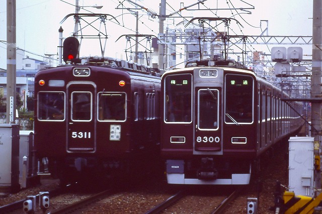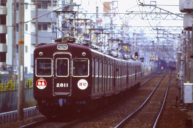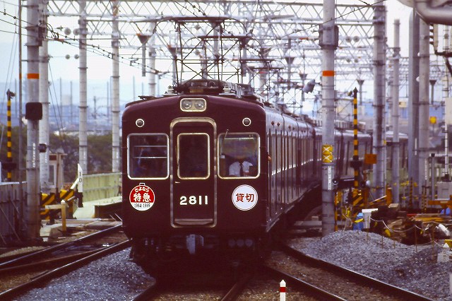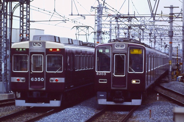 × [PR]上記の広告は3ヶ月以上新規記事投稿のないブログに表示されています。新しい記事を書く事で広告が消えます。 場所は阪急京都線の相川駅…たぶん。 当時は駅そばの橋梁の架け替え工事が行われていて仮橋を使っていた…と思う(何せ遠い昔の事なもんで記憶が…(^_^;)) (左)3300系の急行。今日とは配色が逆な黒地に黄色での急行表示を掲出している。 (中)6300系の特急と5300系の急行。 5300系の方は電動方向幕化改造が実施されておらず、丸に「急」の字の方向版を掲出している。 (右)大阪市市営地下鉄の66系 (左)6300系と8300系二次車。 こちらは黄色地に黒字の急行表示になっている。 (右)2800系のさよなら列車がやってきた。晩年は4両編成にされ嵐山線で使用されていたが、この時はその4連を2本連ねた8両編成で運行されていたよう。 片方が「貸切」とは言え、特急時代を髣髴とさせる2枚看板なのがうれしい所。 総持寺駅へ移動。(こちらは駅名票が写っているので間違いないです(^。^;)) (左)5300系。こちらは普通電車なので四角い方向版を使っている。 (右)5300系と8300系一次車 2800系が通過してゆく。 登場時と比べ冷房化・通勤車への格下げ改造(3扉/ロングシート化)と魔改造を受けた本形式だが、6300系に引き継がれた2連の側窓がかつての栄光を物語っているようだった。 PR