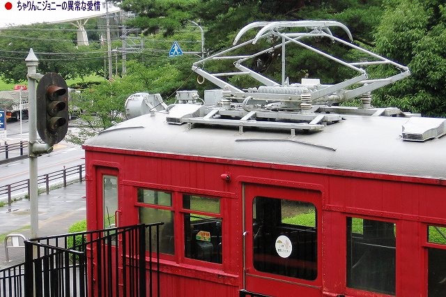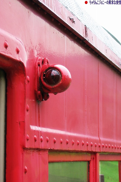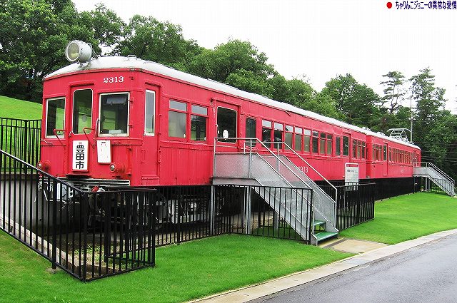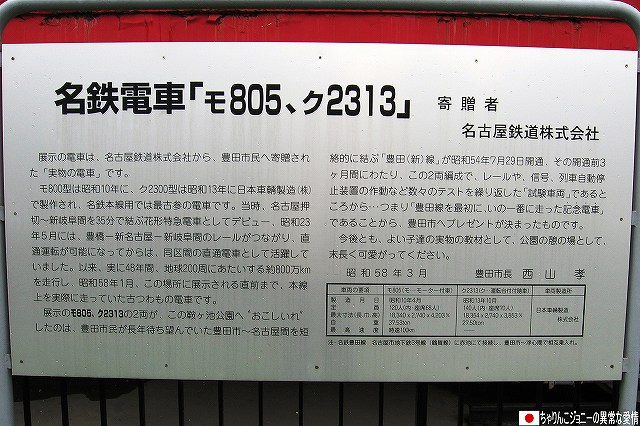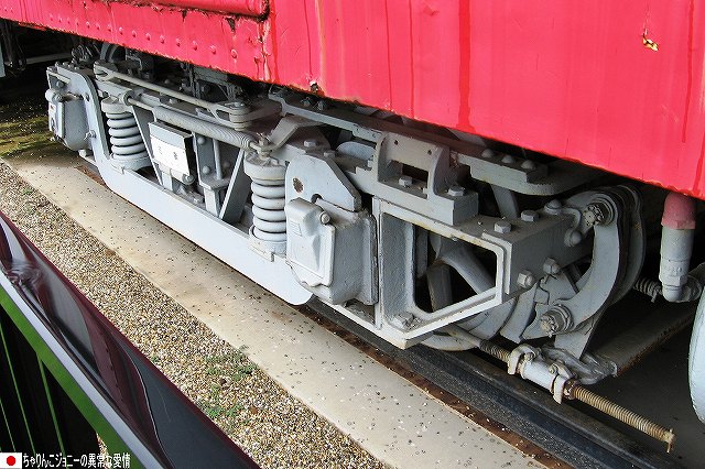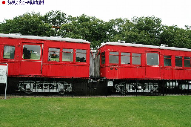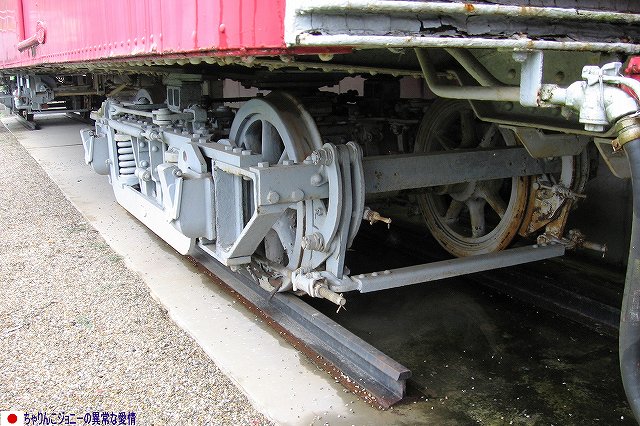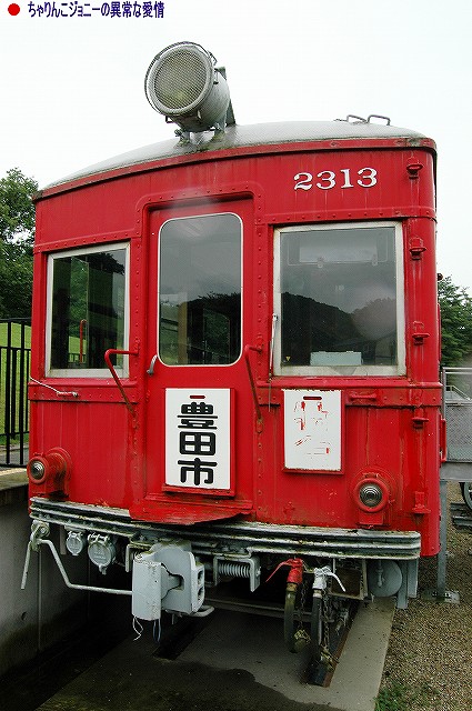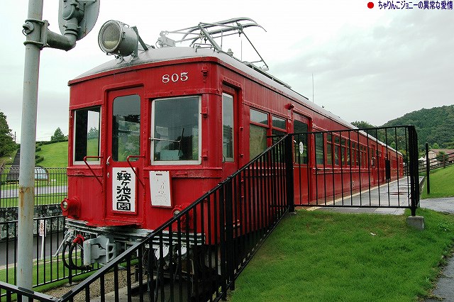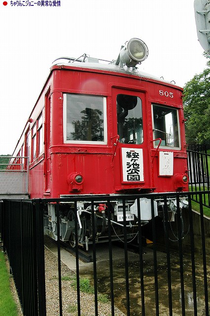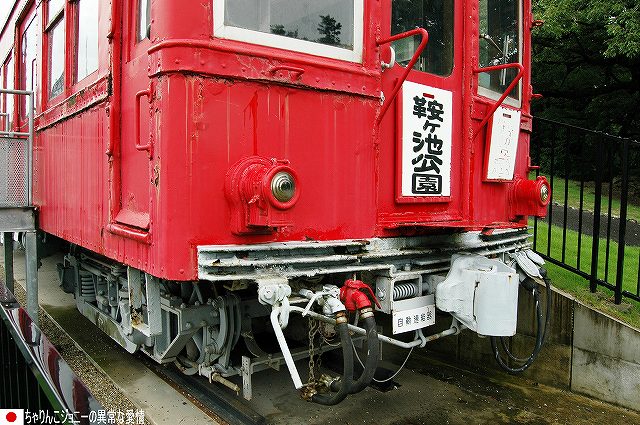 名鉄800系はワタシを名鉄信者たらしめた元凶(ォィォィ)といえる電車だったりしますので、まさに「異常な愛情」炸裂な感じのレポートですが、宜しければお付き合いくださいませ。 ・名鉄電車で豊田市駅へ しかも「時々雨」と言うのが写真のような尋常ではない振り方だったりして、なかなかナンギな天候。 写真は独特な配置のヘッドライトを輝かせ、豪雨を衝いて豊田市駅へ滑り込む7700系電車。 パノラマカーの増結用車輌として貫通型前面登場した本形式だが、現在はワンマン運転用の機器を搭載し全車が三河線へ集結している。 …などと、一時間に一本しかない鞍ヶ池公園へのバスの発車時刻近くまで余裕ブッこいて電車を撮影していたのが裏目に出て、いざ駅前に出てみるとバスの乗り場がよく判らず、雨で滑りやすくなるタイルで舗装された駅前を右往左往しているうちに見事にバスへ乗り遅れる。(^。^;) 発車時はほぼ座席が埋まるぐらい居た乗客も、平日の昼間…しかも雨なせいか、終点近づくとワタシ一人になっていた。 ・鞍ヶ池公園に到着 ワタシが使った電車+バスによるアクセスの他、東海北陸自動車道のハイウェイオアシスよりのアクセスも可能。 その東海北陸自動車道の完成に合わせ公園全体が再整備され、その一環として800系電車も再整備されたそう。 公園には動物園や観光牧場なども併設されており、入園は無料。 当初は単行運転可能な両運転台車として落成したが、後年一部を除き片運転台化され、各務ヶ原線の増結用車輌として製造されたク2310形とコンビを組んだ。 名鉄の旧型車は、晩年踏切事故対策のため高運転台化され原型を崩したものが多かったが、この編成は窓こそアルミサッシ化されているものの、基本構造は原型の低運転台のまま。 ヘッドライトも原型(※7)の一灯タイプの物だが、展示に際し破損防止のために金網が設置されている。 行き先表示に出ている「鞍ヶ池公園」と言う駅は、当然ながら実在しない。 前面車体裾部のグレーに塗られた三枚ヒダの物体は、「アンチ・クライマー」と呼ばれる鉄で出来たある種の錘。 電車同士が衝突した場合、「相手」が車体床上に乗り上げてきて車体を破壊し、乗客及び乗務員に被害を及ばないようにする為のもの。 アンチクライマ同士がかみ合い、台枠(シャシー)で衝撃を吸収するのが目的。 比較的良好な状態で展示されているとは言え、痛みが進んでいると思われる箇所も散見された。 貴重な車輌を末永く保存する為にも、リニューアルの際に撤去されたと言う上屋の再設置をお願いしたいところ。(※8) 製造当時は同一だった箇所も、後年の改造で一両一両に変化が出てくる…というのは古い電車の常。 台車をみる。ク2313のD15(左写真)とモ805のD16(右写真)。 基本的には同型のものだが、モ805のD16台車には各軸に1個ずつ(つまり1両で4個)、当時としては比較的強力(112.5kw)なモーターが取り付けられている。 ク2313のD15台車にはモーターが付いていない。 現役時代の写真を見ると、台車を始め床下機器は汚れていてどんな色かわからないが、本来はグレーに塗られていた事がわかる。 車軸に大きな歯車がモーター側についた歯車とかみ合っていた。 戦前製の本車は、当然ながら吊り掛け駆動方式(※9)を採用していた。 ちなみにモ805の方は昭和10年日本車両製。 ク2313側より撮影。 こちら側の行き先及び種別は特急/豊田市を掲出している。実際そんな系統が有ったかどうかは不勉強にて不明。 前面及び車体形状は800形のものを踏襲している。 車体横の階段は公開している車内への出入り用。 基本的には同一とは言え、両車ではベンチレーターの形式など細部に違いがある。 パンタが上がりきらないように(或いは、落っこちないように?)、棒状のもので支えいてる。 丘側の車体横はプラットホーム状になっており、ここより車内へと出入りする事もできる。 次回は車内見学編の予定です。 ※生半可な知識を基にした脚注(^。^)※ ※1 美濃町線末期に登場し、同線廃止後は豊橋鉄道及び福井鉄道へと移籍した2代目のモ800形とは当然ながら別物。 ※2 名鉄の前身の一つ。名古屋(押切町)-新岐阜間など、いわゆる「西部線」を建設した。 名古屋(金山橋)-豊橋間などいわゆる「東部線」は愛知電気鉄道によって建設された。 名岐・愛電両社は昭和10年8月に合併し、今日の名古屋鉄道が誕生している。 ※3 かつての西部線のターミナル駅。名古屋市電を介して名古屋市中心部へと連絡していた。また一部電車は名古屋市電へと乗り入れていた。 地下駅である新名古屋駅を介して東西直通運転が始まったのは昭和19年。 ※4 上記の如き理由から、それまでの名岐鉄道の電車は、揖斐/谷汲線での最後の活躍も記憶に新しい750形など路面電車サイズのものだった。 ※5 運輸省規格型…と言いつつ、そのスタイルは800系以来続く「名鉄スタイル」そのものだった。 ※6 現在の名称は「豊田線」。 ※7 末期には、ケースはそのままでシールドビーム2灯のいわゆる
