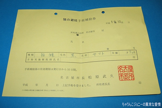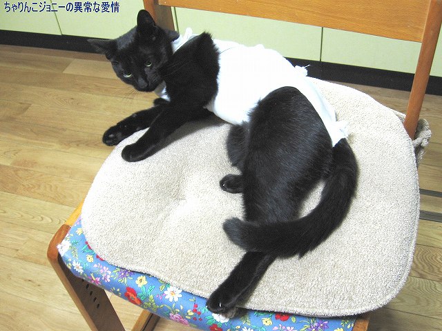 (^。^;) ・ 月 日 ヤマトを避妊手術に連れてゆく 人間の都合で健康体にメスを入れ、その本能ごと体機能の一部を取り去ってしまう、ということについて考えてしまわないでもないのですが。実際問題として子猫が増えても困るし、 で、結局近所の獣医さんのお世話になりました。 日帰り手術でも良いとのことでしたので、朝預けて夕方引取りに…。 帰ってきたらこんな事に… 手術部位にガーゼを当て、包帯の替わりに「洋服」(獣医さんもそう呼んでいました)を着せてあります。 手術当日の夜は、傷が疼くのか「洋服」がうっとおしいのか、寝付かれずに時々起き上がっては哀しそうな声で鳴くので、何だかこちらまで哀しくなってしまいましたが、日に日に回復。 一日おきに獣医さんへ注射+傷口への軟膏塗布を受けにつれて行き、一週間後に抜糸。念のためその後2日ほど余分「洋服」を着せておきましたが。今はそれも取れて、以前と変わらず元気にしています。 名古屋市では、登録の獣医さんで実施の場合保健所にて所定の手続きをすれば犬・猫の避妊・去勢手術に関して補助が出ます。 また、獣医師会よりの補助も有るそうで、今回実際に獣医さんにお払いした費用は(手術から抜糸まで一括で)26,000円でした。 (お住まいの地域や獣医さんによって異なるでしょうから、あくまで参考程度でね。) ・ 月 日 天使とダンスエスコン専用機上等!! つーことで、同時に発売された操縦桿型コントローラーともども購入。 とりあえず一周してみた感想ですが。や~、良いですね。いろんな意味でやり応えが増えてます。 欲を言えばもう少しステージ数と使用機体のバリエーションが欲しかったかな? まぁここらは「次回」に期待??? ・ 月 日 コソーリ出品してみるまぁ、手持ちの写真をプリントアウトしただけ、と言うナメたシロモノが受け入れられるはずも無く、立ち止まって見てくれる人が結構いたりして、無反応と言う訳ではなかったものの、終わってみれば結果は予想通りほぼ玉砕状態でした!!(^。^;) でも、イベントに参加していて楽しかったので全然オッケーです。 お世話になった皆さん有り難うございました。 PR