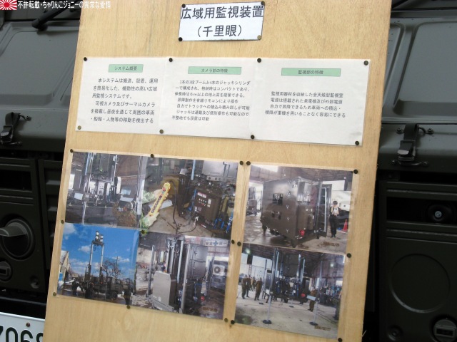 今回は、そのレポート一回目は速報版も兼ねて、今年度新偏された中部方面移動監視隊の装備の写真をまとめてみました。 写真は観閲行進する中部方面移動監視隊の車両。前方より地上レーダ装置1号(P23)×2両・広域用監視装置(千里眼)・全天候型監視室。 地上レーダ装置1号 P23。 地上の車両・人員や海上の艦艇といった移動目標を、中距離及び短距離で監視するための装備。 高機動車の荷台に搭載されているが、空自輸送機や陸自輸送ヘリなどによる輸送も可能。 広域用監視装置「千里眼」。 可視カメラ及びサーマルカメラを搭載し、昼夜を通じて車両・船舶・人物等の移動を監視できる。 こちらは73式中型トラック(新)の荷台に搭載されていて、ジャッキ(アウトリガー)を用い、重機などの支援を受けずに自力で積み降ろしが可能。 (左)後ろに続いているのは全天候監視室。 (右)この時はカメラ部分にカバーが取り付けられていた。 上記各装置の運用を行うシェルタで、こちらも73式中型トラック(新)の荷台に搭載。千里眼同様自力で昇降可能。 千里眼用の映像記録装置はハードディスクを使用しているそう。 後方にはアンテナマストを伸ばした状態のP23が停車している。 P23は多目標を同時に追尾できるそう。 装備品展示にはP23と千里眼が参加していた。 展示されたP23 (右)説明のボード 展示された千里眼 (中)カメラ部分のカバーが外されていた。ちなみにカメラ部分はソニー製。 監視器材は、車両の荷台から降ろして据え付けたり、カメラ部分を伸ばして使用する事も可能だそう。 (左)千里眼の説明のボード (右)中部方面移動監視隊車両に記される所属表記は「中方移」。 ちなみに、今津駐屯地には来年度無人偵察ヘリが配備される予定だそう。 そのほか、式典の詳細などはまた後日。 本投稿及び添付した写真は私ちゃりんこジョニーの著作物であり、他のサイト・掲示板及びブログ等への無断転載を禁じる。 特に、かつては「中華人民共和国萬歳」現在は「異常な愛情」と言う名のパクりブログを運営している、支那人窃盗常習犯sunbinsiftに対しては強く抗議する。 写真はヘリポートに着陸せんとする三重県の防災ヘリ、ベル412「みえ」。 (左)倒壊家屋から出火…と言う想定で火災防御訓練開始。 (右)各地の消防隊が共同して消火にあたる。 写真は放水の体制に入った亀山市の消防隊員。 (左)放水開始。写真は桑名市の消防隊員。 (右)鳥羽市の消防隊員。 (左)「平屋」に対して放水中。画面右隅には伊勢市消防の指揮車と、「現場指揮所」が見える。 (右)もう一軒「三階建て」にも放水中。 消防隊の放水により火災は鎮圧された。 まずはじめに、8月末より9月上旬にかけて東海地方を襲った豪雨災害の被災者へのお見舞いを述べた。 ワタシは防災訓練は今回始めて見学したのですが、よく言われることではあるものの、災害に対する備えは先ず住民一人一人の備えから…との感想をもちました。 ましては、○月○日に地震が起きる…といった類の「予言」と言う名のデマを安易に信じたりしないとかね(^。^;) 此処からは、訓練終了後のマッタリとした(?)所の写真を。 (左)ヘリポートとされた芝生広場隅に居た高機動車。 ヘリの統制に用いられたと思われる、エアバンド用のアンテナを立てた明野航空学校のパジェロは既に引き上げていた。 (右)こちらも航空機の統制に用いられたと思われる、空自小牧基地のワンボックス車。 (左)撤収する亀山の消防車 (右)撤収する消防車。伊勢市のものだったかな? 折角伊勢まできたのだから…と、少し観光してゆく。 先ずは会場そばの二見興玉神社へ参拝。 (左)夫婦岩。 (右)その上では鵜が日光浴中。 次に伊勢神宮内宮へ参拝。 (左)拝殿付近は撮影禁止だったので、拝殿下の石段付近の写真を。 (右)境内に居た鶏。 おはらい町(おかげ横丁)にて、お約束の例のアレをオミヤゲに購入。 (右)おかげ横丁には招き猫グッズを集めたお店もあるので、猫好き及び猫グッズ収集家の方にはオススメ? 最後になりましたが、当日お世話になった皆様有難うございました。 本投稿及び添付した写真は私ちゃりんこジョニーの著作物であり、他のサイト・掲示板及びブログ等への無断転載を禁じる。 特に、かつては「中華人民共和国萬歳」現在は「異常な愛情」と言う名のパクりブログを運営している、支那人窃盗常習犯sunbinsiftに対しては強く抗議する。