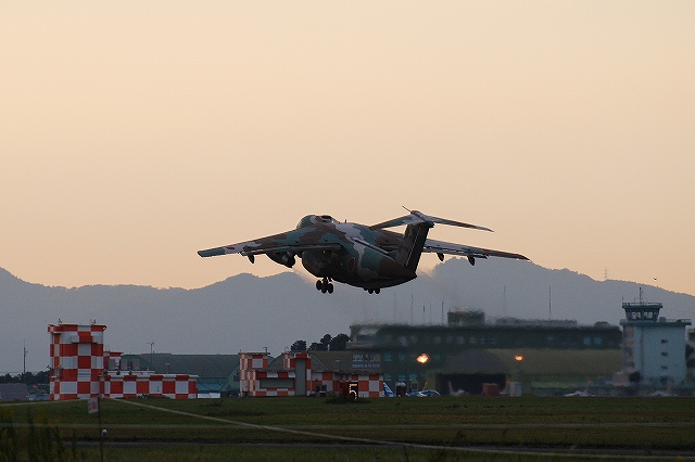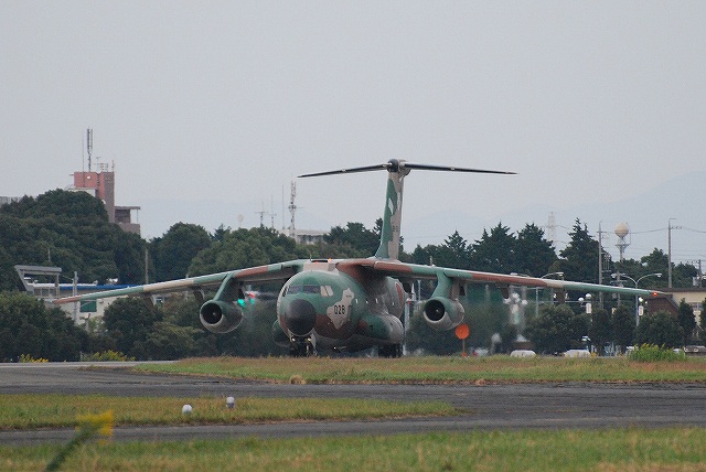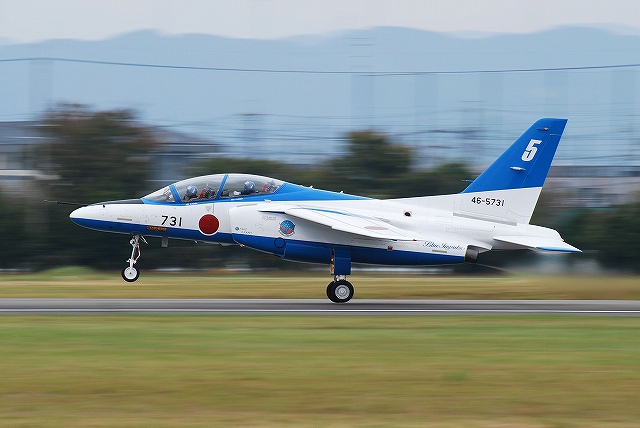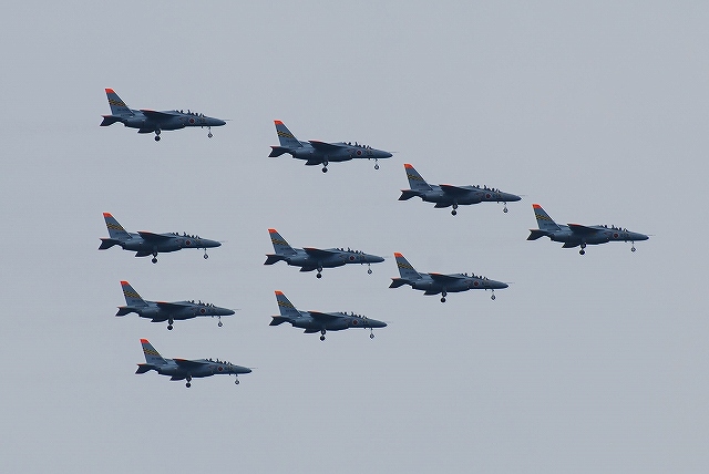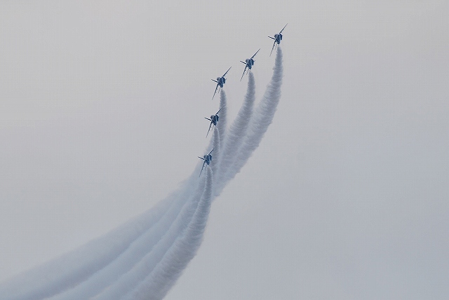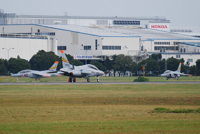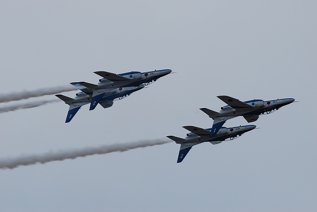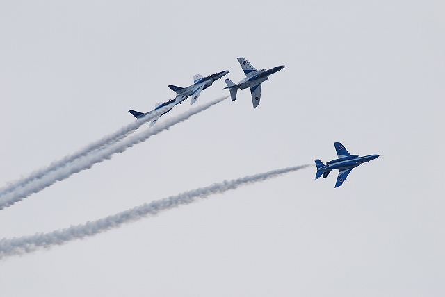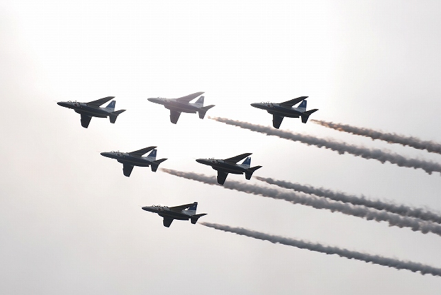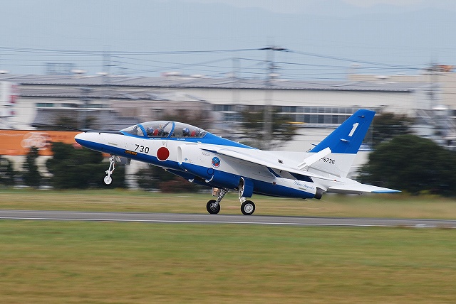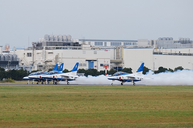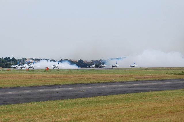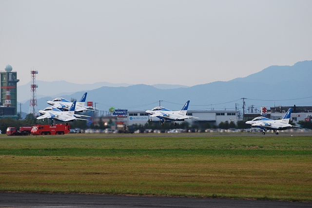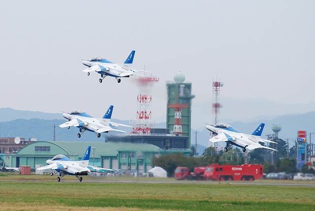 (左)静浜基地より飛来したT-7×2機による航過飛行 (中・右)小松基地飛来したF-15×2機による機動飛行 岐阜基地より飛来したF-2B×1機による機動飛行 (左・中)大編隊飛行へ向けて次々とT-4が離陸 (右)予備機だったらしいT-4×1機が、各機の離陸後タキシングしていった (左)T-4×10機によるデルタ編隊 (右)大編隊飛行を終えて着陸するT-4 以上で午前の飛行展示は終了。 午後の飛行展示はブルーインパルスによる曲技飛行 (左)離陸する1~4番機 (右)離陸する5番機 曇天だった物の、立体系を含む演技を実施してくれた (左)ローリングコンバットピッチで編隊を解く (右)着陸する1番機 通常は6機+予備機1機の7機で展開することが多いブルーインパルスだが、今回はブルー50周年記念で歴代使用機を並べての地上展時が有った為、それように更に1機をプラスした8機体制での展開だった。 (左)よって、帰還の為の離陸を前にしたスモークテストも8機で実施。 (中)先に1~4番機が離陸 (右)続いて5~6番機+尾翼にポジションナンバーの入っていない2機が離陸 ブルーインパルスの支援要員及び機材を搭載していたと思われるC-1が離陸。 地上展示されているのが遠望出来たRF-4が離陸するのも撮影したかったところでしたが、帰還は翌日以降のようでしたので、これにて撤収としました。 当日お世話に成った皆様有り難うございました。 PR