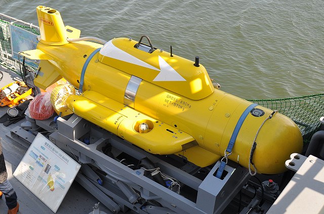 (右)後甲板のPAP-10Mk.5 機雷処分具。海中/海底にある機雷の処分等に使用する、いわば「水中ロボット」。