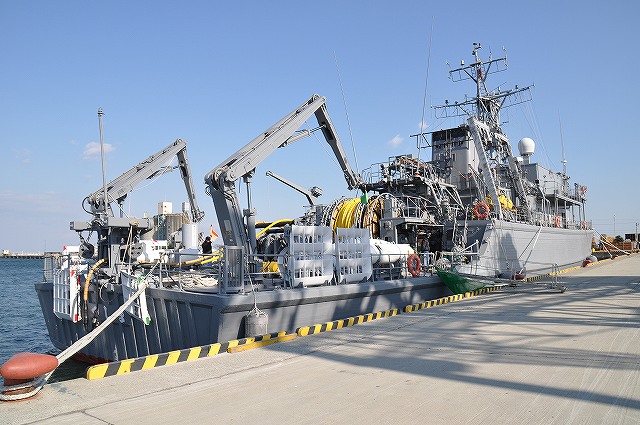 (左)水中処分母船とは、(海中で見つかった)機雷や不発弾の処理を任務とする水中処分員の母船で、かつては古くなった掃海艇を充てていたそうですが、現在は専用の母船が作られています。