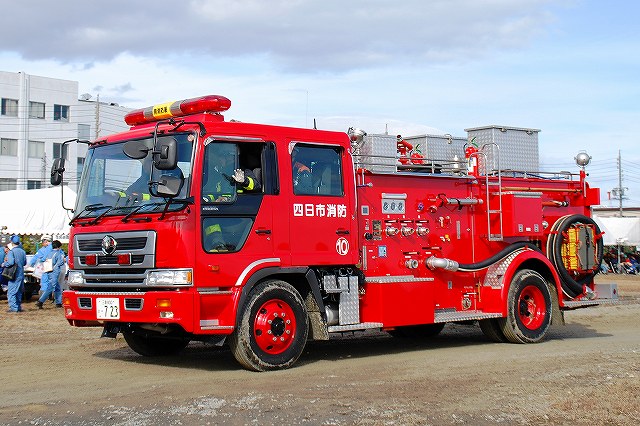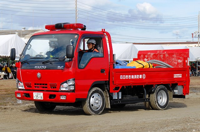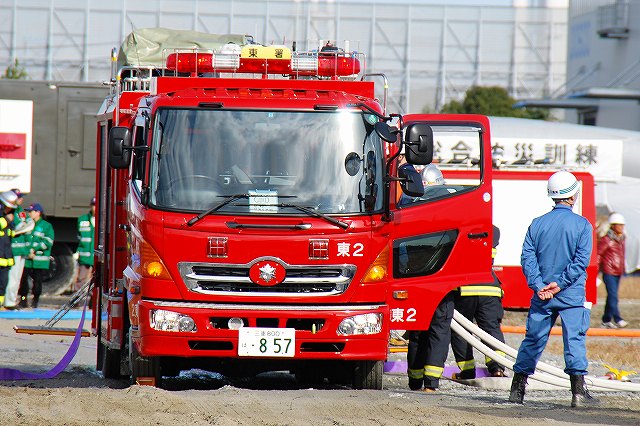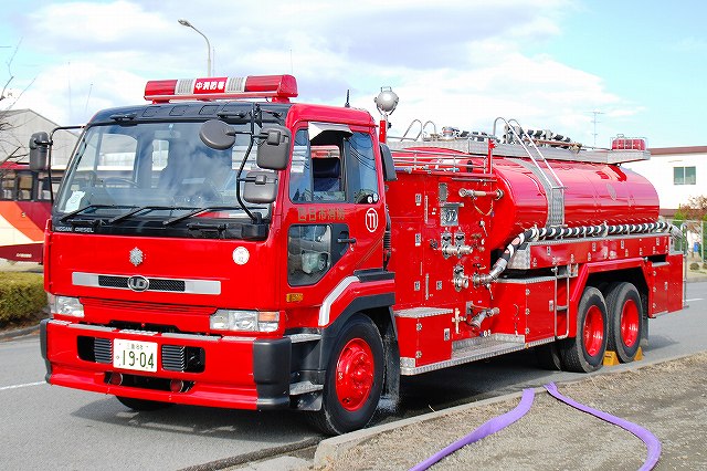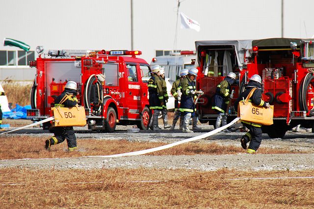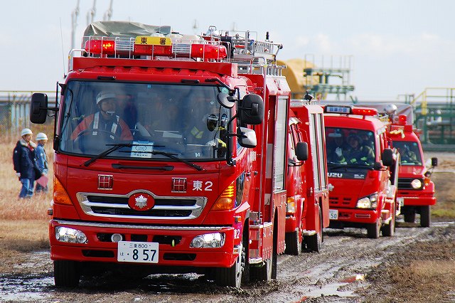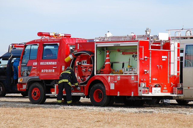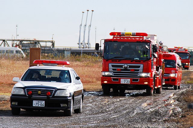 (左)先頭を行くパトカーには、防護服を着用した警察官が乗車している。 (中)四日市消防の消防車など (右)志摩消防の救急車 (左)奥伊勢消防署の消防車から機材を降ろす (中)画面左では除染用のエアテントを組み立て中、画面中央では与圧式防護服を着用中、画面右では現場指揮本部を設営中。 (右)防護服を着用した消防士が、伊勢消防の消防車より担架を下ろす (左)ホットゾーン(汚染区域)への進入は与圧式防護服を着用した人のみで行う。 オレンジ色の防護服は消防の救出部隊。 (中)青色の防護服は警察官のよう。 原因物質を回収するための容器等を携行している。 (右)救出した要救助者に続き消防士がホットゾーンより出ようとしている。 ホットゾーンから退出するには、必ず除染作業を受けなければならない。 (左)現場の除染作業に向かう消防士。 汚染物質が取り除かれたからか、与圧式ではない防護服のみを着用。 (中)訓練を終えて退場する四日市消防の消防車。 (右)同じくトラック(機材運搬車…とでも言うのかな?) 写真は中部電力の作業車が(仮の?)電柱を立てている所。 訓練の最後は火災を想定した一斉放水。 (左)訓練参加の各車が進入してくる (中)伊賀消防のポンプ車 (右)「現場」付近に消防水利が無い為、水源よりホースを延長する。 (左)伊賀消防のホンプ車が、途中で中継(と言う表現でいいのかな?)をしていた。 (右)放水中。 火災鎮火をもって全ての訓練が終了。 (左)会場外に居た四日市消防の水タンク車。 (右)消防水利より水を汲み上げていた四日市消防のポンプ車。 ともに、放水用の水を提供していたよう。 当日お世話になった皆さん有難うございました。 |