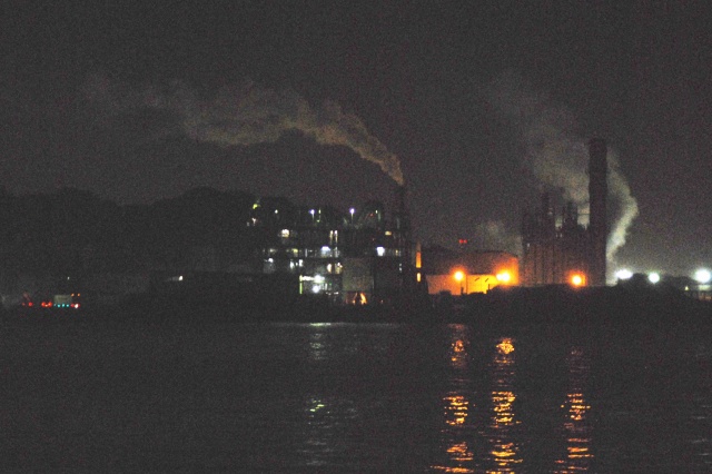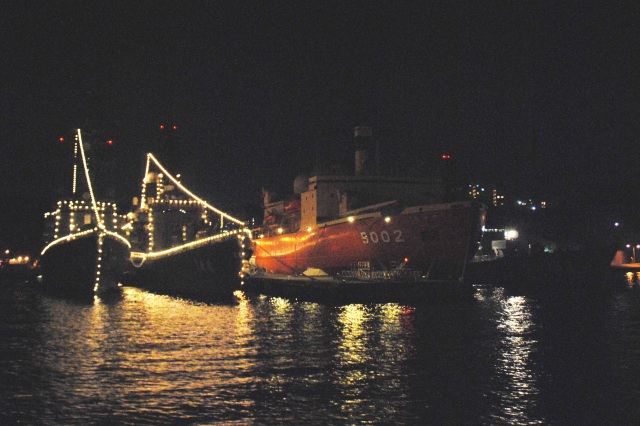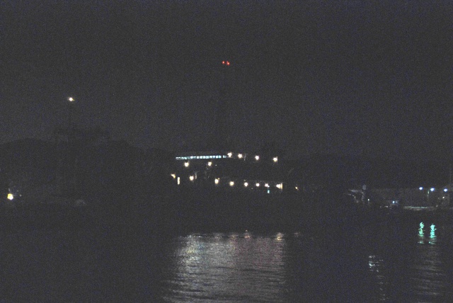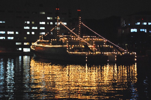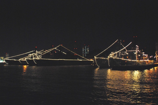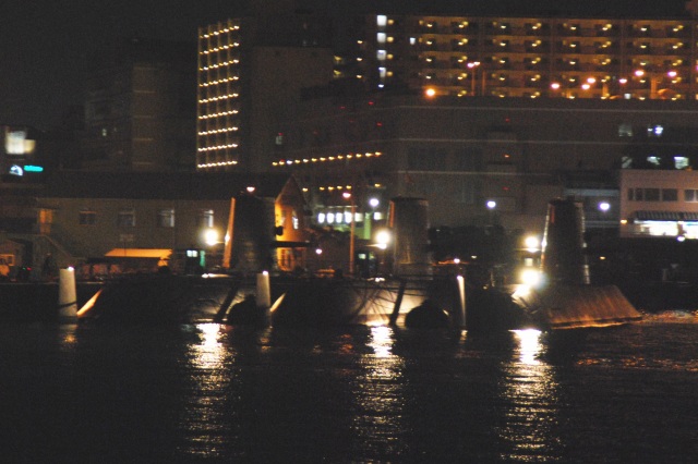 (左)比較的暖かい日が続いていたのですっかり忘れていたけれども、暦はそろそろ晩秋と言って良い時期に差し掛かっておりそ、れなりに暗くなるのが早くなっているわけで。一部の艦艇がフライングで(?)電灯艦飾を点灯し始めた辺りでも、夕焼けの残滓がかろうじて残っていると言う感じで… (右)…1800時に正式に(??)電灯艦飾に点灯される頃には完全に真っ暗に。 これは苦しい戦いになりそうだな~…と思いつつ、 かような次第なので、今回何時にも増してお見苦しい写真ばかりなのはご勘弁ね(^。^;) そんなこんなで遊覧船出港。 米軍側に接岸していた海自の「おやしお」型潜水艦×3隻 (左)昼間の軍港巡りと違い今回は「外海」には出ずに、新井掘割水路を通り吉倉(横須賀本港)-堀越(長浦港)間を往復するコースで、船のスピードもゆっくり目。 写真は追浜方向に見えた「工場萌え」な光景。 (右)堀越地区に居た「まつゆき」 「はたかぜ」と「ちはや」 (左)「はたかぜ」と「ちはや」を後から (中)「ゆうべつ」と「ゆうばり」 (右)電灯艦飾を実施していなかった「にちなん」は闇に溶け込んでいた (左)船は吉倉へと戻る。 画面手前の「あさゆき」と旧「しらせ」は電灯艦飾を実施していなかった。 (中)Y1~Y3バースの各艦艇。 画面右端は観閲艦を勤めた護衛艦「くらま」。 (右)電灯艦飾の灯りにて旧「しらせ」が照らしだされている。 (左)Y1Y2バースの各艦艇 (中・右)一番手前はイージス艦「あしがら」 …なのですが、もう少しレポートにお付き合いくださいませ。 つづく。