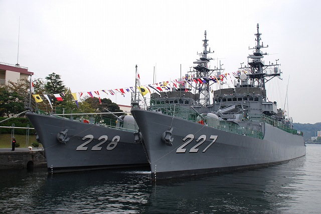 「あの報道は全く根拠がありません。」との事だそう。 詳しくは上記リンクをご参照。 情報提供いただいたはるな様有り難うございました 約40機の導入想定 まだ開発中のF-35なので、導入は(早くて?)2010年代半ばになりそうとの事ですが、F-4の減衰に間に合うのんか? 写真は昨年の国際航空宇宙展に展示されていたF-35(左側)とF-22(右側)の模型 軍ヲタの塩分の補完 すなわち、観艦式ウィークは続いていた だが、当日の公開艦艇全てを回るにはあまりにも時間が足りない よって今回は、ゆうばり型と呼ばれる護衛艦 彼女達のみを見学することにした 「ゆうばり」型護衛艦は、1隻のみ建造された「いしかり」型(既に退役)の船体を約6m延長した沿岸警備用の小形護衛艦(DE)で、昭和58年と59年に各1隻が就役したが、小形に過ぎるため以降DEの建造は「あぶくま」型へと移行した。 就役以来26年が経過している為、退役の日も近いと思われる。 写真では左がDE228「ゆうべつ」、右がDE227「ゆうばり」。 尚、艦内は撮影禁止だった為、「外」の写真のみです。 ・ゆうばり型護衛艦 規準排水量:1,470t 全長×幅×深さ:91.0×10.8×6.2m 喫水:3.6m 速力:25kt 軸出力:22,500hp (ガスタービン/ディーゼル各1基 2軸) 乗員:95名 主な兵装:76mm速射砲×1/SSM4連装発射管×2/ボフォースロケットランチャー×1/3連装短魚雷発射管×2 (左)「ゆうばり」型の萌えポイントはボフォース対潜ロケットランチャー…って、整備の為か2つとも横向いてるな~ (中)先ずは「ゆうばり」より見学。 「ゆうばり」型の艦尾にはハープーン対艦ミサイル発射管が装備されている。(最大各4発搭載可能) (右)上甲板に装備された短魚雷発射管。 (左)チャフロケット発射機 (中)「ゆうばり」のボフォース対潜ロケット発射機。 スウェーデン製の装備でかつては多くの護衛艦に装備されていたが、今では「ゆうばり」型2隻に装備されているものを残すのみ。 (右)「ゆうべつ」の76mm速射砲 (左・中)「ゆうべつ」の後甲板 「ゆうばり」型後部の一段高い場所には「将来装備」とされている20mmCIWS用のスペースが確保されているが(「いしかり」型よりの改良点の一つ)、実装されること無く引退することになりそう。 (右)「ゆうべつ」の前甲板 (左)整備中だった「ゆうばり」のボフォースが真上を向いていた (中)真横を向いていた「ゆうべつ」のボフォースを後から。 発射管内側後端にはグリスのようなものが塗られている。 (右)ボーフォース搭載艦があと2隻ということは、コレが有るのもあと2隻ということね。 (左)「ゆうべつ」の時鐘 永年使い込まれ磨かれて来たので、文字が消えかかっている。 (右)艦橋ウイング部分の双眼鏡 「ゆうべつ」は艦橋トップまで上がる事が出来た。 (左)射撃指揮装置 (右)FLIR(赤外線暗視装置) (左)「ゆうばり」のボフォースを上から (右)「ゆうべつ」の前甲板上にはロープにて錨が描かれていた。 見学を終えて陸へと戻る。 (左)今度は「ゆうべつ」のボフォースを整備中。 (右)「ゆうばり」に小船を横付けしてゴミを回収中。 色んな人の尽力が有って観艦式が成り立っていることを改めて実感。 …と言う事で、これにて横須賀より撤収しました。 遠征中お世話になった皆様大変有難う御座いました。