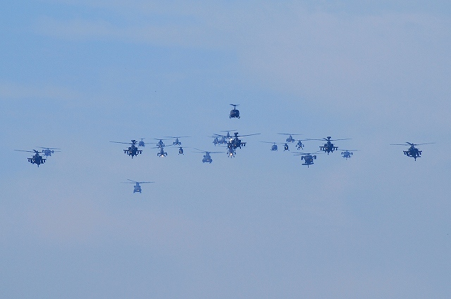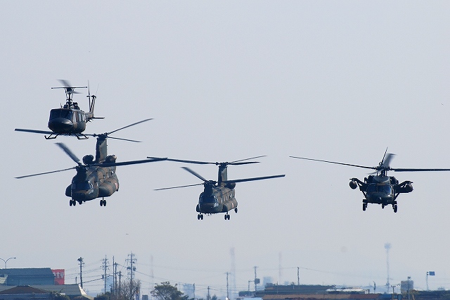 開場後に飛来した外来機 海保の中部空港海上保安基地より飛来したベル212「かみたか」。 三重県警のアグスタAW109「いせ」 「航空祭」と言っても、他の陸自駐屯地祭同様先ずは観閲式展がある。 (左)観客席正面に駐機していたアパッチが飛行前の点検を始めた。 開いたエンジンカバーがそのまま作業の足場に有る辺りが、米国で設計された機体っぽい合理性だナー…と思ってみたり。 (中)音楽隊の皆さんを先頭に隊員の皆さんが入場。 (右)巡閲 …と、ここまで撮った所で、今回は何時もと違う写真を撮ろうと思い切って陣地変換をしてみる。 (左)移動している間に式展は終わり、国旗が退場してゆく。 (右)観閲飛行の離陸へ向けた準備が始まる。 離陸するアパッチ (左)離陸するOH-1 赤白塗装の機体はOH-1初号機 (右)白黒塗装の機体はOH-1弐号機 離陸するAH-1Sコブラ (左)離陸するUH-1/CH-47/UH-60 (右)上空を飛ぶ旅客機と重なった 離陸した各機は大編隊を組んで戻って来る。数えると27機が参加していたよう。 (右)会場上空を通過した大編隊は、ゆるく右旋回ていった。 つづく。 PR