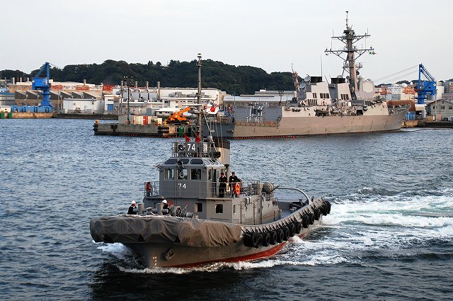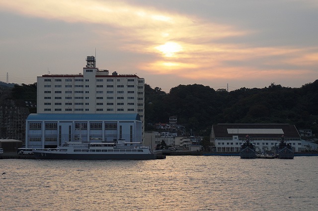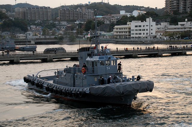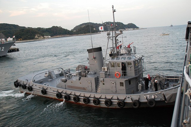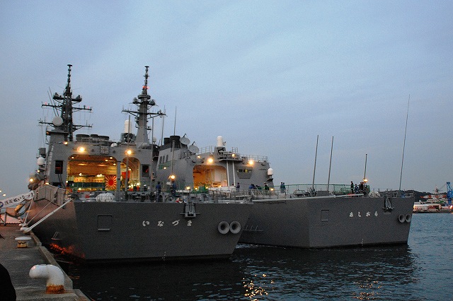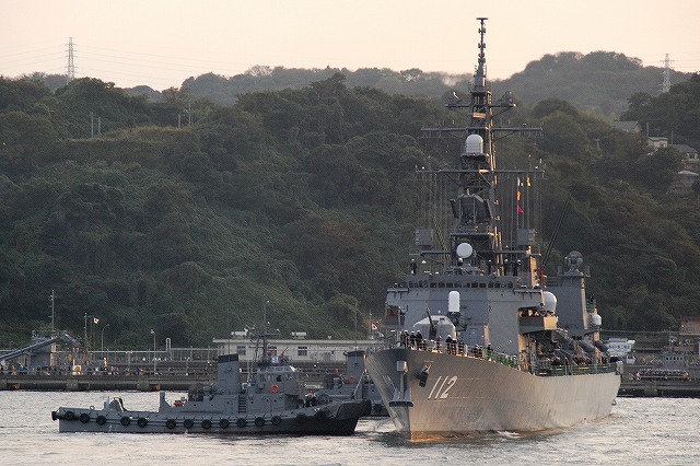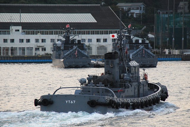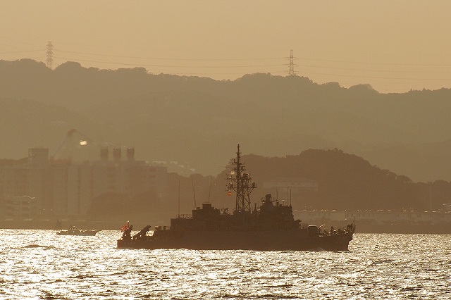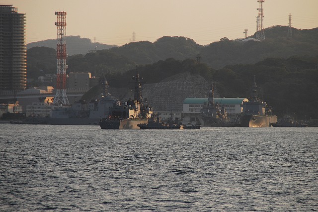 (左)夕日に照らされる、大忙しな吉倉桟橋の状況。 Y1バースには「あしがら」が、Y2バースには「うらが」が、Y3バースへは「まきなみ」がそれぞれタグボートの支援を受けて入港作業中。 (右)私の乗る「ぶんご」はY2バースの「うらが」の横に付ける筈なので、当然暫く沖合いで待機。その間に入港に向けた準備が進む。 (左)入港作業中の「まきなみ」 (中)一仕事終えたタグボートが「ぶんご」に近付いてくる (右)「ぶんご」に取り付かんとするタグボート。背後には米海軍のアーレイバーク級イージス駆逐艦が見える。 (左)0755頃に出港し、横須賀に戻ってきたのは夕日が沈もうとしている1700頃。約9時間の「航海」だった。 (中)他の艦の入港支援を終えて帰ってゆくタグボート。 背後には既に帰還していたミサイル艇が見える。 (右)Y2バースには既にDD122「まきなみ」とDDH144「くらま」が入港していた。 (左)海保「おりおん」型監視取締艇と海自の運貨艇。 「おりおん」型は横須賀配備の「かしおぺあ」かな? (中・右)タグボートと連絡を取り合い接岸する (左)「ぶんご」の入港支援を終えてタグボートが離れる (中)実施海面周囲の警戒艦をしていた1隻、AMS4305多用途支援艦「えんしゅう」が入港してきた。 (右)港内でゴムボートに乗り転落者発生に備えていた水中処分隊の皆さん。 接岸後暫くして上陸。下艦の順番を待っている間に日没時の自衛艦旗降下があったりした。 (左)Y1バースに接岸していた「いなづま」と「あしがら」。 朝にはいた「さわゆき」は何処へ行ったの?(^。^;) (中)Y1/Y2バースの各艦艇。 港に戻ってきても今日の仕事は終っておらず、各艦では翌日の一般公開/満艦飾/電灯艦飾に向けた準備が行われていた。 (右)完全に暗くなってきてから戻ってきていた潜水艦をヴェルニー公園より撮影。 …と言う訳で、長々と続けてきた観艦式予行その2レポートは終了です。最後までお付き合いいただき有難う御座いました。 そして、最後になりましたが当日お世話に成った皆様有難う御座いました。