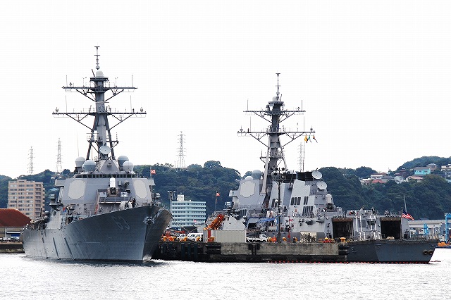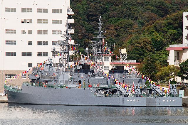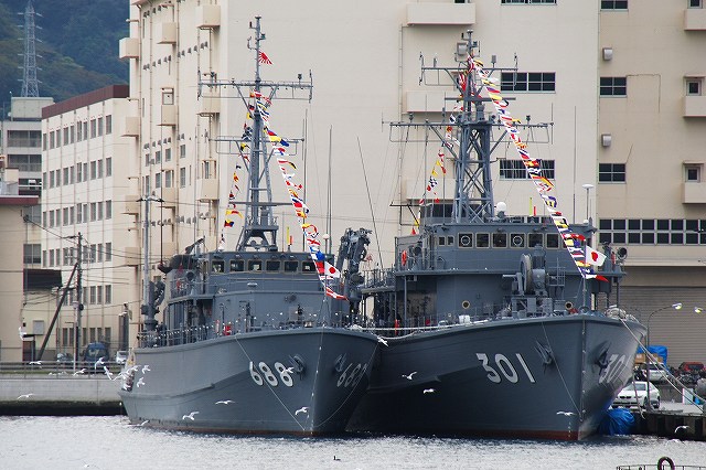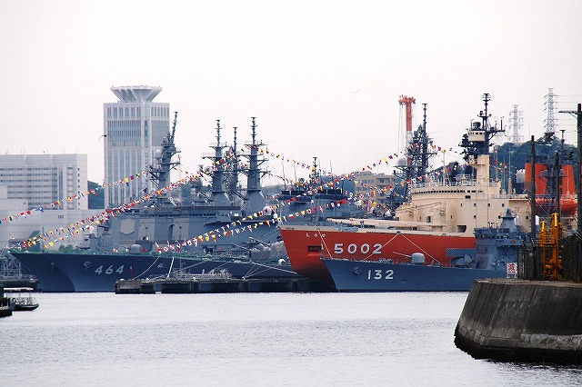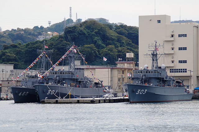 (左)海自横須賀基地船越地区に接岸していたASE6101試験艦「くりはま」 観艦式には警戒艦として参加した。 (中)護衛艦「はたかぜ」 (右)護衛艦DE227「ゆうばり」とDE228「ゆうべつ」 (左)潜水艦救難艦「ちはや」と護衛艦「はたかぜ」 (中)MSC688掃海艇「あいしま」MSO301掃海艦「やえやま」及びMSO303掃海艦「はちじょう」。 当日の横須賀では、観艦式参加艦艇を中心に満艦飾を実施していたが、観艦式に参加しない艦艇や、警戒部隊として参加のため当日午後に出港が予定されていた艦艇等一部は満艦飾を実施していなかった。写真では「はちじょう」がそれにあたる。 (右)「あいしま」と「やえやま」の前を水鳥の群れが横切る。 (左)観艦式参加艦艇に席を譲り、通常では接岸しないと思われる民間用の長浦港市営埠頭に接岸していた、AGS5105海洋観測艦「にちなん」。 (中)艦首のバウ・シーブ(音響観測用)が特徴的。 (右)帝国海軍が開削した新井掘割水路を通り、吉倉地区(横須賀本港)へと戻る。 (左)ミサイル艇PG827「くまたか」とPG826「おおたか」。 どちらも観艦式参加艦艇だが満艦飾は実施していなかった。 (中)水中処分母船YDT03 (右)AMS4305多用途支援艦「えんしゅう」。「えんしゅう」は警戒艦として観艦式に参加。 その奥には満艦飾を実施した特務艇「はしだて」が居る。 (左)吉倉桟橋の各艦艇。 (右)Y4バースの各艦艇。 手前のDD132護衛艦「あさゆき」は観艦式に参加しなかった。 その隣は旧「しらせ」。昨年の除籍以来、処遇が決まらないまま吉倉のY4バースに係留されていたが、先日ウェザー・ニュース社へ売却される事が決定し、来年3月に千葉へと回航(曳航)されるそう。 (左)吉倉Y2/Y1バースの各艦艇。 (右)吉倉Y3/T4バースの各艦艇。 (左)Y3バースにはDD122護衛艦「まきなみ」とDDH144ヘリコプター搭載護衛艦「くらま」が居た。 (中)Y2バースには2隻の掃海母艦MST463「うらが」とMST464「ぶんご」が居た。 「ぶんご」にのみ76mm速射砲を装備。 (右)Y1バースには3隻の護衛艦、DDG178イージス艦「あしがら」/DD105護衛艦「いかづち」/DD125「さわゆき」が居た。 「さわゆき」は観艦式の予備艦。 つづく。