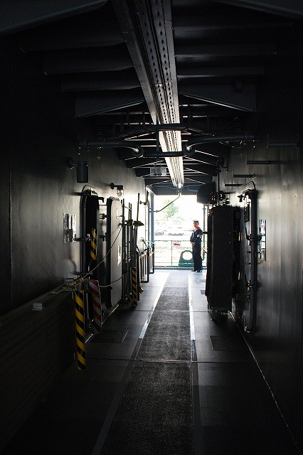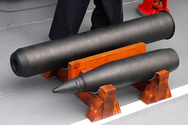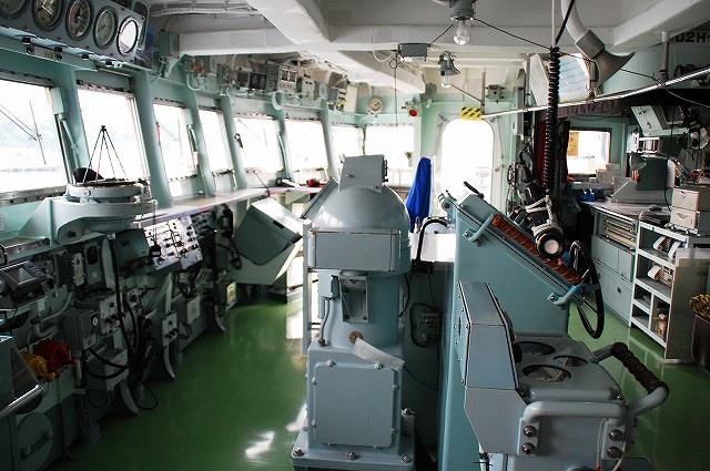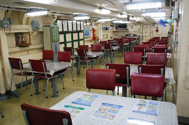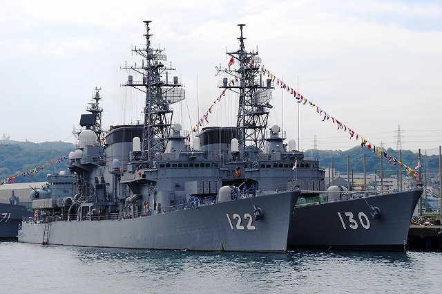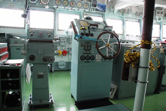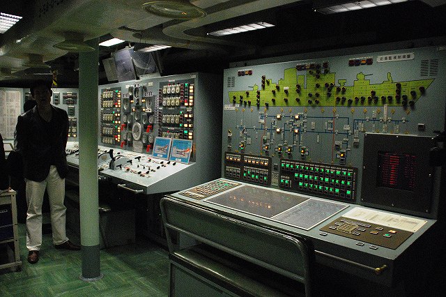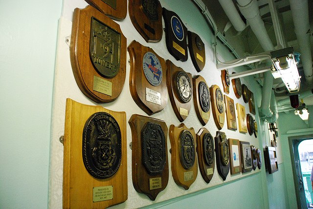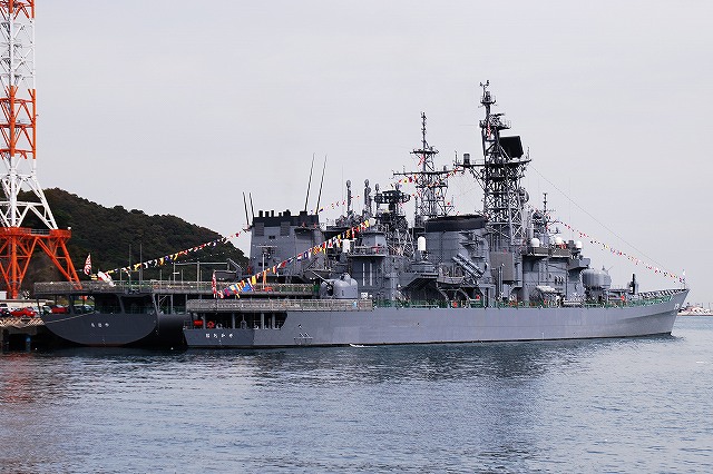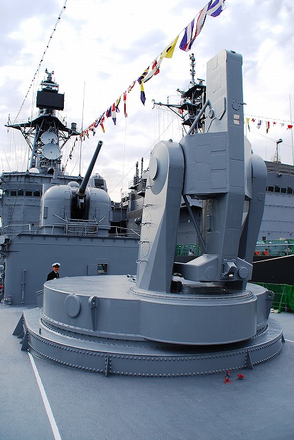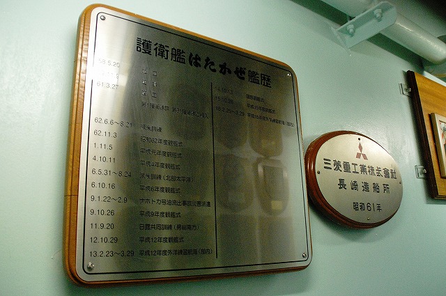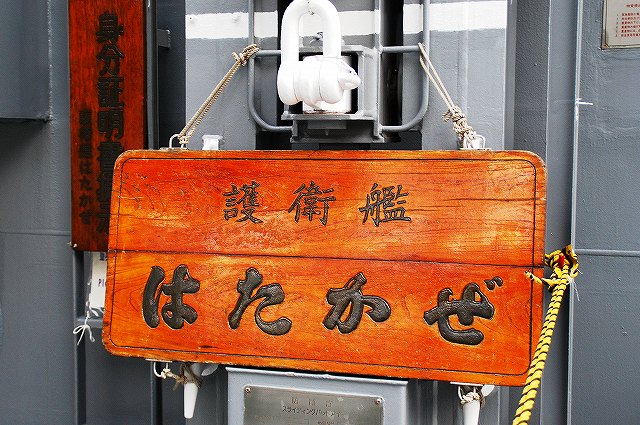 (左)護衛艦「たちかぜ」の左舷錨が保存・展示されてあった。 (中)警戒部隊として観艦式に参加し掃海艇MSC681「ずかしま」/MSC683「つのしま」とLCU2002輸送艇2号等。 (右)その他当日の船越地区には多くの観艦式参加艦艇が接岸していたが、公開の「お当番」は「はたかぜ」だった。 (左)科員食堂 (中)食堂に展示されていた2代目「はたかぜ」の模型。 初代「旗風」は太平洋戦争に参戦した駆逐艦、2代目「はたかぜ」は海自創設期の昭和29年に米軍より駆逐艦「メイコム」の貸与を受け昭和44年まで使用された。 今日の「はたかぜ」は3代目にあたる。 (右)機関室 (左)何となくレトロな感じの洗面台 (右)「はたかぜ」の前方に接岸していたDD130「まつゆき」とDD122「はつゆき」。 (左)ターターランチャーと有人式の5インチ速射砲。 どちらも絶滅危惧種となりつつある装備。 (中)アスロックランチャー (右)5インチ砲の模擬弾。 黒一色のものは始めて見たカモ? (左)艦内の通路に飾られていた、交流の有った艦艇等の楯。 (中)カナダ海軍のフリゲート艦、「バンクーバー」の楯。 2001年の「バンクバー」名古屋寄港の際にホストシップを勤めた時のものかな? (右)「はたかぜ」の銘板等。 「はたかぜ」は三菱重工長崎で建造され、昭和61年に竣工している。 (左)艦橋。 (中)天井からは伝声管が延びていた。 (右)艦橋から前方を望む。 艦首にはターターランチャーを波浪から守るためブルワークが設けられている。 (左)後部の5インチ砲 (中)「はたかぜ」の隣にはASR403潜水艦救難艦「ちはや」が接岸しており、そちらは一般公開をしていなかったものの搭載しているDSRV(深海救難艇)は格納庫から引き出されており、「はたかぜ」艦上より良さげに撮影することが出来た。。 DSRVは遭難し着底した潜水艦にドッキングし、その乗員を救出するための潜水艇。 (右)「ちはや」を陸側にしてメザシになっていたので、「はたかぜ」への出入に際しては「ちはや」の通路を通過した。 (左)満艦飾を実施していた輸送艇2号 (右)艦橋のトップには20mmバルカン砲を搭載していた つづく。