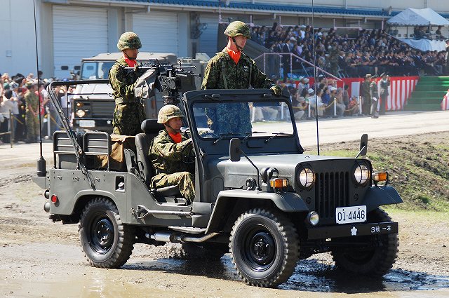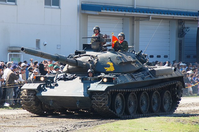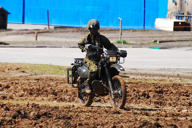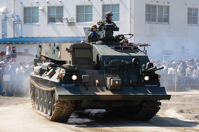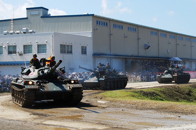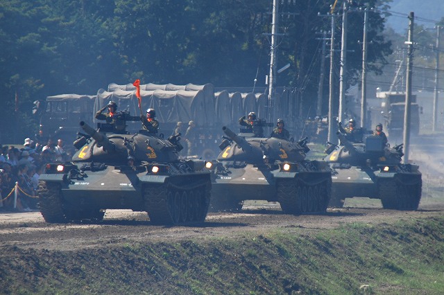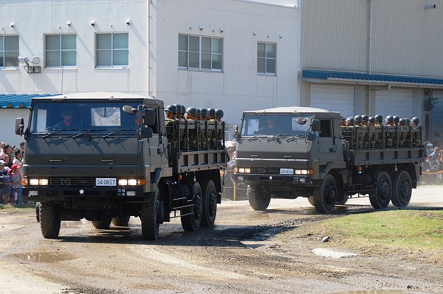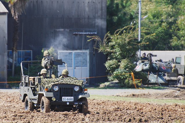 (左・中)この半年ほどですっかりお馴染と成ったPAC3の模擬弾を搭載したペトリオット発射機。 饗庭野に駐屯する空自第12高射群よりの展示。 (右)第10戦車大隊のマーキングをつけた96式装輪装甲車。 中部方面移動監視隊の各車両 (左)地上レーダ装置1号P23(手前)と広域用監視装置「千里眼」。 P23は高機動車に搭載されている。 (中・右)千里眼は中型トラックに搭載。 アウトリガーにより車両から降ろして設置する事が出来る。 航空機の展示会場 (左)第5対戦車ヘリ隊(明野)のAH-1Sコブラ。 (中)コブラの横に置かれていた給油用のポンプ (右)第3飛行隊(八尾)のUH-1J 第3飛行隊のOH-6D 体験試乗を実施していた74式戦車 (左)第3と第10の各戦車大隊より2両ずつの74式戦車が登場。 そのうち1両はドーザーブレードつきの車両だった。 (中・右)流し撮りをしてみる。 その他駐屯地で撮影した色々… (左)ジープとパジェロ (右)パジェロのワイパーの先端に赤とんぼが止まっていた (左)保存されている各種装備。 右から74式戦車、61式戦車、155mm榴弾砲M1。 (中)61式戦車と155mm榴弾砲M1 (右)155mm榴弾砲M1 右から新戦車(?)、96式装輪装甲車、犬。 戦車は第10戦車大隊の、装輪装甲車は第3戦車大隊の所属表記が入っていた。 最後になりましたが、当日お世話に成った皆様有難う御座いました。 写真は音楽隊の演奏等アトラクションの間に現れた仮設敵の皆さん。 だった4名で、航空機と火砲等にて増強された2個戦車大隊に立ち向かう勇者たちです。 そんなこんなで状況開始 (左)先ずはOH-6が航空偵察 (中)地上レーダ装置1号 P23がアンテナを展張する (右)レンジャーの降下を掩護する為にAH-1Sコブラが登場 (左)降下用~意 (中)降下! (右)離脱するUH-1J後方ではAH-1Sが掩護中 (左)続いて、地上部隊による偵察。 偵察バイクの乗員が、走行しながら89式小銃を発砲。 地面は観閲行進時に戦車に掘り起こされてボコ×2になっている。 (中)ジープに搭載したMINIMIを発砲中。 画面右奥には出番待ちの74式戦車が見える。 (右)幌枠を転落防止柵の代わりにしているよう。 (左)第3偵察隊(千僧)の87式偵察警戒車も登場した。 (中)第3特科連隊(姫路)のFH70 155mm榴弾砲登場 (右)発射! (左)パンツァーファストとMINIMIを構える仮設敵。 後に居る赤い目印の無い人は、着弾をシュミレートする発煙筒を投げる係りの人。 (中)74式戦車登場 (右)3両が同時に発砲 (左)増援の74式戦車と軽装甲機動車が突入。 (中)敵後方を遮断する96式装輪装甲車 (右)上空からヘリの編隊も進入してきて状況終了。 状況終了後、各装備が引き上げてゆく。 (左)撤収の為方向転換中の74式戦車。後方では仮設敵の皆さんが引き上げ中。 (右)装備品展示の会場まで自走するFH70。 長距離の移動はトラックにて牽引されるが、陣地内等短距離の移動はこのように自走にて行う事が出来る。 装備品展示の為ヘリが着陸してくる。 (左)第5対戦車ヘリ隊(明野)のAH-1Sコブラ (中)第3飛行隊(八尾)のUH-1J (右)第3飛行隊のOH-6D つづく 今津には第3師団(千僧)と第10師団(守山)傘下の戦車部隊等が駐屯しており、それらの所属車両が順次行進してゆきます。 写真は観閲行進の先頭に立っていた、観閲部隊指揮官の乗る74式戦車など。 (左)第3後方支援連隊第2整備大隊戦車直接支援中隊の重レッカ車 (中)同78式戦車回収車 (右)第10後方支援連隊第2整備大隊戦車直接支援中隊の78式戦車回収車 中部方面移動監視隊の各車両 (左)地上レーダ装置1号 P23 地上の車両・人員や海上の艦艇といった移動目標を、中距離及び短距離で監視するための装備。 (中)全天候型監視室 上記各装置の運用を行うシェルタで、73式中型トラック(新)の荷台に搭載。 (右)広域用監視装置「千里眼」 可視カメラ及びサーマルカメラを搭載し、昼夜を通じて車両・船舶・人物等の移動を監視できる。こちらも、73式中型トラック(新)の荷台に搭載。 第3戦車大隊の各車両 (左)74式戦車と96式装輪装甲車 (中)この96式装輪装甲車には、12.7mm機関銃の下に部隊最先任軍曹のプレートがついていた。 (左)5.56mm機関銃MINIMIを搭載したジープ (左)訓練中の新入隊員の皆さんが乗った大型トラック。 (中)74式戦車が続々と… (右)観客に手を振っていった。 第10戦車大隊の各車両 (左)96式装輪装甲車 (中)偵察用オートバイ (右)5.56mm機関銃MINIMIを搭載したパジェロ 金シャチマークでお馴染第10戦車大隊の74式戦車。 つづく |