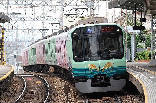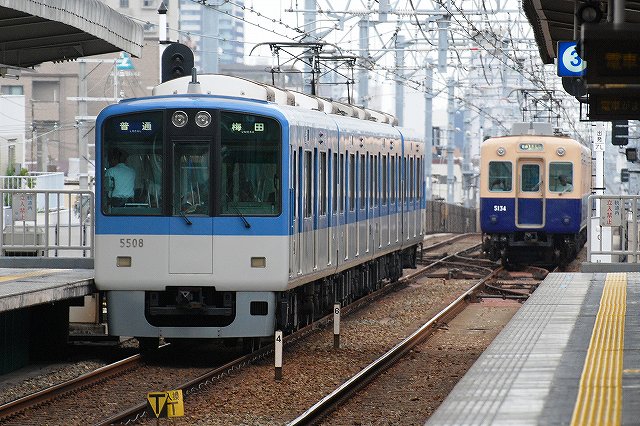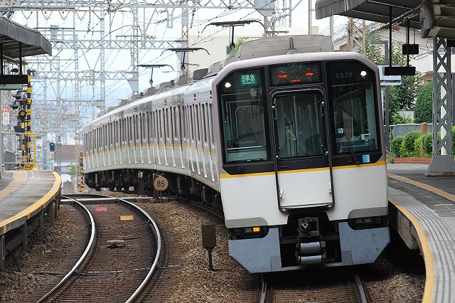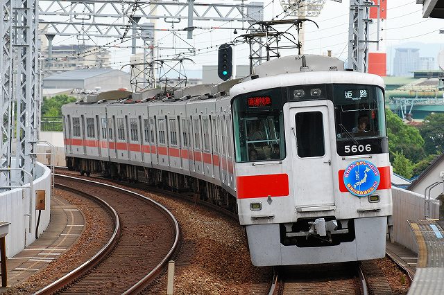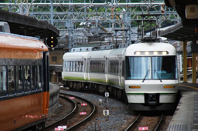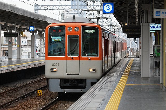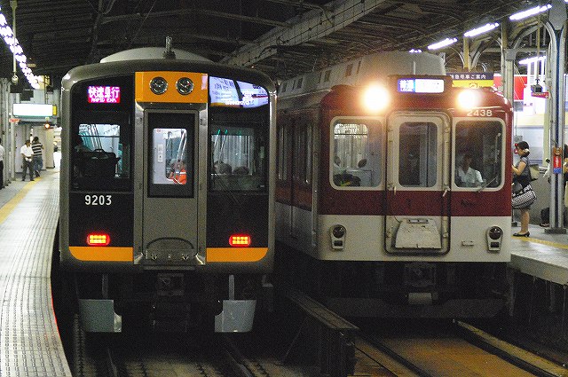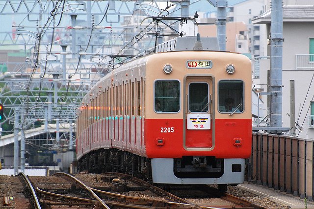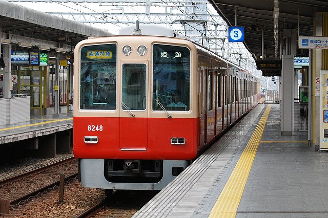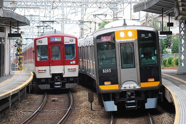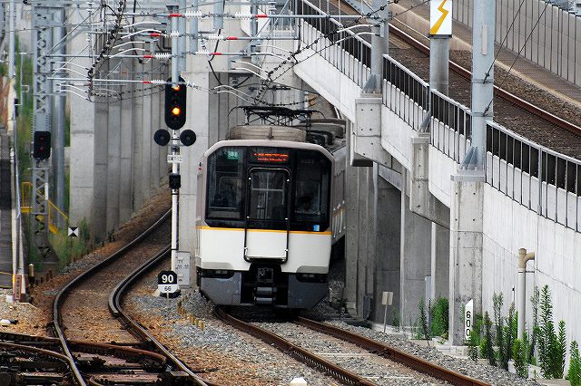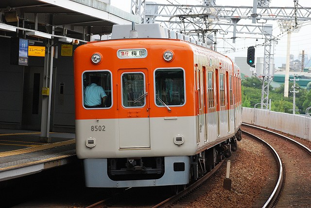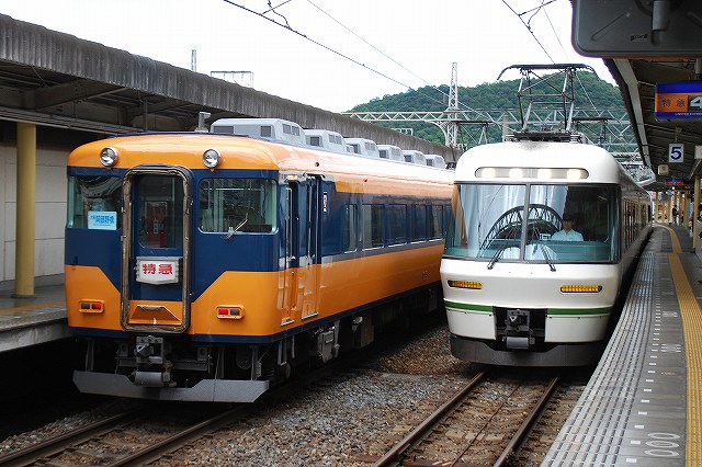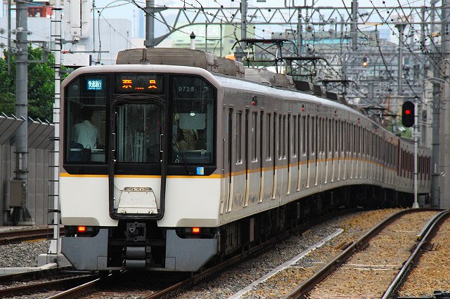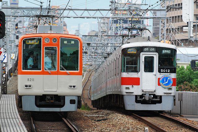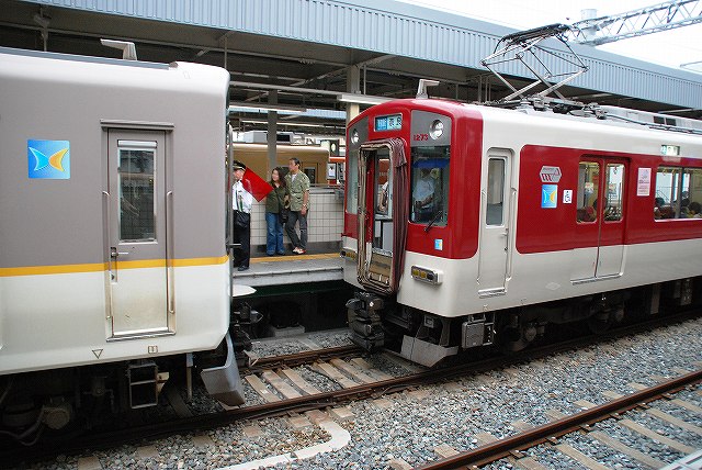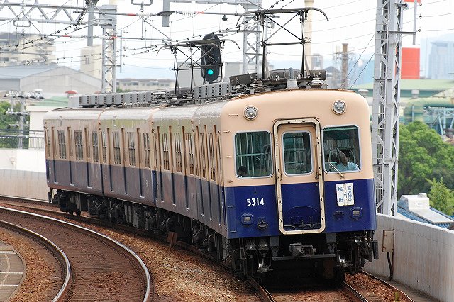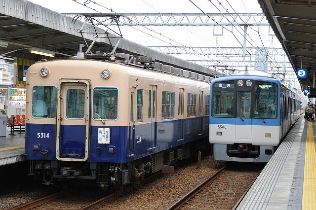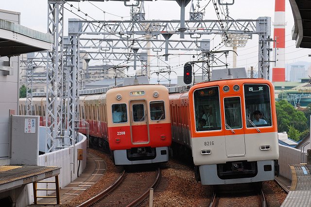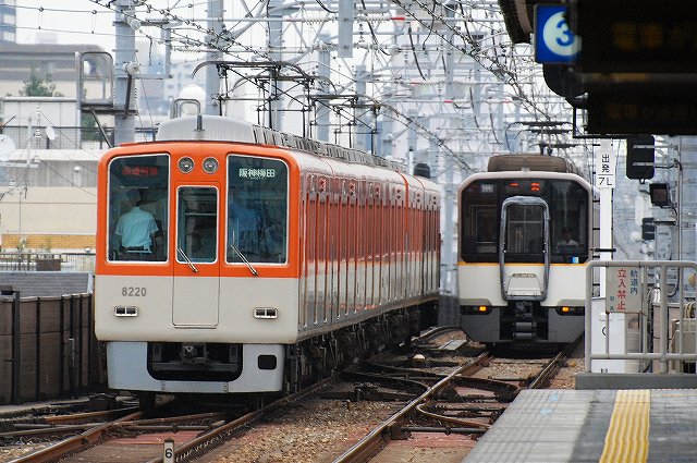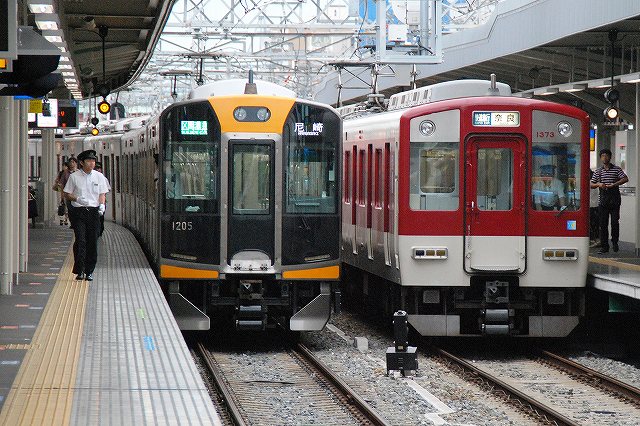 ・大石駅 阪神の車両は、最高速重視の走行性能でオレンジ系の塗装を纏った特急・急行系用の「赤胴車」と、優等列車の支障にならないよう加減速性能重視で、青系の塗装を纏った普通電車用の「青胴車」に大別される。 (左)阪神8000系と乗り入れてきた近鉄「シリーズ21」が擦れ違う (中)阪神9300系による山陽須磨浦公園行き特急。 助士席側(向って左側)の窓内側に、「高校野球」のマークを掲出している。 9300系は今の所阪神で唯一のセミクロスシート車(他はロングシート) (右)方向板を使用した5314以下の4連。 方向板、貫通幌、前パンタ…と、ワタシの好物が3つ揃った「顔」である。 (左)近鉄「シリーズ21」による奈良行き快速急行。 快速急行の表示はそれぞれの線区の表示パターンに合わせて、近鉄線内は赤地、阪神線内では水色地のものが表示される。 「シリーズ21」の場合種別は幕による表示なのだが行き先はLED表示で、比較的早いシャッタースピードで撮影すると(ワタシの場合、昼間は通常1/320か1/250辺りで撮影しています)表示がが欠けてしまうと言う厄介な仕様(^。^;) 折角今まで見られなかった行き先を表示していたりするのにね。 (右)老朽化していた「青胴車」を置き換えるため、2000年までに増備された5500系(左側)と従来型の「青胴車」。 (左)1000系による梅田行き直通特急。 1000系は近鉄のみならず山陽電鉄への直通運転にも使用されているよう。 つか、1000系のLED表示は撮影しても表示が欠けないなー。 (右)8000系@旧塗装車による山陽姫路行き直通特急 (左)高校野球のヘッドマークを掲出した2000系の特急が戻ってきた。 (右)8000系の場合は助士席側に、ちいさなマークを掲出。 (左)方向板使用の青胴車が戻ってきた。 梅田方の先頭に立っていた5143は方向幕を装備しているが、方向幕は「普通」を表示し、「相方」の5314に合せて方向板を使用している。 (右)よく見たらこの編成は、阪神独特のものだったバンドン式密着連結器を装備したままだった。 画面右側の5500系は、近鉄との相互乗り入れ開始に備えて廻り子式密着連結器へ換装済み。 ・尼崎駅 (左)なんば線ホームにて、1000系と増結用の近鉄車が並ぶ。 (右)スタンバイ中の増結車。 阪神本線:6両、なんば線及び近鉄奈良線は最大10両と編成の長さが異なる為、尼崎駅にて増解結作業を行う必要があるのだが、直通運転初日は(阪神電鉄では)不慣れな増解結作業により遅れが発生し、ダイヤの乱れは近鉄の名阪特急等にも波及したとの事。 だだし、今ではその作業もスムーズに行われている。 (左)本編成の「シリーズ21」×6連が入線。 (中)連結作業中。近鉄の阪神乗り入れ対応車には、蝶をデザイン化した識別のステッカーが貼られている。 増結車の戸袋部分にはそれに加え、VVVF車のマークや車椅子対応マークも貼られている。 (右)奈良へ向けて出発。 ・鶴橋駅 近鉄線内へと戻り、例によって帰りの特急を待つ間に少し撮影。 何時もは大阪上本町駅の地下(奈良線)ホームで撮影しているのだけど、今回は近鉄大阪線電車と阪神車の並びを撮影したくて、鶴橋駅のホームに立ってみる。 (左)早速、三宮行きの阪神1000系と国分(こくぶ)行き普通の並びが撮影出来た。 (右)こちらも国分行き普通列車。使用車種は「シリーズ21」のLCカー(ロング/クロスシート両用車)バージョンである5820系。 (左)難波行き急行と鳥羽行き特急@スナックカー。 (右)ラッシュ時のみ運転される松坂行き区間快速急行。 …と言うことで、時間が来たのでこれにて撤収しました。