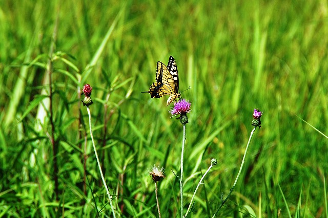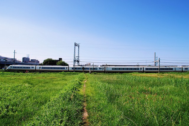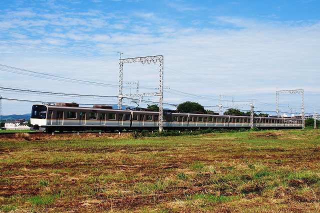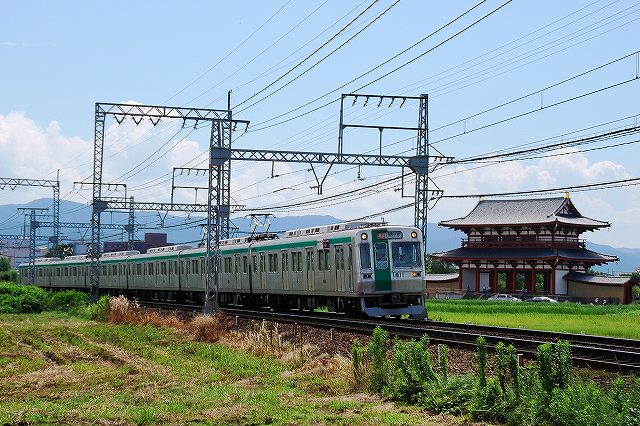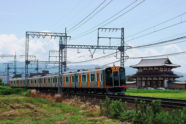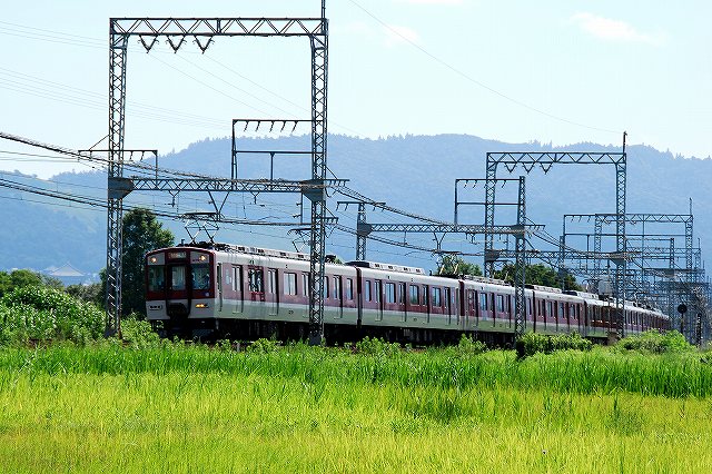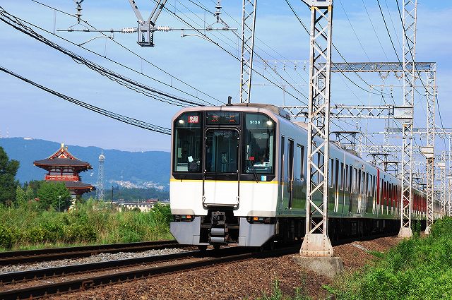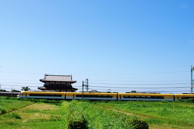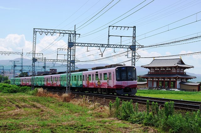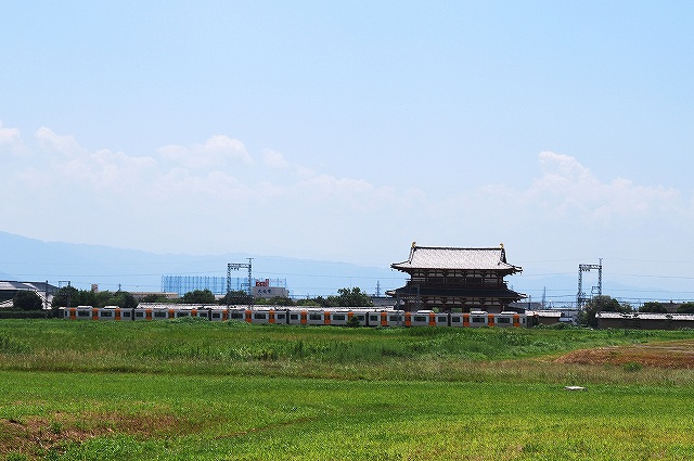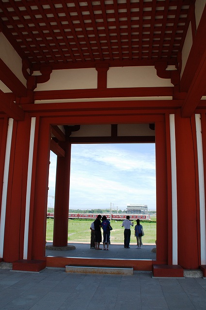 今は広大な原っぱ(※1)のようになっているおよそ1300年前(※2)の都の大内裏跡を近鉄奈良線が通過しており、行き交う電車を様々なアングルで撮影することができる。 で、今回の第一目標は乗り入れてきた阪神車。(^。^) ※1:甲子園球場30個分の広さだそう ※2:710年に藤原京より遷都 (左)近年奈良線線路の南側に再建された朱雀門が、良い撮影のアクセントになってくれそう。 (右)長閑な風景の中を21000系「アーバンライナーPLUS」が通過してゆく。 名阪特急以外にも奈良発着の特急にも使用されているよう。 (左)敷地もだけど、「空が広い」のも平城宮での撮影の魅力の一つ。 通過している電車は京都市営地下鉄乗り入れ対応の「シリーズ21」、3220系。 他の「シリーズ21」系列の車両と異なり、前面の貫通扉が向って左側にオフセットされているので(つまり、多編成のと連結を考慮していない)識別は比較的容易。 (右)阪神9000系がやって来た。 阪神大震災に被災したことにより発生した車両不足を補う為急遽増備され他形式だが、今回の近鉄乗り入用に抜擢され、帯の色がデビュー当初よりの赤色から同じく近鉄乗り入れ用の1000形に合わせたオレンジ色に変更されている。 (左)22600系「ACE」 22000系「ACE」のマイナーチェンジ型で、老朽化してきた12600系「スナックカー」を置き換えるため今年より増備が始まった新型特急車。 まだ先行車としての10両のみしか製造されていないので、汎用特急車の広い運用範囲を考えると撮影できて割とラッキーかも? (右)23000系「伊勢志摩ライナー」を朱雀門を背景にして撮影。 (左)線路の南側へ移動。 シリーズ21に押されつつも、まだまだ頑張る8000系が通過して行った。 (中)6両編成の9000系に1000系2両を増結した阪神車。 6両が最大の阪神本線内では見る事ができない編成。増結車用の車両は1000系のみ。 (右)こちらも9000系+1000系の編成だが、9000系の方は神戸への観光をPRしたラッピング編成。 (左)確かこの辺りで、東大寺の大仏殿を背景に入れて撮影できるポイントが有った筈…と、曖昧な記憶を頼りに何の目印も無い原っぱをウロウロすること暫し、ようやくそれらしき場所を探し当てる。 一番手前の架線柱の左側に小さく大仏殿が写ってます。 (右)近鉄名物、2階建車を連結した30000系「ビスタEX」(ビスタカー)。 編成右側に第一次大極殿再建工事の現場(後述)が見える。 先ほどのラッピング編成が戻って来る (左)大仏殿と阪神電車って写真が撮れる日が来るとはね~ (右)緑の中を走り抜けてく阪神電車(^。^) 阪神沿線ではお目にかかれない光景だな~。 (乗り入れ先の山陽電鉄ならありそう?) (左)先ほどからチラチラ登場の朱雀門。 いわば平城宮の正門みたいなもので、入場料無料にて一般公開されている。 (右)こうして見ると、シリーズ21以前の近鉄通勤車の塗装は、朱塗りの建物をイメージしたものなのカモ? …と思えてくる。(ホントはどうなのか知りませんけどね(^_^;)ゞ) 朱雀門から電車を撮影することも出来る。 なにせ当日は真夏の暑さの中原っぱに立っての撮影だったので、日影の有り難さが身に染みる。(^_^;)ゞ …ただし、観光や見学のお客さんの邪魔にならないようにね(^。^) (左)近鉄「シリーズ21」と阪神1000系の、相互直通対応車同士の擦れ違い…なのだけどシリーズ21の方は架線柱がモロ被りになってしまった!(^。^;) (右)12600系「スナックカー」と30000系「ビスタEX」の擦れ違い。 「スナックカー」の名前の由来は、登場当時車内にスナック(軽食)を販売するカウンター「スナックコーナー」を有していたからなのだが、後年スナックコーナーは廃止され「跡地」は客室の一部に改造されており、今は名前のみが残っていると言う状況。 再び線路の北側へ移動。 言うまでも無い事ですが、線路の横断は踏み切りにて行っていますので念のため。 (左)朱雀門と京都市営地下鉄乗り入れ用の3220系。 この編成は京都市営地下鉄国際会館-近鉄奈良間の直通急行運転開始を記念したラッピング車。 赤の車両が京都を、緑の車両が奈良をイメージしたラッピング。 (中)朱雀門と阪神1000系 (右)朱雀門と乗り入れてきた京都市営地下鉄10系(後期型)。 いわば平安京の電車が平城京を走っている訳ね。でもそれを言うなら難波からの近鉄車は難波宮から、阪神車は(難波宮経由で)福原京から平城京に来た電車と言う訳か…。う~ん、歴史街道。(って、なんじゃそら!(^。^;)) (左)大分引いた位置(第一次朝堂院-儀式や宴会を行った場所-跡付近)より、朱雀門前を通過する阪神1000系を撮影。 (右)再建工事も終盤に差し掛かり、巨大な格納庫状の上屋から姿をあらわしつつある第一次大極殿。来年より公開予定だそう。 先ほどから「第一次~」と有るのは、一連の「第一次」の施設の西隣に、これまた一連の「第二次~」の施設跡が有る為。 つづく。 (平城宮について詳しくは、奈良文化財研究所HP等をご参照下さい)