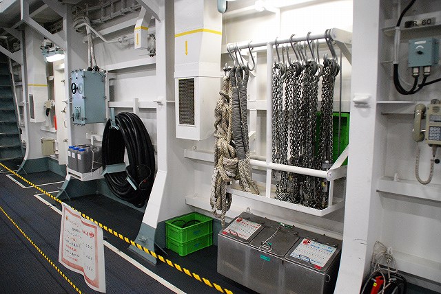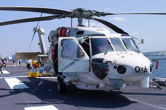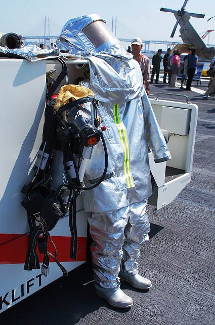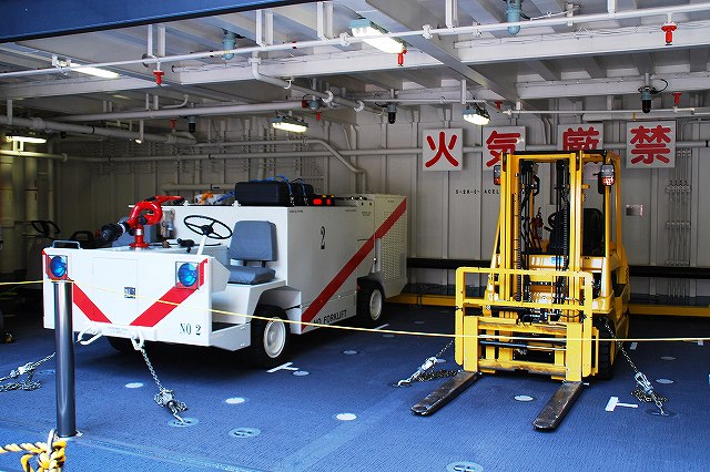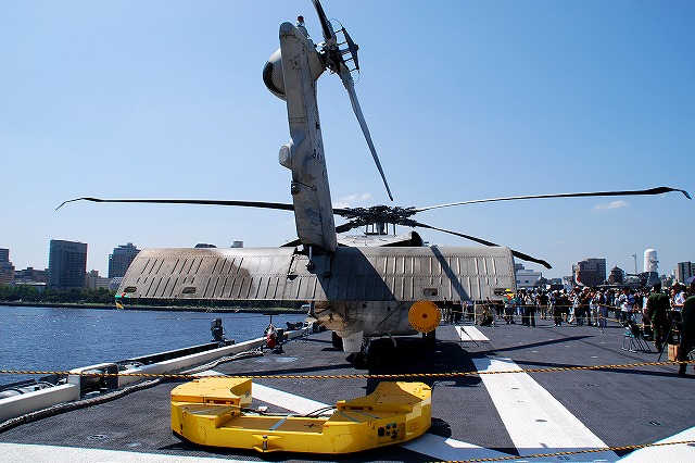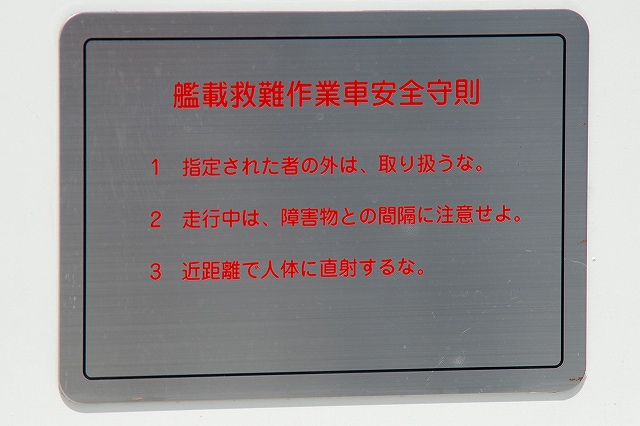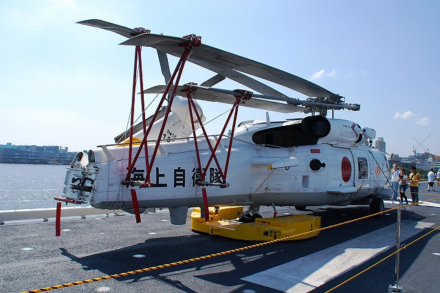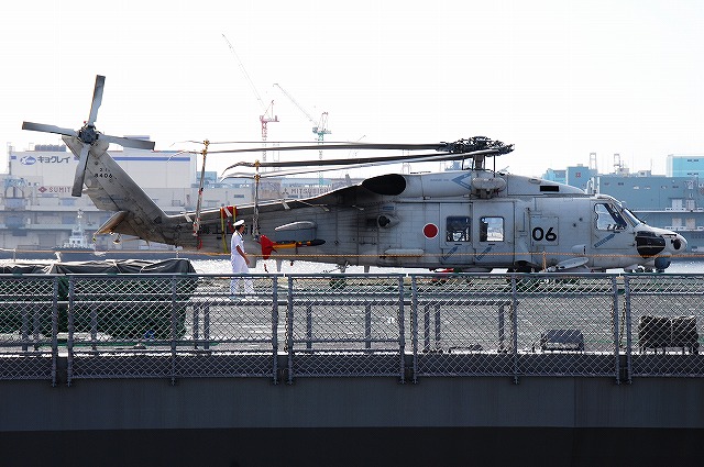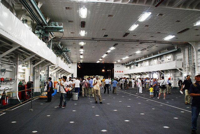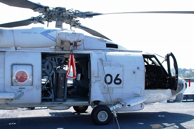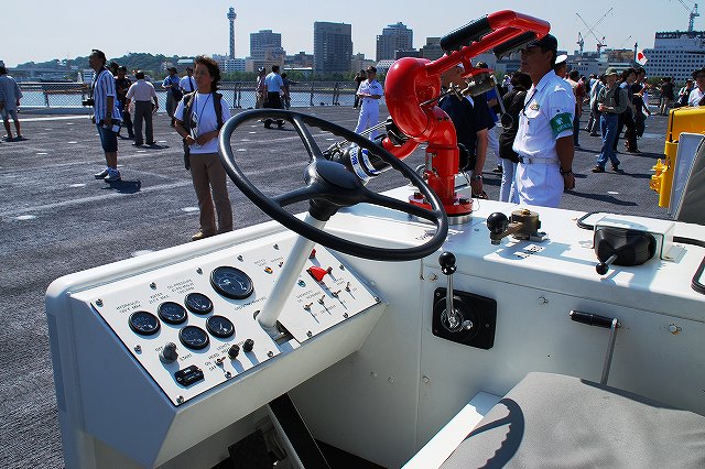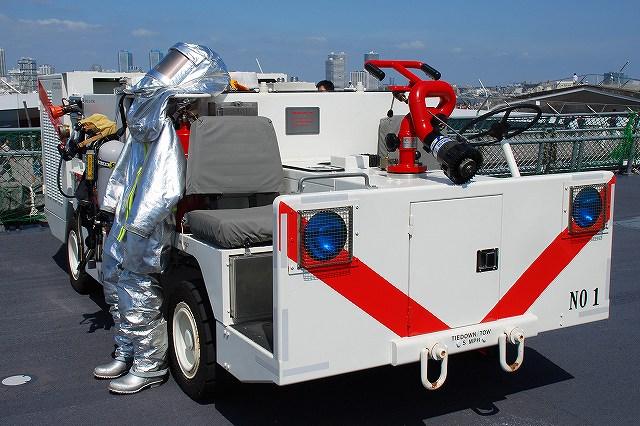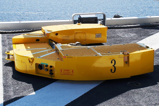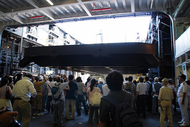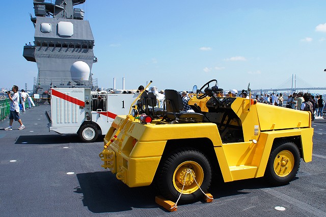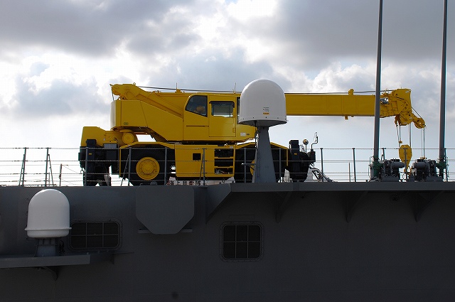 (左)公開が開始された直後の、飛行甲板にそれほど人がいないうちに…とまずは一枚。 画面右奥の吊橋はおなじみ横浜ベイブリッジ。 (中)見学者は舷門からではなくこのランプドアより出入するコースだった。 (右)格納庫甲板→第2プラットホーム(後部の航空機用エレベーター)で飛行甲板へ→第1プラットホーム(前部のエレベーター)で格納庫甲板へ…と言うコースだった。 まずは第2プラットホームが下りてくるのをまって乗り込む。 第2プラットホームで飛行甲板へと上がる。 遂に海自も ここまで 来ましたか~ o(^o^)o (上)第2プラットホームが下降した後にポッカリと空いた大穴。 周辺には転落防止用のネットが張られているが、あくまで一般公開用に仮設した物のよう。 上部構造物の後部には航空管制室が有る。 (中)飛行甲板後部に置かれていた、ハンドリングトレーニング用のSH-60J「ひゅうが181」 (下)飛行甲板前部には、現役の機体であるSH-60Kを展示。 後部の弾薬用エレベータの上に展示されていた、97型擬製魚雷(97式短魚雷の模擬弾)。 (左)クレーン車 (右)甲板後部に配置されたMk.41 VLS (16セル)。シースパローとアスロック用のよう。 (左)ハンドリングトレーニング用のSH-60J「ひゅうが181」 (中)機首と垂直尾翼には「ひゅうが181」と記されていた。 181は「ひゅうが」の艦番号。 (右)機体に描かれていた「ひゅうが」のエンブレム。 (左)飛行甲板前部に展示されていたSH-60K。 SH-60KはSH-60シリーズに日本独自の改良を加えたタイプで、機体が大型化し各種能力が向上している。 つか、この#06は7月の護衛艦「ああなみ」公開@名古屋港のときに撮影したものと同じ個体だと、写真を整理していて気が付いた(^。^;) (中)ホイストに救助時の吊り上げに使う機材が装着されていた。 (左)SH-60Kの後部に置かれていたコレは、航空機の牽引に用いるハンドラーと呼ばれる装置で、SH-60J及びKは尾輪に、MCH-101は前輪に直接装着して使用する。 動力は電動(充電式)。 (中・右)より大型のMH-53Eは、陸上基地でも使用するような牽引車にて移動させるよう。 (左)米空母でも使用しているタイプの消防車。 (中)「外車」なので左ハンドル。 (右)耐火服など各種装備 (左)「艦載救難作業車」…って言うのね (右)英語で記された注意書きのプレート つづく