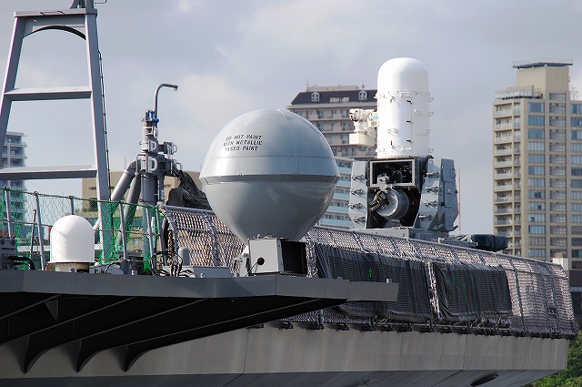 (左)飛行甲板艦首右舷よりに設置された20mmCIWS。もう1機艦尾右舷よりの一段低い位置にも設置されている。 一般公開中には操砲展示も実施された。 「ひゅうが」型は「主砲」を持たない「護衛艦」である。 (右)光学サイトのレンズにベイブリッジが映り込む。 (左)「ひゅうが」の上部構造物は、艦橋等の前楼と2本の煙突、航空管制室等の後楼が一体となったもの。 それらの4面にはFCS-3多目的レーダーのフェイズドアレイアンテナが装着されている。 (右)今回の公開では、格納庫甲板を除く艦内は非公開だったが、上部構造物の飛行甲板と同じ階に有るお手洗いは利用できたため、そこへと至る通路を撮影(^。^;) (左)キャットウォークですよ奥さん! キャットウォーク! (謎) (中)一般公開中に「ひゅうが」周辺を警備していた船艇その1。 海保15m型(高速)巡視艇CL01「いそかぜ」。老朽化した巡視艇を代替すべく計画されたが、船型が小形に過ぎたため2隻のみの建造で終った巡視艇。 …と言うことで先日お台場でCL02「はやかぜ」を撮影しているので、期せずして前2隻をコンプリートです(^。^) (右)その2、神奈川県警の警備艇「ゆり」。 船首部分にお巡りさんが立ってなにやら合図しているのは、「ひゅうが」に接近しすぎたプレジャーボートに退去を促す為。 艦首寄りの第一プラットホームに乗り格納庫甲板へと下りる。 (左)格納庫甲板艦首寄りに置かれていた艦載救難作業車とフォークリフト。 (中)格納庫甲板はこんな感じ。 グッズなどの販売も行われていた。 (右)第2プラットホームが下がってくるところを皆で見上げる。 プラットホームが上がってる時と下がっている時では、格納庫甲板内の明るさが結構違ってくる。 (左)プラットホームの側には管制室のようなものが作られていた。 (中)航空機を固定するチェーン等が壁にかけられていた。 (右)「ひゅうが」の「公用車」とストレッチゃー等。 山下公園を歩きながら撮影。 判り難いけど「いせ」の隣には「しらね」型護衛艦がドック入りしており、チョット苦しいけど新旧ヘリコプター搭載護衛艦の並びを撮影することが出来た。 最後になりましたが、当日お世話に成った皆様有難う御座いました。 ・DDH181 ヘリコプター搭載護衛艦 ひゅうが 規準排水量:13,500t (推定満載排水量19,000t) 全長:197m 全幅:33m 高さ:48m 喫水:7m 機関:ガスタービン×4基 出力:100,000ps 速力:30kt 兵装:Mk.41VLS×16セル/ 3連装単魚雷発射管×2基/20mmCIWS×2基 艦載ヘリ最大搭載数:10機 乗員:約360名