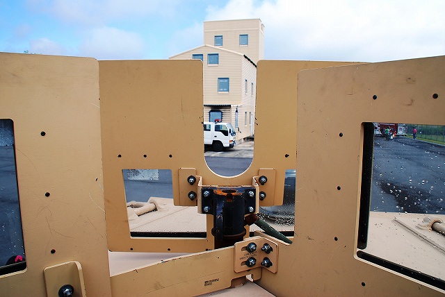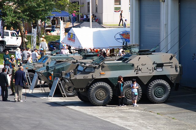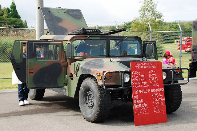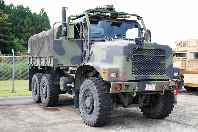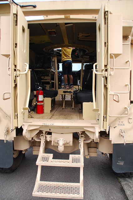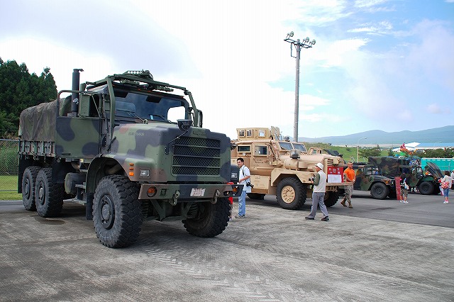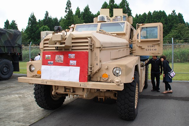 (左)先ずは米海兵隊より展示されていた各種車両などから… (中・右)通常のカーゴトラック そしてこちらが、今回の(ワタシ的)メインなMRAP(Mine Resistant Ambush Protected・エムラップ=耐地雷待ち伏せ防護)装甲車の一種。 (左・中)イラク及びアフガニスタンで使用するため急遽大量に調達されたMRAP装甲車は、メーカーだけでも7社有る為様々なバリエーションが有るが、後日この写真を友人に「鑑定」してもらったところ、当該車両はフォースプロテクション社製のクーガーHと言うタイプではないか?とのこと。 MRAP装甲車は大きく分けてカテゴリーIからIIIの3タイプがあり、本車は一番小形のカテゴリーIに分類される車両のよう…と言っても充分ゴツいんですけど! カテゴリーIのMRAP装甲車は、偵察・パトロール等に使用されるそう。 (右)MRAP装甲車の特長の一つが、地雷の爆発により車体が吹き飛ばされるのを防ぐ為、爆風を受け流すように車体底部が三角形状の形をしていること。 これにより、重装甲と相まって車体が大型化している。 そんな、最新かつ重要な装備と思われる車両なのに、車内は公開され、撮影も全く自由だったのはさすが米軍と言うべきか… (左)キャブはこんな感じ。助手席の端末が今時な装備っぽい。 運転席前面の液晶モニタは、ボンネット先端部にある(暗視?)カメラの映像を見ながら運転する為?? (中)後部のハッチより車内を見る。 車高が高い為乗り降りには梯子が必要。 (右)後部の車内はこんな感じ。運転席を含めた定員は6名のよう。 まるで高級スポーツカーのようなシート&シートベルトは、やはり地雷対策か? 銃座にも上がる事が出来た。 防楯の一部に防弾ガラスが使用されているので、意外と視界は良い。 (勿論車体の窓も防弾ガラス) (中)このジョイスティックのようなものは、防楯の旋回用かな? 防楯の外にバックミラーが付いていた。 (右)防楯の防弾ガラス越しに、隣に展示されていたハンビーなどを望む。 こちらは通常型のハンビー。 (左・中)従来のジープ系車両を代替すべく開発され広く米軍で使用されている車両で、この4人乗りタイプが基本形。 (右)床のラック状の物は、弾薬箱等を固定するためのもの。 置かれている赤い箱は、グレネードランチャー用の40mm砲弾のものを流用した工具箱? (左・中)こちらはカーゴトラックタイプのハンビー。 (右)ボンネットの中はこんな感じ。 155mm榴弾砲M198 (左)オイルが垂れるからか、砲身の下は歩かないよう注意の看板が出ていた。 キャンプの消防車等も展示されていた (左)奥の車両は「エンジン」つまりポンプ車で、手前の車両は「タンカー」つまり水タンク車。どちらも米国製の車両のよう。 (右)このランクルは指揮車かな? (左)展示エリア外にいた「エンジン」。 こちらは国産車(いすゞのシャシーを利用したモリタ製)だった。 (右)こちらも展示エリア外にいた米国製らしい救急車。 急病人の発生に備えて待機していたよう。 つづく。