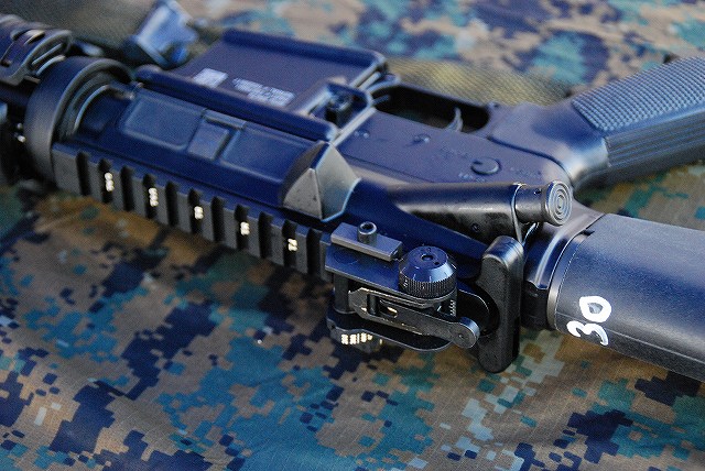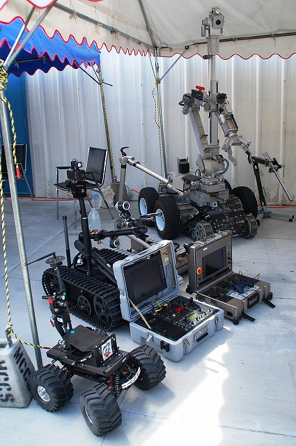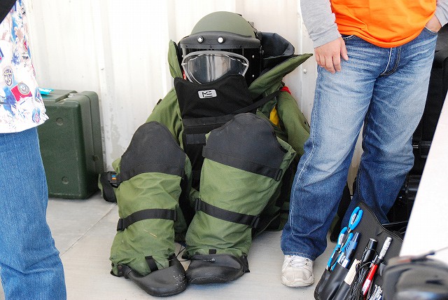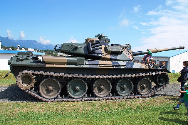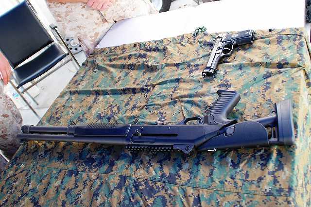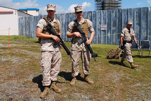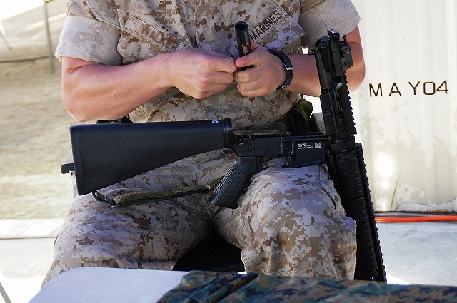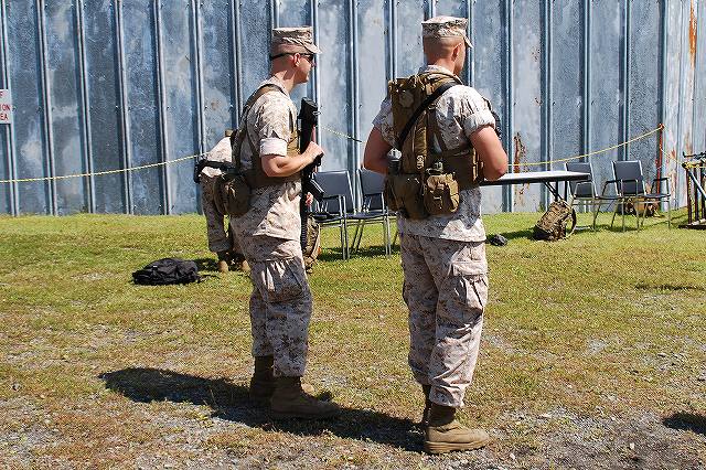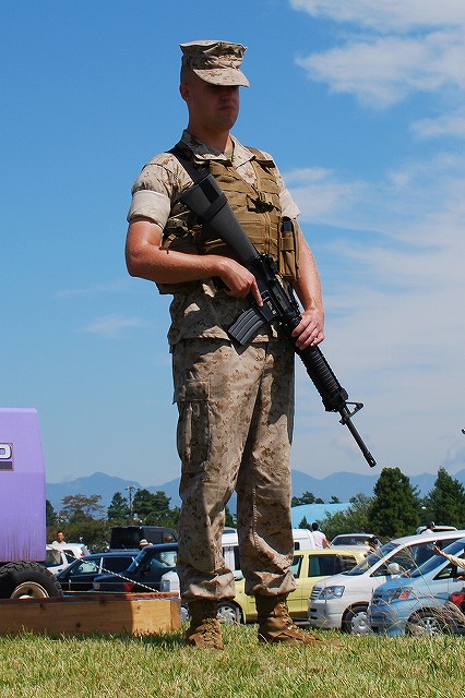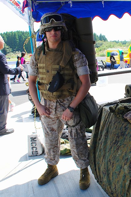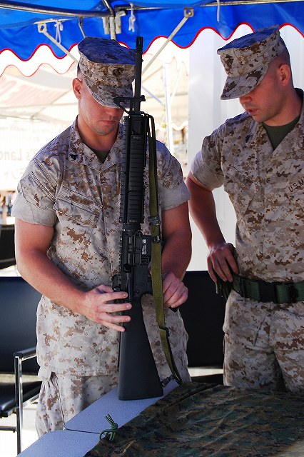 キャンプ富士に隣接する陸自滝ヶ原駐屯地より、各種装備が展示されていた。 (左)軽装甲機動車 (中)96式装輪装甲車 (右)82式指揮通信車 いずれも普通科教導連隊の所属車両。 3色迷彩の74式戦車 (左)滝ヶ原駐屯地に所在し、演習でアグレッサーを務める評価支援隊の所属車両。 (中)最初は通常の迷彩+黒かな?…と思っていたけど、改めて転輪の部分に塗られている塗装と比較すると、茶色の部分が通常よりも明るいように見える。 (右)お約束のジャングルジム状態の写真しかないのはご勘弁ね。 (左)サーチライト内部のシャッターが開いた状態は始めて見たかも? (中)迷彩塗装はスプレーではなくハケか何かで塗ったよう。工具及び工具箱は通常のOD色。 ペリスコープや照準機には手製と思われる遮光板が付いている。 (右)西洋のドラゴンが赤い星を掴んだデザインの部隊マーク。 陸自からはヘリも展示されていた。(米軍機の参加は無かった) (左)UH-60JA (右)OH-1 海兵隊の銃器等も展示されていた (左)バレットM-82A1アンチマテリアルライフル(対物ライフル)。 重機関銃にも用いられる12.7mm弾を使用するライフル。重さは22kgだそう。 (中)原型を殆ど留めないまでに魔改造されたM-14。 7.62mm弾を使用する旧式のアサルトライフルだが、今日でも狙撃銃として使用されている。 銃身の下に置かれているのはバレットのマガジンと12.7mm弾 (右)ベネリM3(ショットガン)とベレッタM9(自動拳銃) M16A4 (左)従来のA2タイプに替わって配備が進んでいるM16シリーズの最新バージョン。 ハンドカードは4面とも20mmレールシステムになっていて、各種デバイスが装着可能。 動作はセミ/3点バースト切り替え式。 (右)M16シリーズの特長であるとともに欠点とも言われていたキャリングハンドルは、A4では着脱式になっている。 展示されていた銃ではキャリングハンドルは取り外されており、替わりに20mmレイルにフリップアップ式のリアサイトが装着されていた。勿論スコープ等各種デバイスを装着することが可能。 (左)テイクダウンしてボルト部分を整備中? (右)組み立て終了。 (左)大き目のバックパックを背負って見せてくれた。 (中)爆発物処理用のロボット各種 (右)会場の隅で体育座り(^。^)していた防爆服。 会場を警備していた海兵隊員。 (左)砂漠用のマーパット(ピクセル)迷彩服の上から、従来のガンベルト+サスペンダーに替わり、ベスト状ものを着用している人が多かった。 (中)後から。 右側の人はキャンティーン(水筒)+ハイドレーション(キャメルバック)という「重装備」。 (右)撃つ瞬間まで引き金には指をかけない。 駐屯地祭等での装備品展示やガンショップ等でこれを守れていない人をよく見かける。あと、銃口を人に向けたり覗き込んだりとか(^。^;) 当日お世話に成った皆様有難う御座いました。