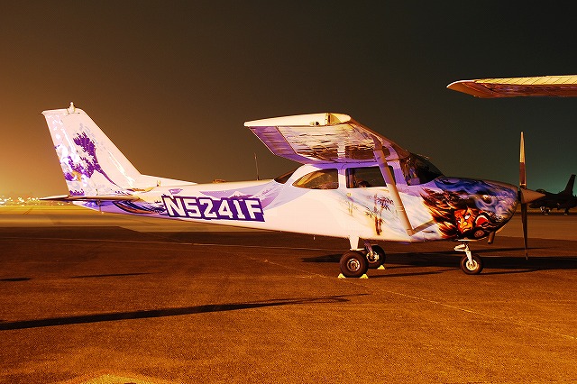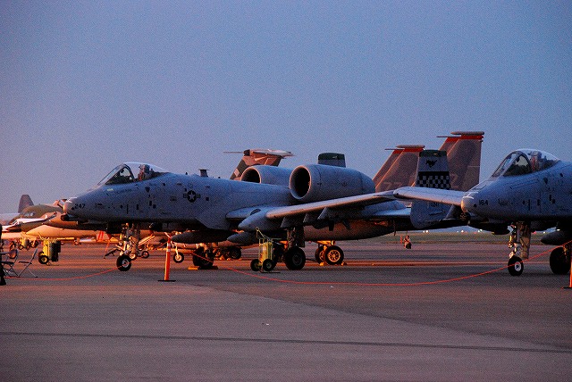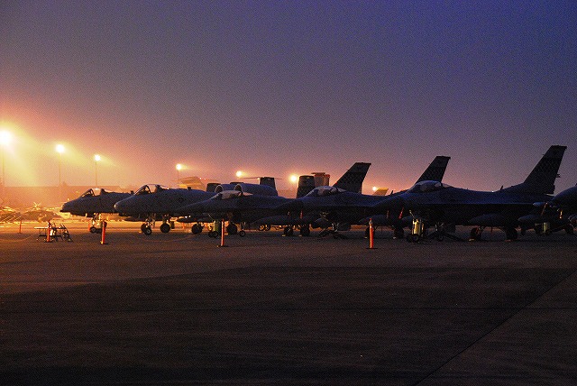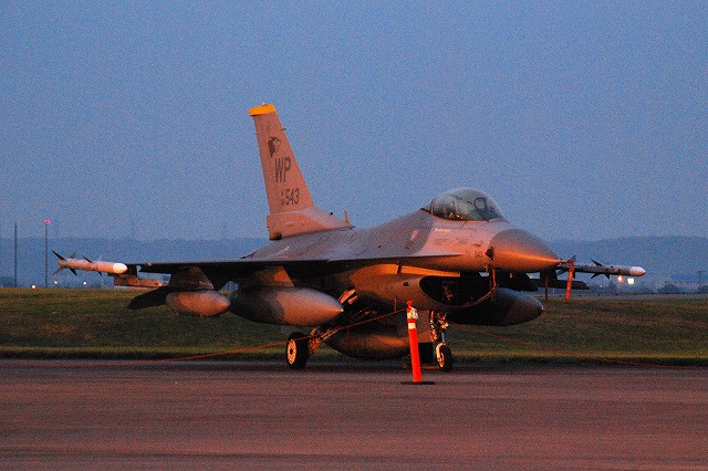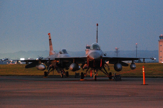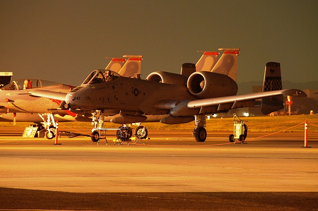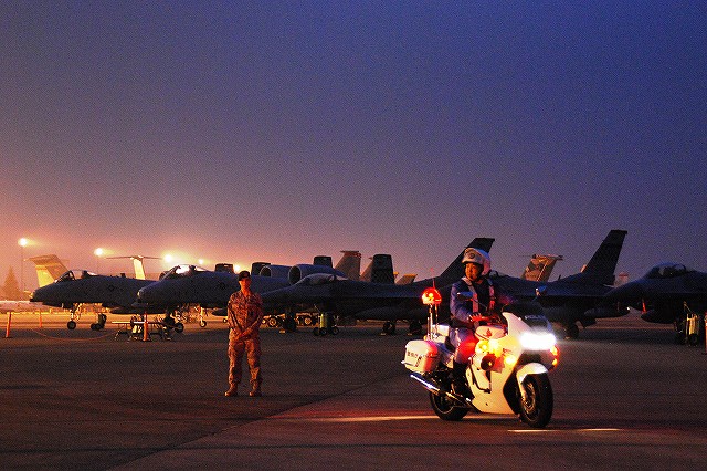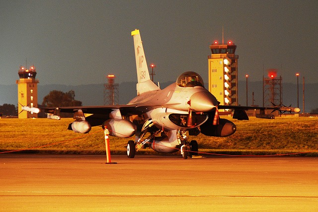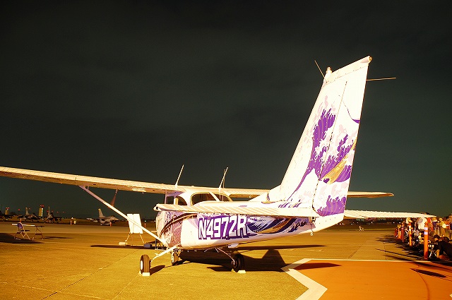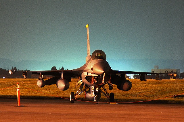 暗くなってきた頃合で、このために持参してきためったに使わない三脚と、新たに購入したカメラ用のリモコンを取り出して、バルブ撮影なんぞを始めてみる。 暗くなりきる前のこの時間帯の方が、藍色の空とナトリウム灯のオレンジ色の光に照らし出された機体とのコントラストが一番美しいかも …って、折角三脚とか使っているのだから、もっとスローシャッターにして感度下げれば良かったな~ 日没と前後して、航空機展示エリアは閉鎖される為、警視庁の白バイとワゴン車が空軍の憲兵隊と協力し、観客の「追い出し」を行っていた。 「追い出し」が終了する頃にはほぼ真っ暗に。 当然ながら、これらの写真は立ち入り可能エリアから撮影したものです。 立ち入り可能区域(イベントエリア)寄りに置かれていたF-16が、必然的にメインの被写体になる。 基地の飛行クラブが所有するセスナ。 昨年はシャークマウスのみの大人しい(?)塗装だったが、今年はねぶた塗装(??)へと全面的に塗り替えられていた。 ナトリウム灯の光が霞んで写っているのは、その煙のせい? それはともかく、我々も米軍基地名物のステーキにて夕食としたのち、撤収しました。 最後になりましたが、当日お世話に成った皆様有難う御座いました。