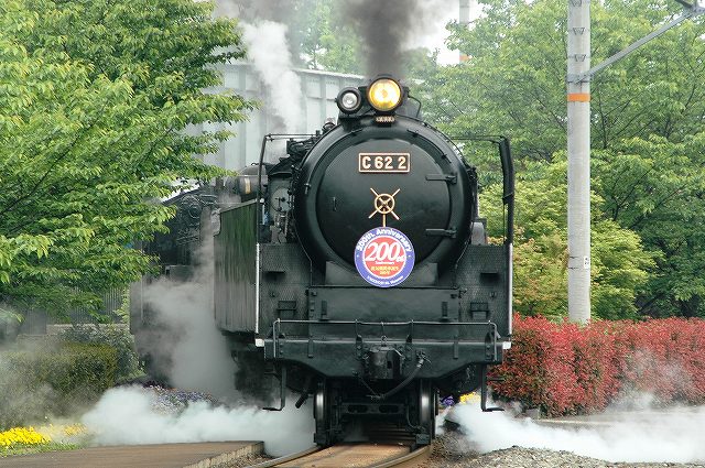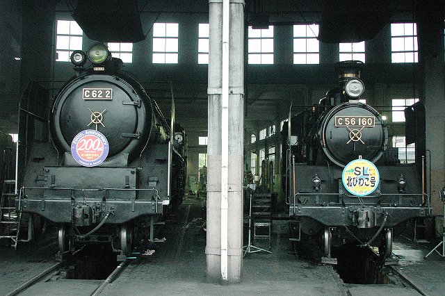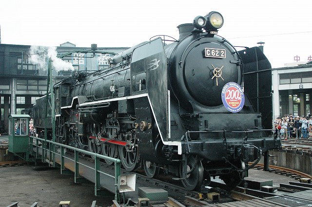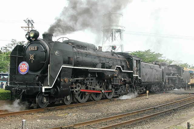 蒸気機関車生誕200周年記念のヘッドマークをつけ、後部にD51 200を従えた重連にて「SLスチーム号」を牽引するC62 2号機。 C62 2号機はデフレクタにつばめのエンブレムが取り付けられており、スワローエンゼルの愛称で親しまれていた。 (中)転車台に乗ったC62 2 (右)機関庫に収まったC62 2。 隣にいるのはSL北びわこ号牽引の為整備中のC56 160。 C62は主に特急列車用に1948年から1949年の間に49両が製造された日本で最大・最強の蒸気機関車です。 PR