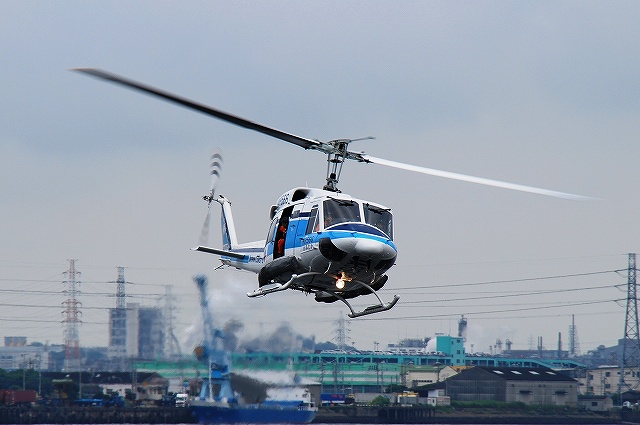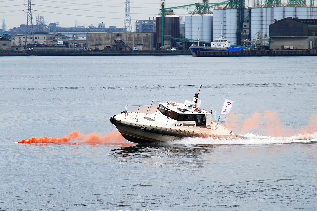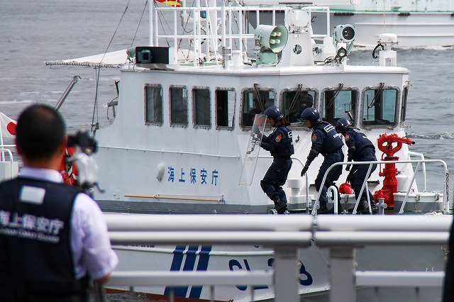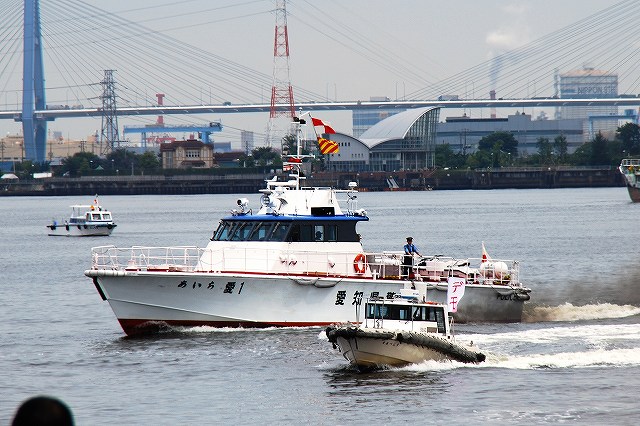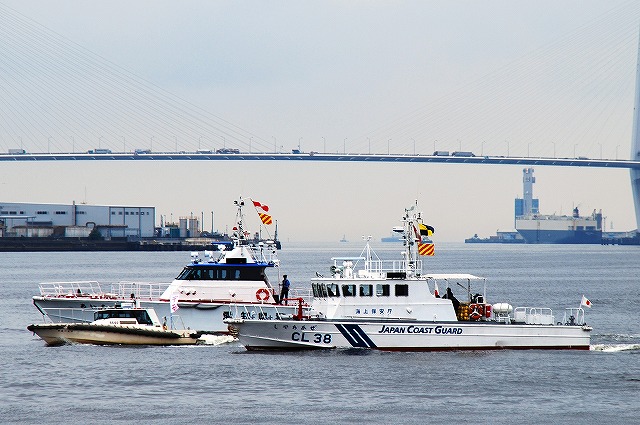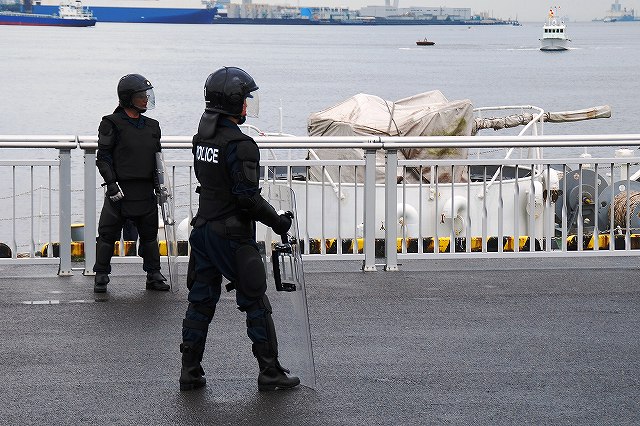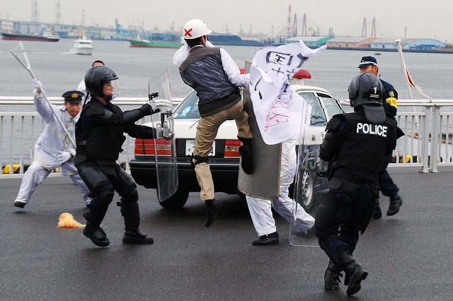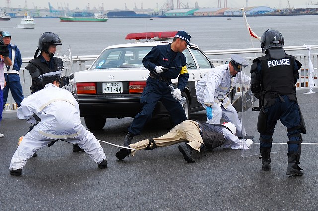 (左)テロリストが投擲した不発の爆発物を回収する、爆発物回収班の車両。 (右)人質をとって立て篭もっていたテロリストが連行されてきた。 (左)貨物船S号は出港停止処置がとられ、埠頭は愛知県警の機動隊などにより封鎖された。 (右)沖合いを警戒する愛知県警の警備艇「あいち」 船上には海保特警隊員の姿が見える。 (左)S号の開放を求め現れたX国支援者によるデモ隊(と言っても一名でしたが)が、規制線を越え警官隊に突入! (右)制服警官の刺股に足を取られる等して検挙された。 訓練の最後に海保ベル212「かみたか」が登場 海保ヘリは、X国支援者の乗る抗議船(海保監視取締艇「さぁぺんす」)を捕捉・追跡すると言う役割だった。 (右)ヘリより投下されたマーカーより赤い煙が出ている。 (左)海保巡視艇「しゃちかぜ」により針路規制される抗議船 (右)愛知県警「あいち」と海保「しゃちかぜ」により挟み撃ちにされる (左)停船した抗議船 (右)制圧の為抗議船に乗り移らんとする海保特警隊員。 この後抗議船が制圧され一連の訓練は終了しました。 |