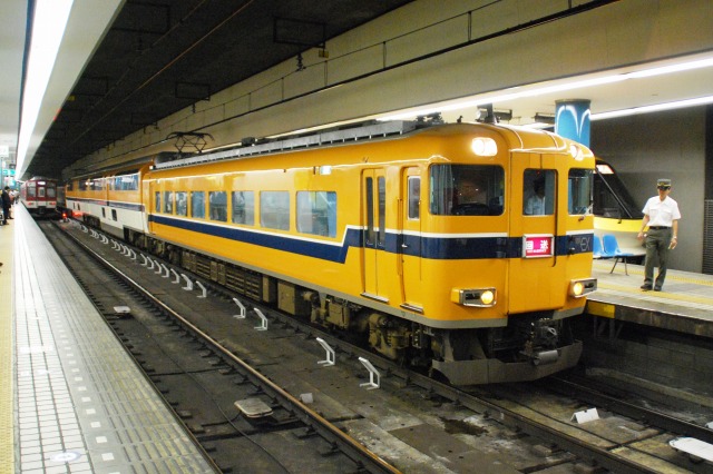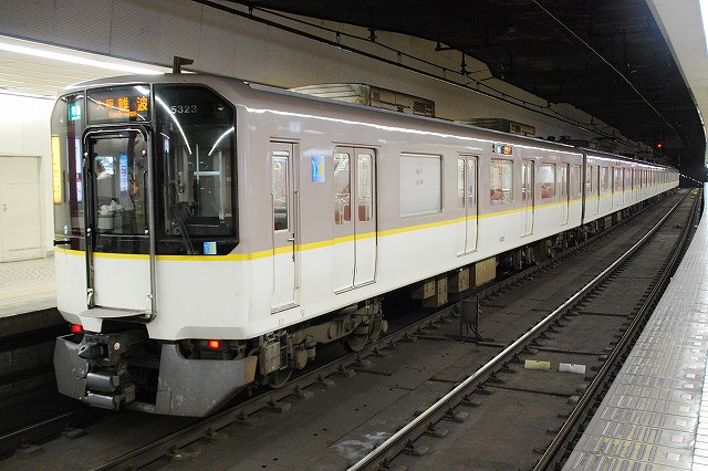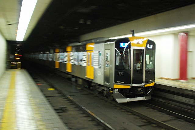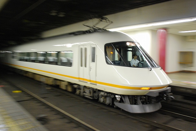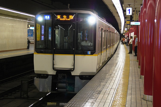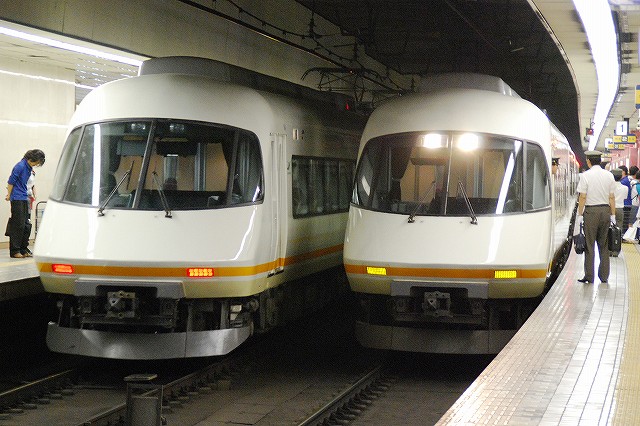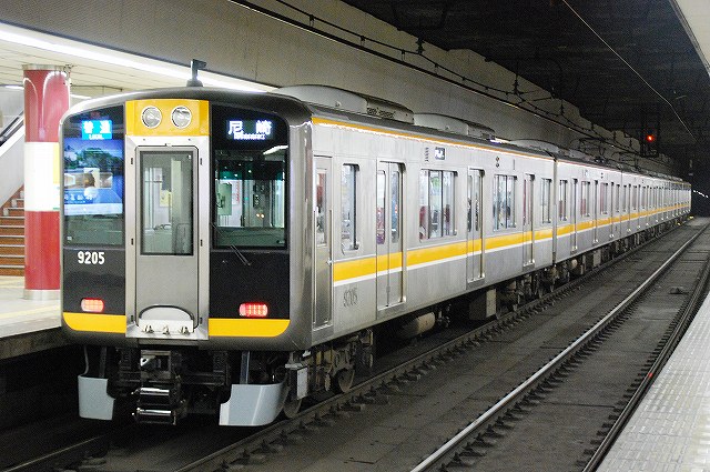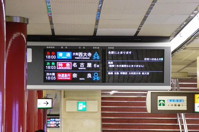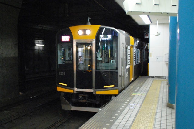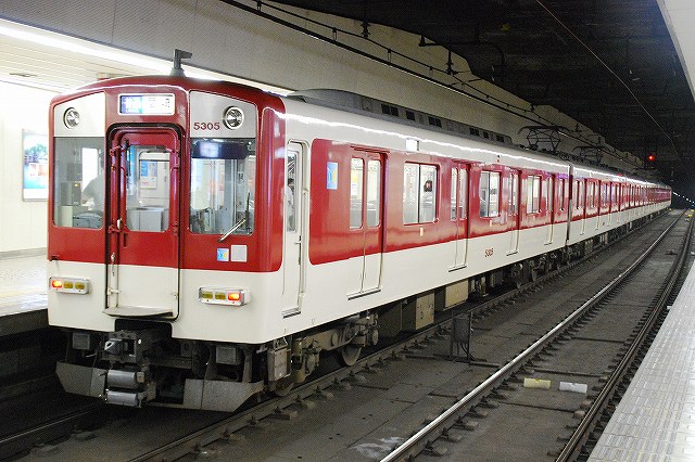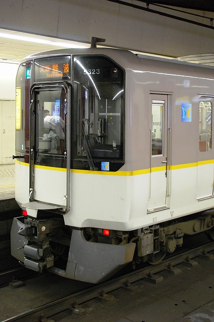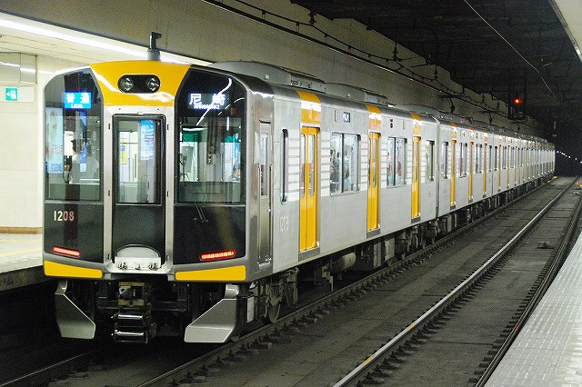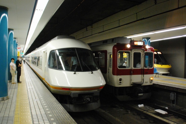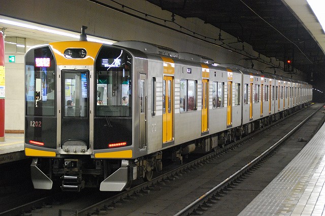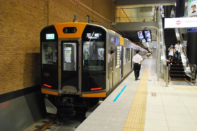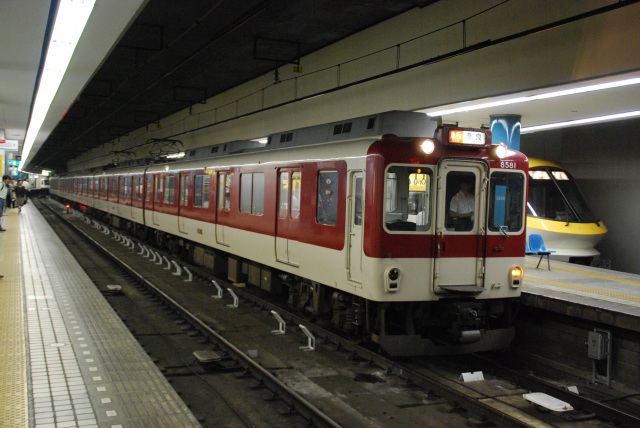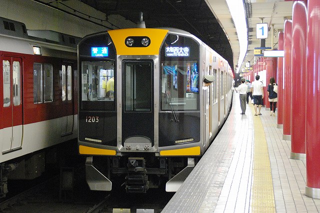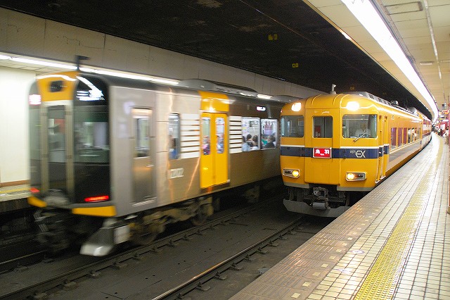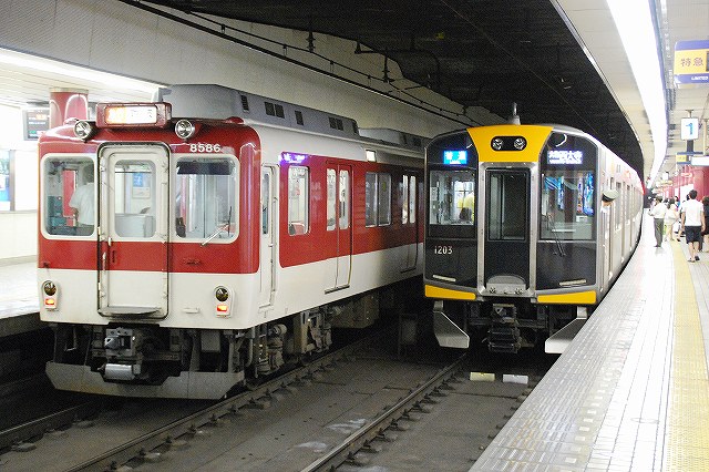 ・阪神ドーム前駅 一部が吹き抜け構造となっている駅の壁面にはレンガか積まれている。 かつてこの地に建っていた大阪ガスの本社がレンガ造りだったことに因んでいるそう。 (左)阪神1000系@尼崎行き区間準急。 区間準急は阪神-近鉄の直通運転開始に伴い新設された種別。 (右)近鉄シリーズ21@大和西大寺行き準急。 意外なことに、地下鉄などを介せず大手私鉄同士が直接相互乗り入れを行うのは、日本では今回が初めてのケースだそう。 ・近鉄大阪上本町駅 阪神-近鉄の直通運転開始時より、難波駅同様駅名に「大阪」がついている。 (左)阪神車:全長18m 3扉 近鉄車20m 4扉…と言う事で。阪神車用と近鉄車用、2種類の停止位置及び乗車位置の表示がある。 線路の間に置かれている黄色い「H10」が阪神車用、赤い「10」の物が近鉄車用の停止位置(それぞれ10両編成用)。 ホームに有る△印が阪神車用、○印が近鉄車用の乗車位置。 (右)なので、次の列車の乗車位置マークの表示を見れば、どちらの会社の電車が来るかすぐわかって便利(^。^)。 (左)阪神9000系@尼崎行き普通。 阪神大震災後の車両不足を補うために急遽製造された形式だが、今回近鉄乗り入れ用に抜擢され各種改造が成された。 外観としてはそれまで赤だった帯をオレンジへ変更した事や、なんば線~近鉄線内の増結運転に備え、奈良方の先頭車の貫通扉を拡大し幌枠を設置及び連結器の交換等が有る。 (中・右)阪神1000系@大和西大寺行き普通と近鉄8500系が並ぶ 1000系は近鉄への直通運転開始を睨んで増備された新形式。 (左)大阪難波行きアーバンライナー到着。 (右)名古屋行きアーバンライナーと並ぶ。 阪神1000系@尼崎行き普通が到着 (左)神戸方先頭部のスカートは左右繋がっているが… (右)奈良方線頭部のスカートは増結対応の連結器を装備しているため、左右に分かれた形状をしている。(9000系も同様) 阪神1000系@三宮行き快速急行が到着 (左)近鉄30000系「ビスタEX」@鳥羽行き特急と並ぶ。 ビスタカーと阪神電車の並びが見られる日が来るとはねー。 近鉄の阪神乗り入れ対応車には、先頭部運転台下部と乗務員室直後の戸袋部分に蝶を象った相互乗り入れ対応マークが貼られている。 帰りの特急が来る直前まで撮影して撤収しました。(^。^)