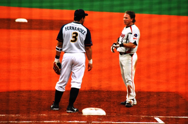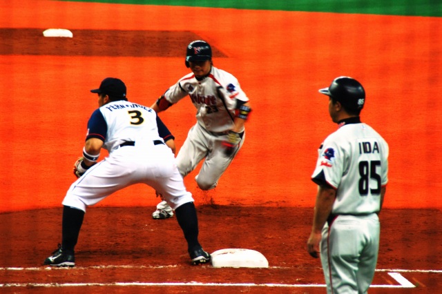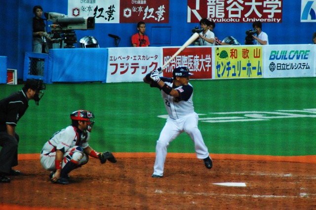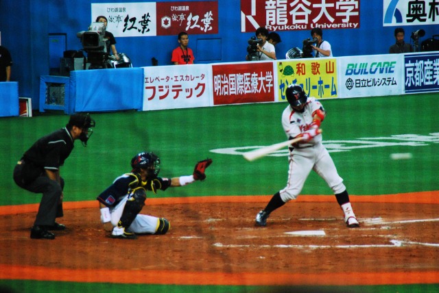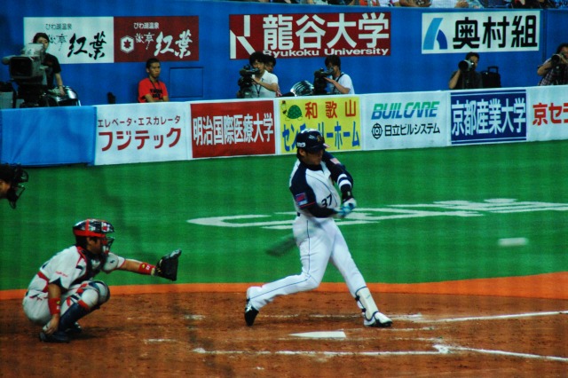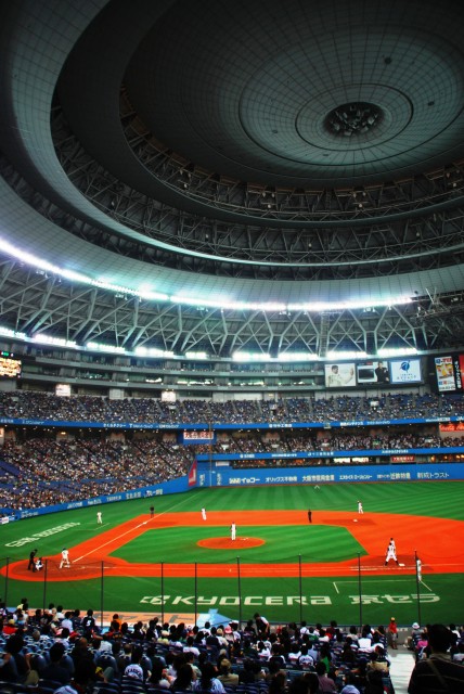 阪神なんば線開通で便利になった大阪ドーム(※)。 これまでは難波にて地下鉄に乗り換えるなどする必要があったが… (左)今は特急を降りたホームで、そのまま尼崎/三宮方面の電車を待てばよい。 (中)シリーズ21系列に押され気味だが、8000系列の車両もまだまだ頑張っている。 (右)ビスタEX。奥の1番ホームには伊勢志摩ライナーが居る この列車は回送だが、阪神なんば線の開通に伴うダイヤ改正により、それまでの難波駅の… 1番ホーム→特急(奈良/伊勢/名古屋方面) 2番ホーム→奈良線電車(普通~快速急行) …と言うホームの使い分けが崩れ、2番ホームからも特急が発着する事があるので注意が必要。 (左)程なく三宮行き快速急行@阪神1000系が到着。 (中)2区間の乗車であっという間にドーム前駅に到着。 河川や既存の地下鉄等を避けるため、地下5層と言うなんば線一深い駅になっているが、ホームから地上までエスカレーター等が完備されている。 (右)地上に出ればドームは目の前。 (左)つか、大阪ドーム来るの久しぶりやなー(^_^;) (中)この日のカードはオリックス×ヤクルト。 日曜日の交流戦と言う事で、意外と(失礼!)盛況。 (右)オリックスのマスコットネッピー君。 ネット越しでオートフォーカスが使えないためマニュアル撮影だけど、試合中の写真もチョット撮ってみる。 (左)帰塁する青木選手 (右)投手交代の合間に談笑する一塁手のフェルナンデス選手と走者ガイエル選手。 この日のオリックスは、ヤクルトスワローズに日本新記録の11打数連続安打等を含む猛爆を受け一時は12点差を付けられてしまう (~ヘ~;)。 投球が写りこんでるシリーズ インパクトの瞬間はなかなか撮れませんね~(^_^;)ゞ (左)2001近鉄リーグ優勝時の代打逆転点満塁サヨナラ優勝ホームラン男、北川選手が代打で登場。 (中)終盤オリックスは追い上げを見せ、メジャー帰りの大ベテラン木田投手が登場するも勢いは止まらず… (右)4点差で9回裏2アウト満塁…と言う、1発出れば同点の場面でヤクルトの押さえのエース林昌勇(イム チャンヨン)投手をマウンドに引きずり出すに至った物の、結局14対10で敗戦。 ※大阪ドームは、ネーミングライツ制導入により現在は「京セラドーム大阪」と呼ばれているのは承知していますが、