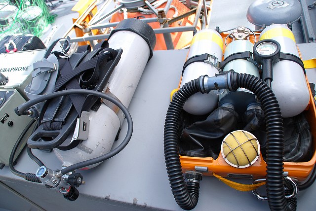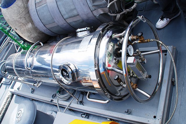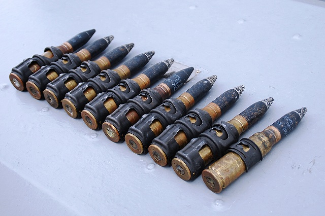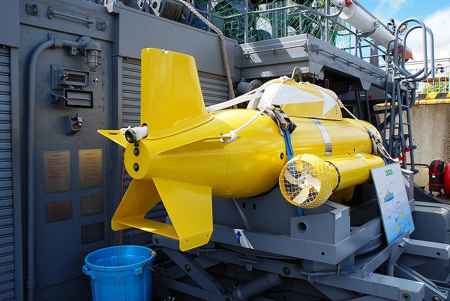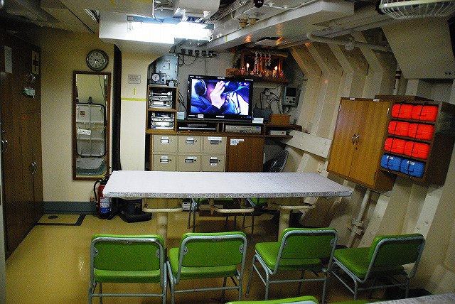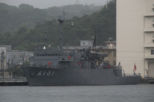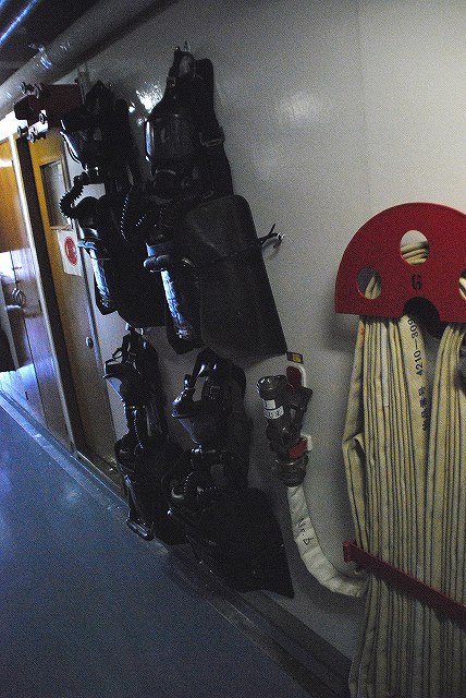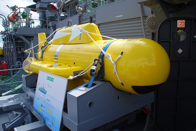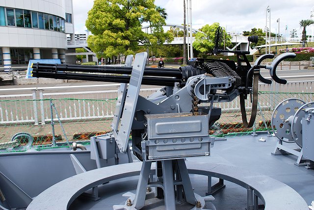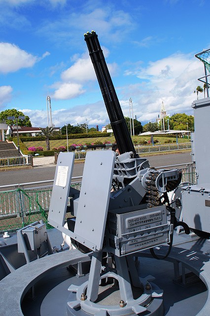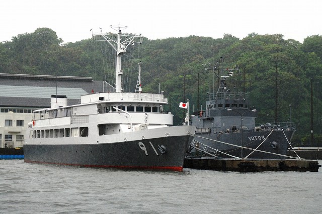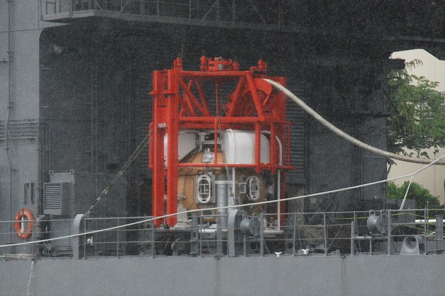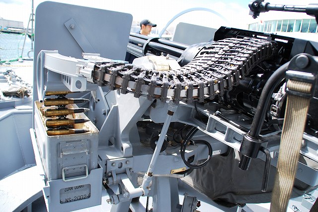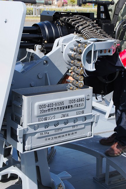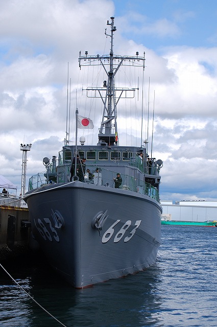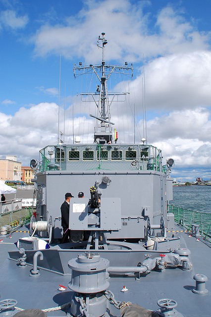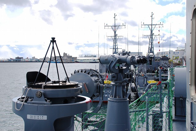 公開されていたのはNSC682「のとじま」とMSC683「つのしま」でした。 まずは「のとじま」より見学開始。 (左)前甲板に装備されている人力操作式の20mmバルカン砲。 水面に浮遊している、若しくは係維ワイヤーを切断し浮上させた機雷を射撃して処分するのに用いる。 (中)弾薬箱と給弾ベルト。模擬弾が装着されていた。 (右)20mm機関砲弾の模擬弾。自衛隊では劣化ウラン弾ではなくタングステン弾を使用している。 (左)「のとじま」のブリッジ (右)舵輪など (左)「のとじま」の食堂。 後方ビデオが流れるTVの横には神棚がある。 (右)暗い上に逆光で判り難いけど、後部甲板への通路の途中には、消火作業用の酸素マスクかけてあった。 (左)「のとじま」の機雷処分具PAP104航走体。 機雷処分に使用するおフランス製の水中ロボットで、「すがしま」型掃海艇はこれを2基ずつ搭載しており、公開されていた両艇では1基ずつPAP104が展示されていた。 (中)操作は後部から延びている光ファイバーゲーブルを介して行う。万が一ケーブルが切れた場合は自動的に浮上してくるようになっており、その際は無線操縦等によって回収する。 (右)「のとじま」後部より「つのしま」を撮影。 (左・中)フロッグマン(ダイバー)が使用する各種装備が展示されていた。 場合によっては人が潜って機雷処分の作業をすることが有るそう。 (右)潜水症の治療に用いる減圧タンク。…なんともタフな職場だと思う。 つづいて「つのしま」を見学。 (左)船首近くまで立ち入れたので、こんな写真がとれた。 (右)「すがしま」と「のとじま」。 「すがしま」の方は公開されていなかった。 後部甲板にはPAP104以外に各種掃海具が装備されているのがわかる。 (左)「つのしま」の20mmバルカン砲。 最大でここまで上を向く。 (中)弾薬箱のレタリング (左)艦橋前部より、「つのしま」前甲板ごしに「すがしま」と「のとじま」を望む。 (右)艦橋ウイング部分のコンパスや双眼鏡等。 以前から居たレールバスに加え、元JRのものと思われる保線車両(マルタイ?)が増えていた。 「すがしま」型掃海艇は、湾岸戦争後の掃海作業の教訓を踏まえ、装備の近代化等によって機雷掃討能力の向上を目指し建造された。 戦後60年を経た今日でも年関数件の機雷処分作業が有ると言い、貿易立国である日本の根幹をなす水上輸送路の安全確保のため掃海部隊の重要度は高い。