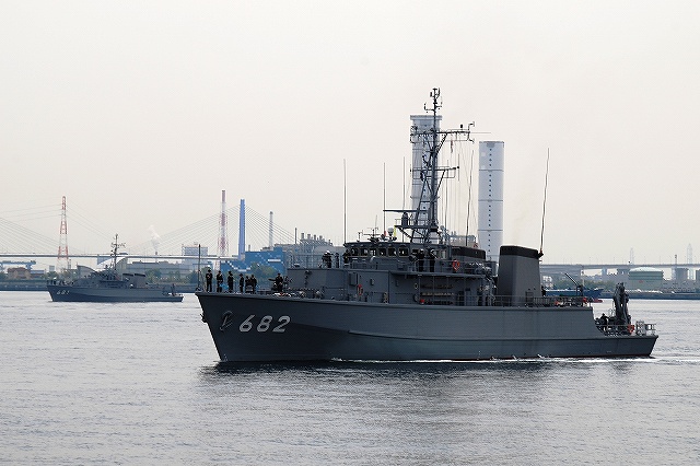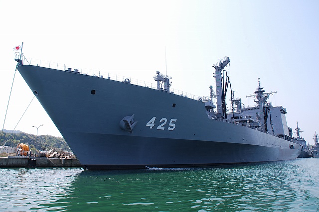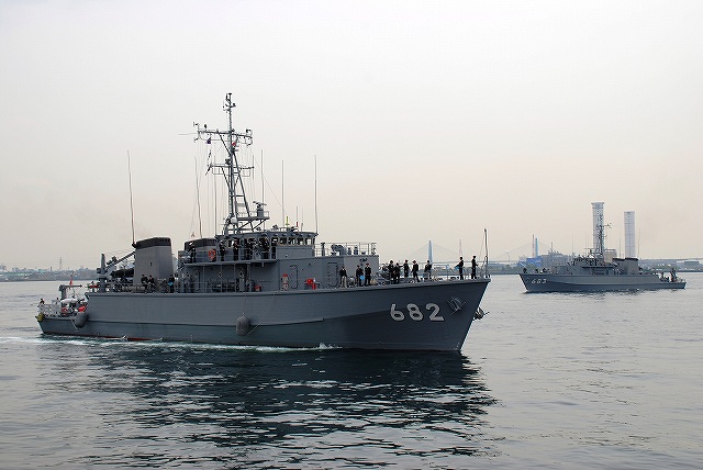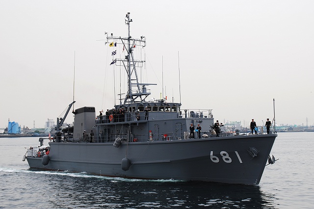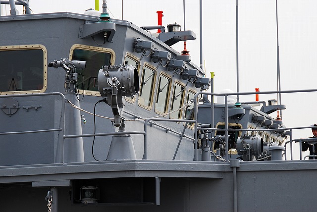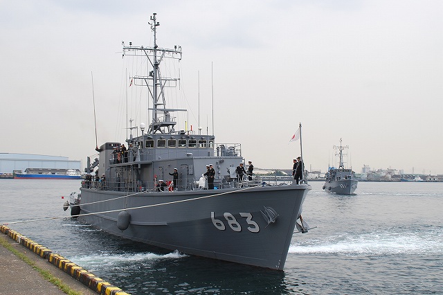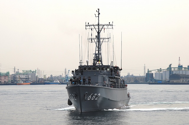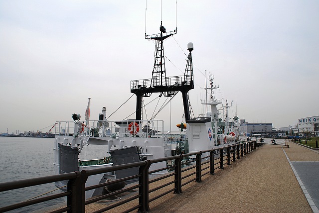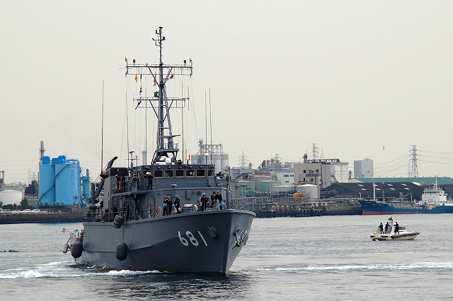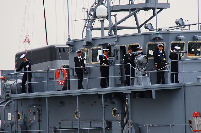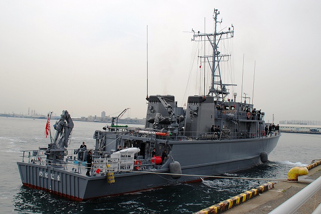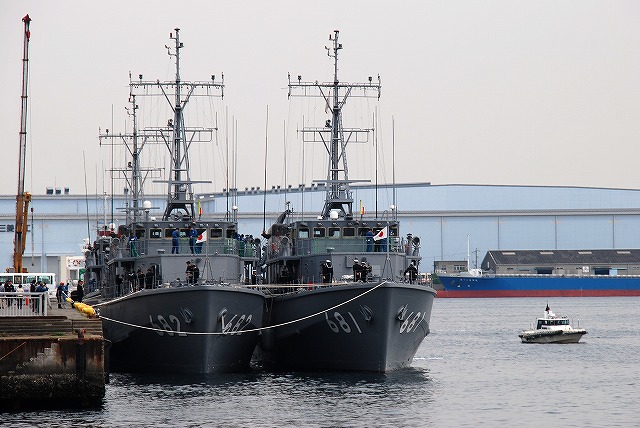 2月に入港したのと同じ第41掃海隊の掃海艇、MAC681「すがしま」/NSC682「のとじま」/MSC683「つのしま」の3隻。 4/25-26の両日は、一般公開が予定されています。 1230過ぎに現着すると、既に3隻ともガーデン埠頭沖に姿を現していた。 MAC681「すがしま」を待たせ、まず最初にNSC682「のとじま」が接岸する。 (左)MSC683「つのしま」が続いている。 (中)チョット苦しいけど「のとじま」「つのしま」「すがしま」の3隻が写っている。 (右)接岸直前の「のとじま」。 (左)順番待ち中の「すがしま」。傍らにいるのは警備に出てきた海保「おりおん」型監視取締艇SS60「さぁぺんす」。 (中)「つのしま」の艦首に国旗を掲揚。 (右)「つのしま」と「すがしま」 (左)最後に接岸した「すがしま」 (中)「すがしま」は「のとじま」とメザシで接岸。…つまり前回と同じ配列です。 (左)毎度御馴染み愛知地本のパジェロ (右)警備をしていた海保「さぁぺんす」 デッキに出ている隊員さんは透明の盾とフリッツタイプのヘルメット等を装備。 (左)名古屋港湾事務所の「翔龍」。 見学と思しき小学生を乗せて出港する所。 (右)名古屋港の港務艇「ぽーとおぶなごや2」 水族館側の埠頭より接岸した掃海艇を撮影。 長さ×幅×深さ:54.0×9.4×4.2 基準排水量:510t 主機/馬力:ディーゼル2基2軸/1800ps 速力:14kt 兵装:掃海装置一式・20mm機関砲1基 乗員:37名 水族館側の埠頭には熊本県立苓洋高校の水産実習船「熊本丸」が居た。 「熊本丸」は実習生14名を乗せ実習航海中だそう。